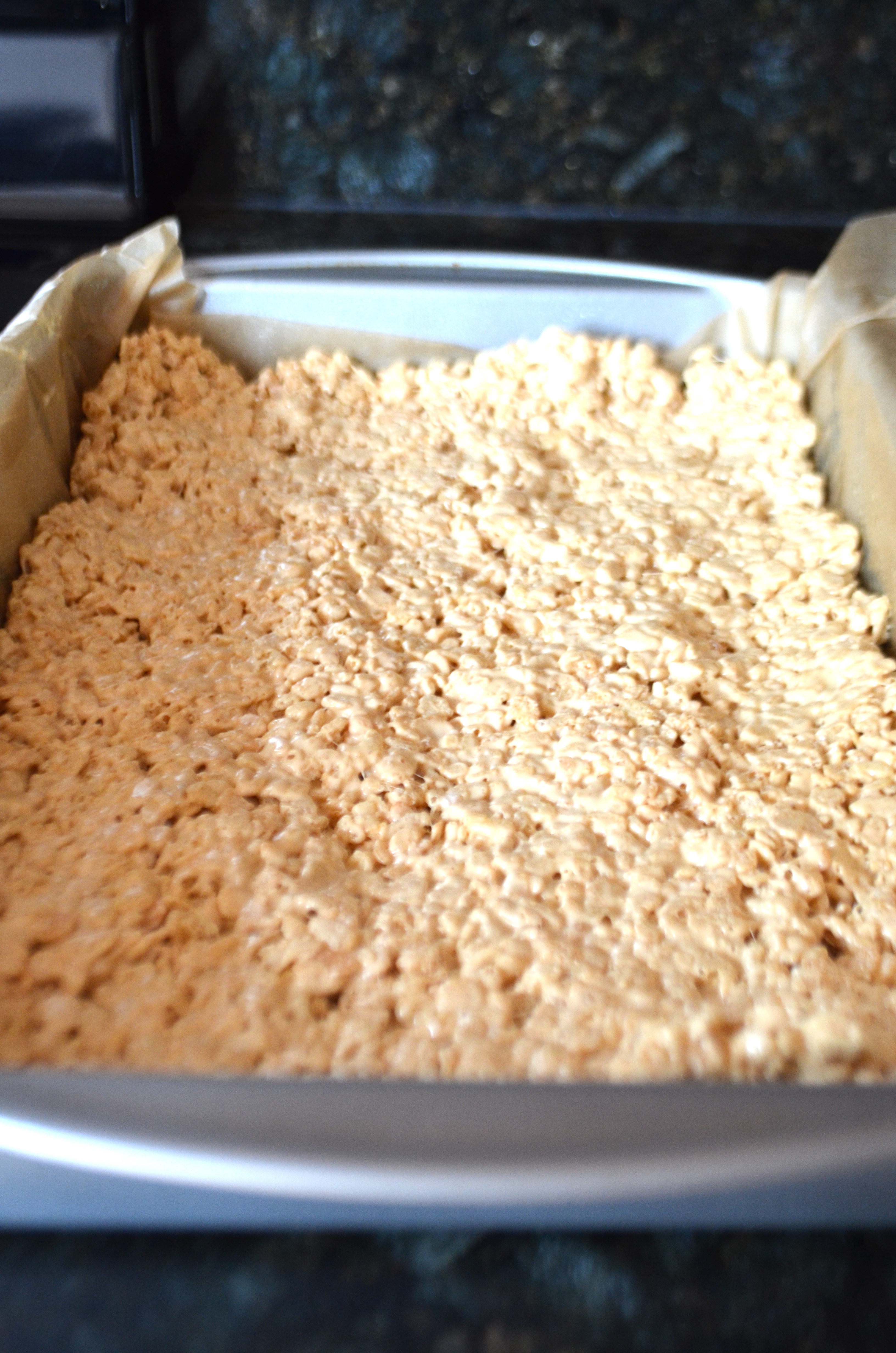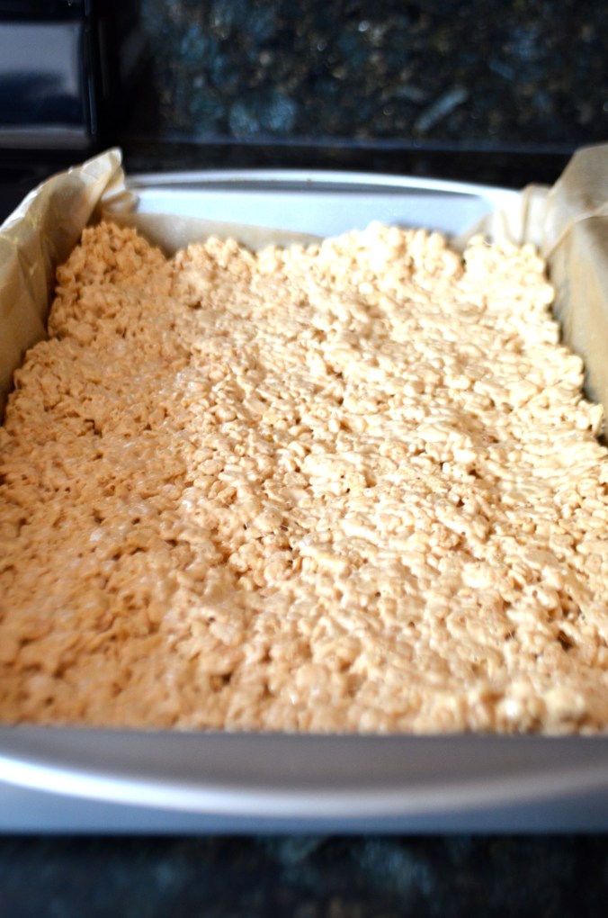 Cover a 9×13 inch pan with parchment paper and cover parchment with baking spray (you don’t want the rice krispies to stick). Press rice krispie mixture into greased pan and let cool.