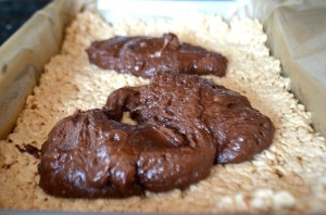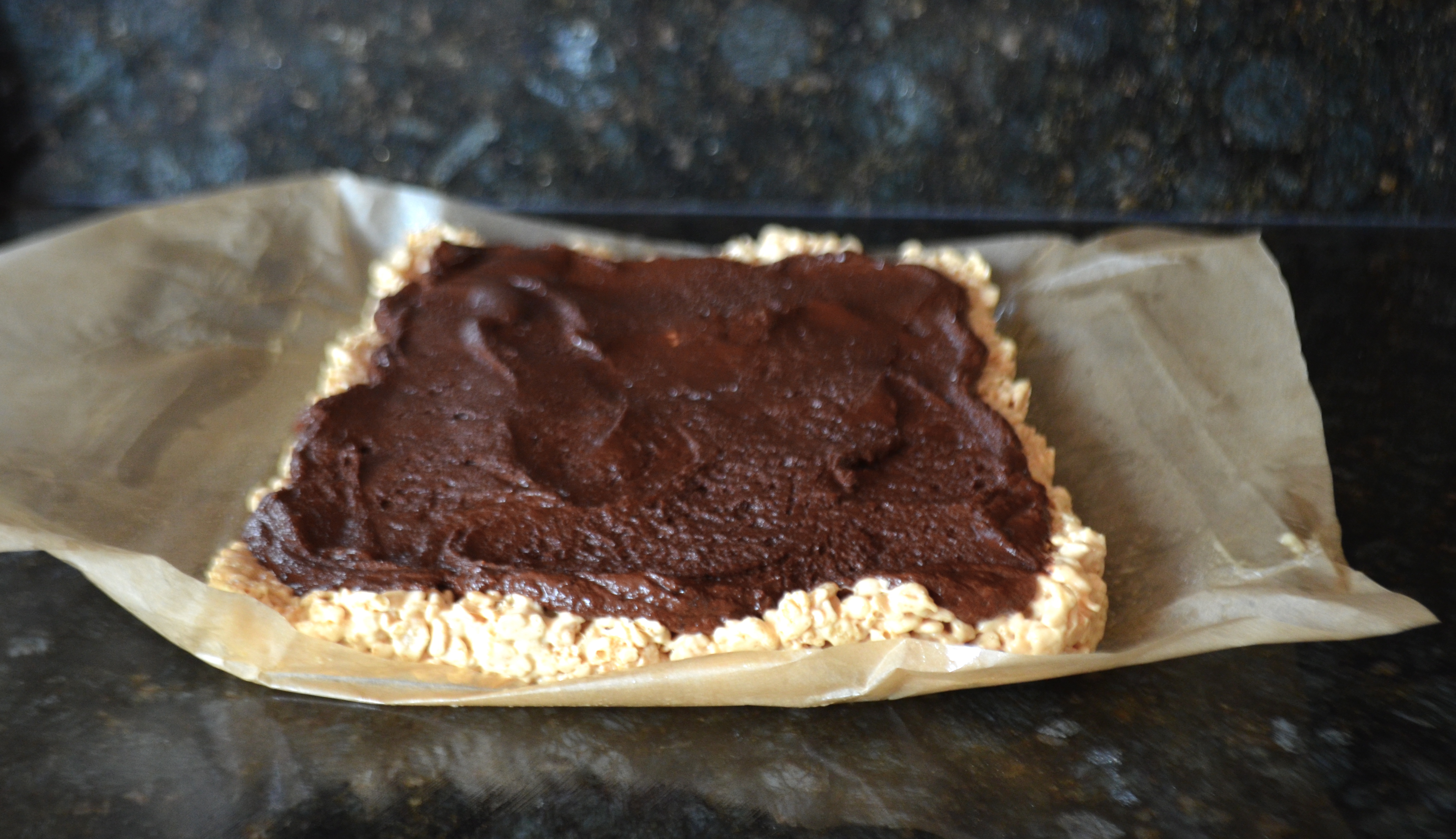 Once chocolate is melted and combined with marshmallows, spread evenly over rice krispies in pan.
