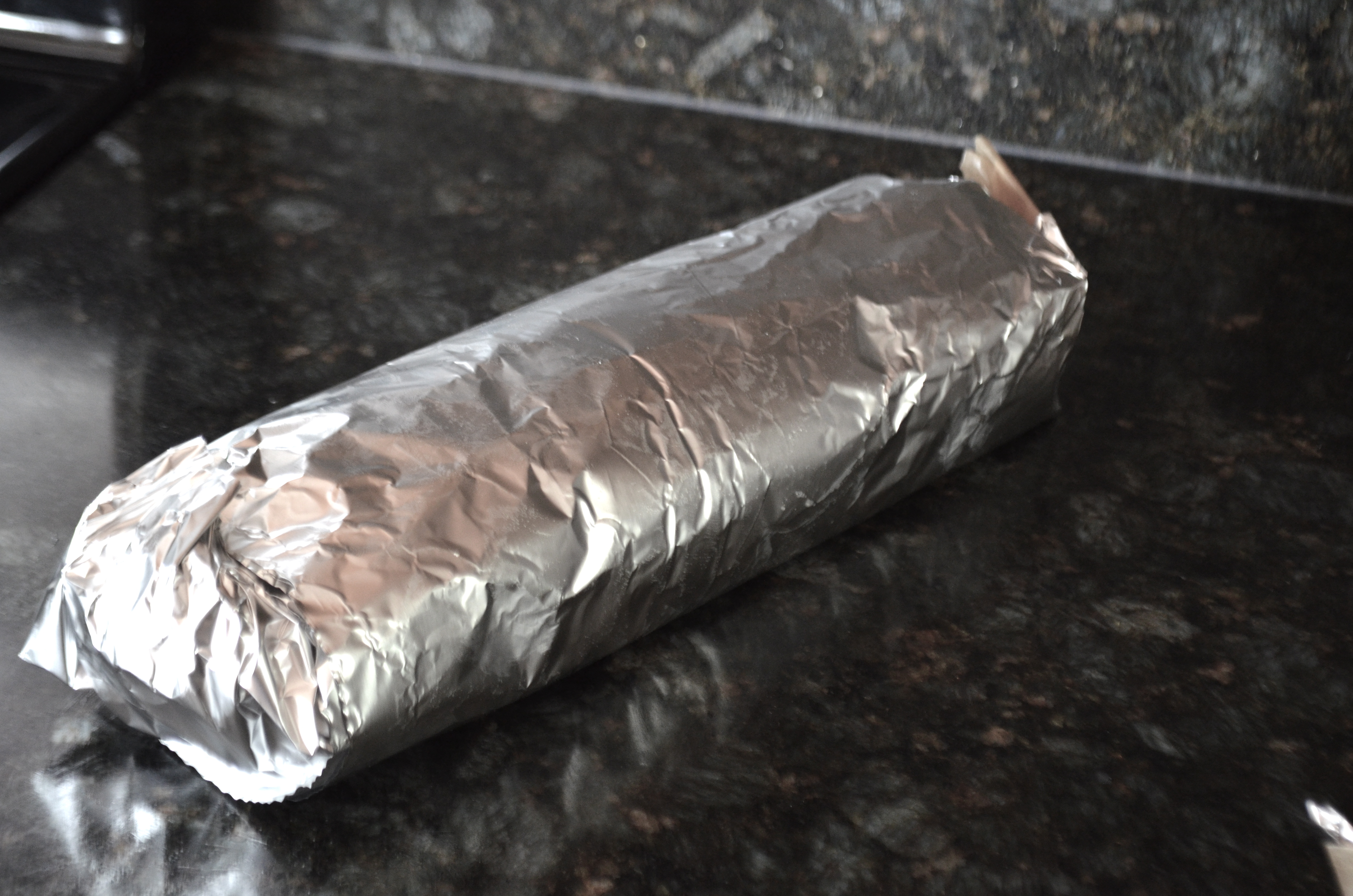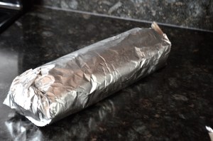 It may not stay in place well, so I recommend wrapping it in the greased parchment you have left over and then wrapping that tightly in tin foil and placing it in the refrigerator until you serve it.