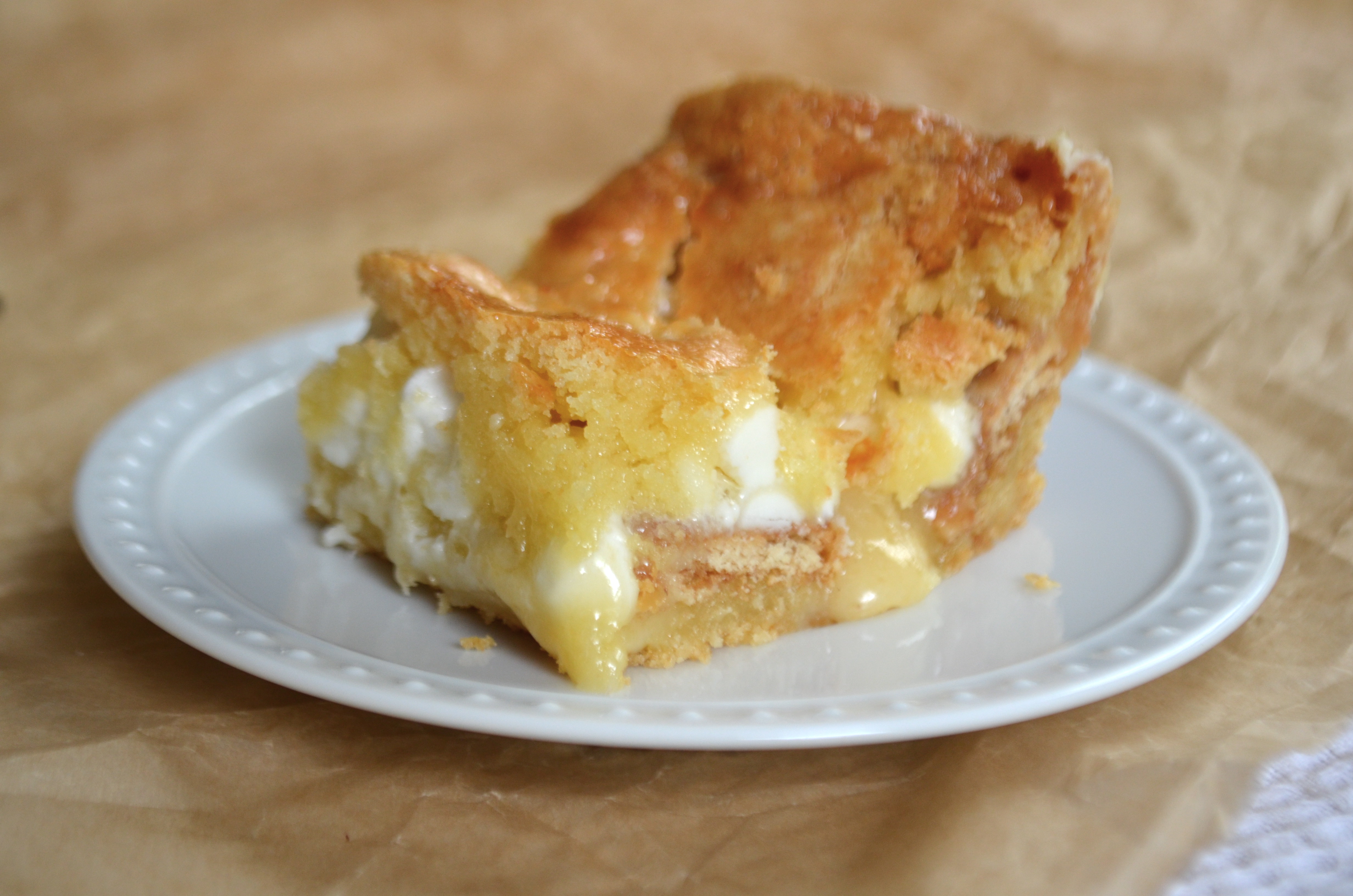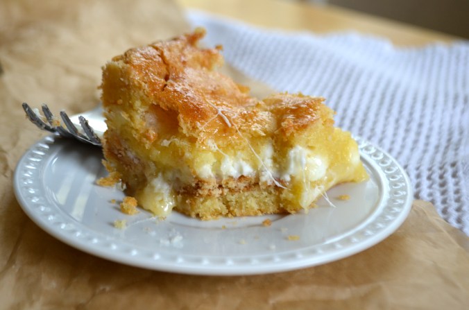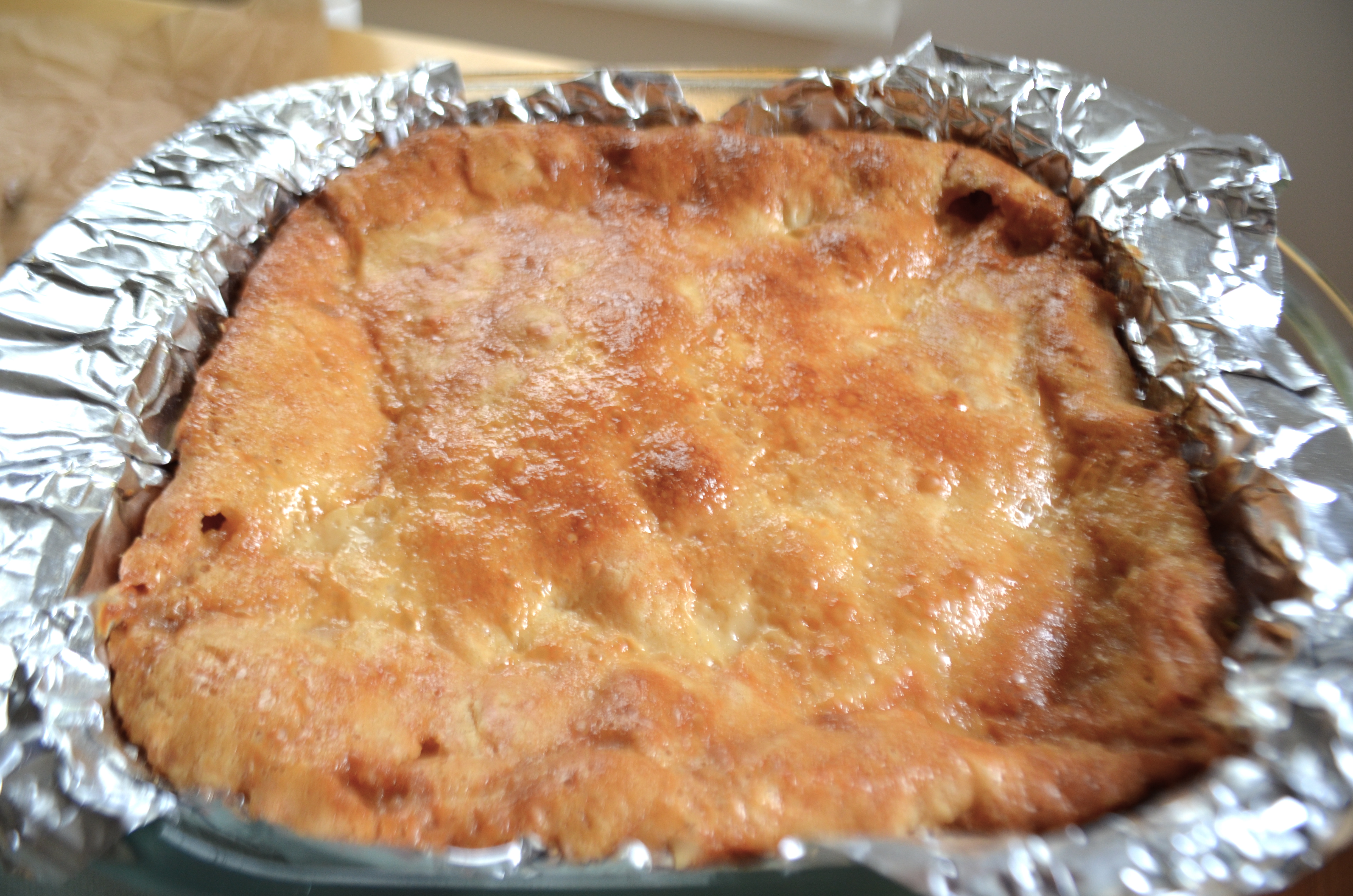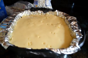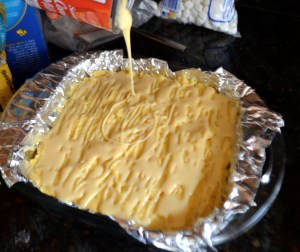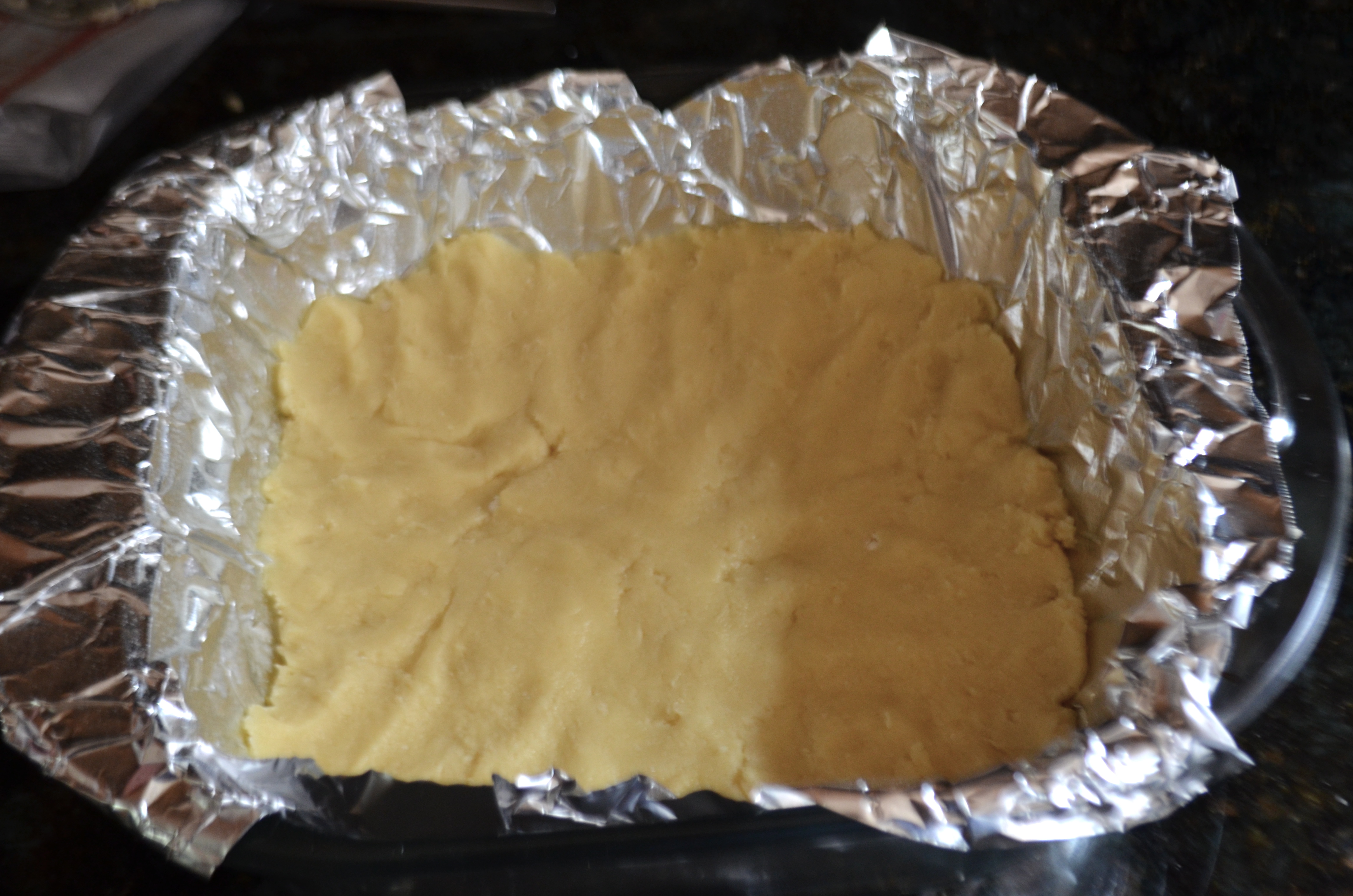 Cover that with the remaining dough, covering as well as you can and pressing to an even layer. Finally cover that with the sweetened condensed milk and place into oven for about 30 minutes.
