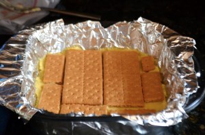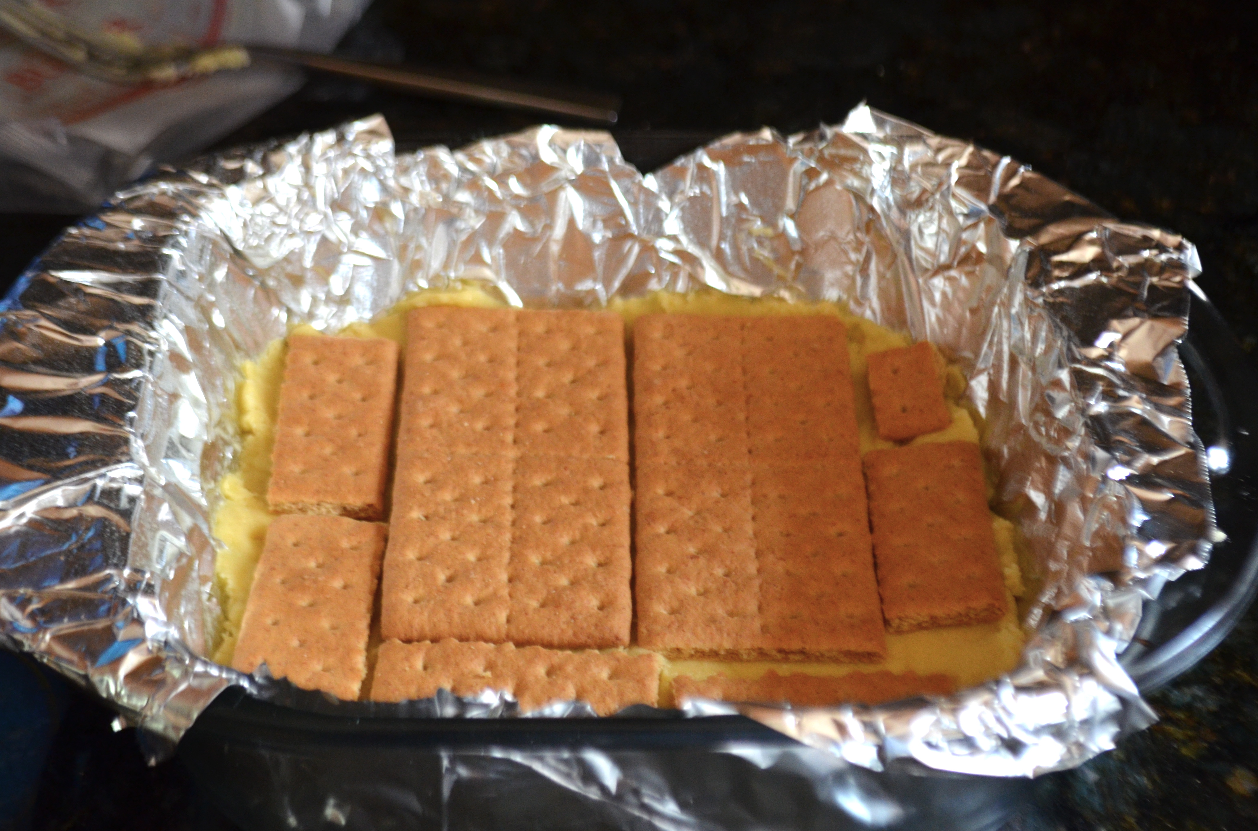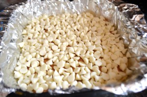 Next, layer the graham crackers evenly over the crust, breaking the crackers as necessary to fit. Follow that with a layer of the white chocolate chips and then the marshmallows.