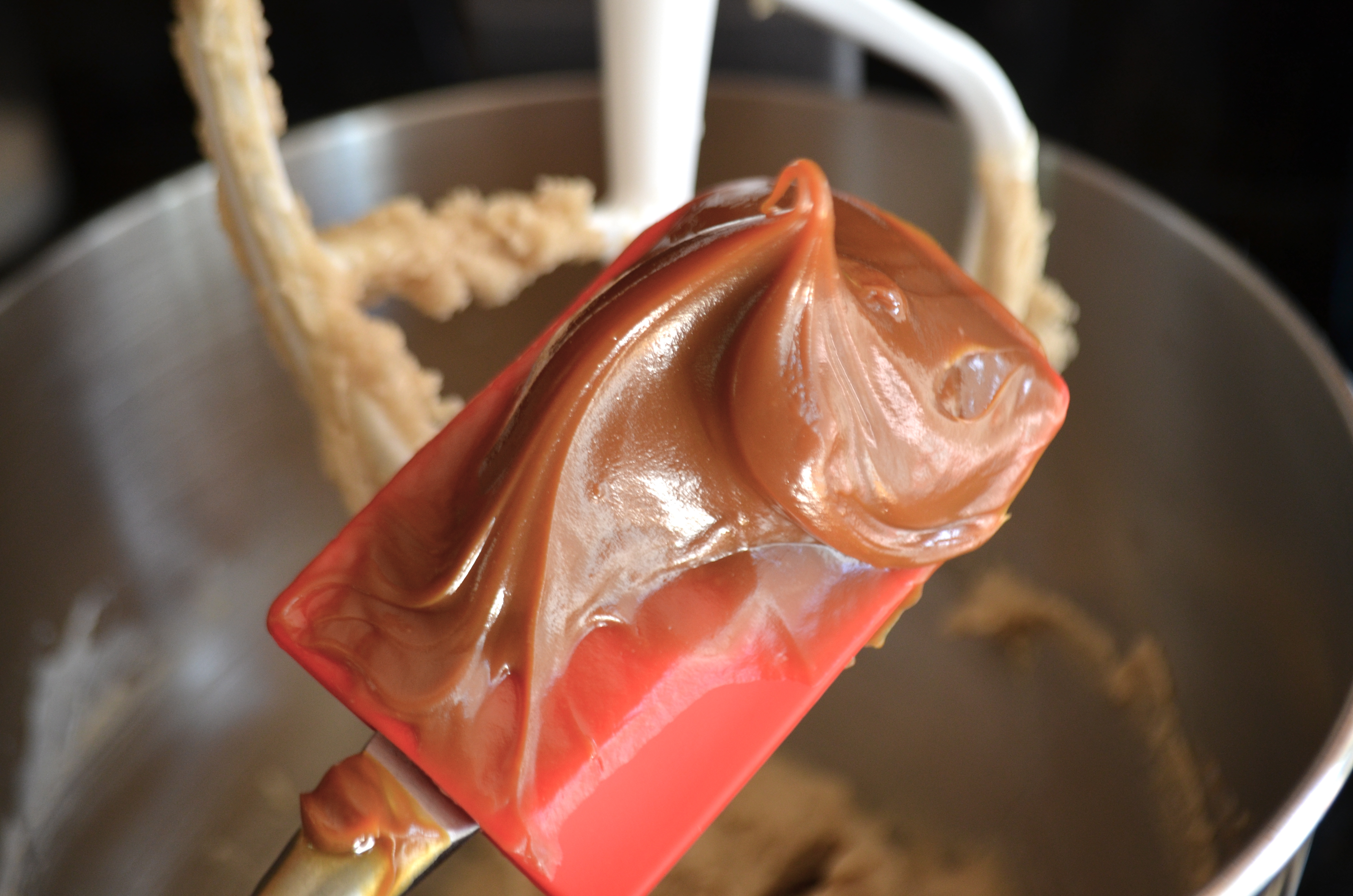 In the bowl of an electric mixer, beat butter well until fluffy. Add the dulce de leche and sugars, beating well until combined. Add eggs, one at a time, beating well after each addition.