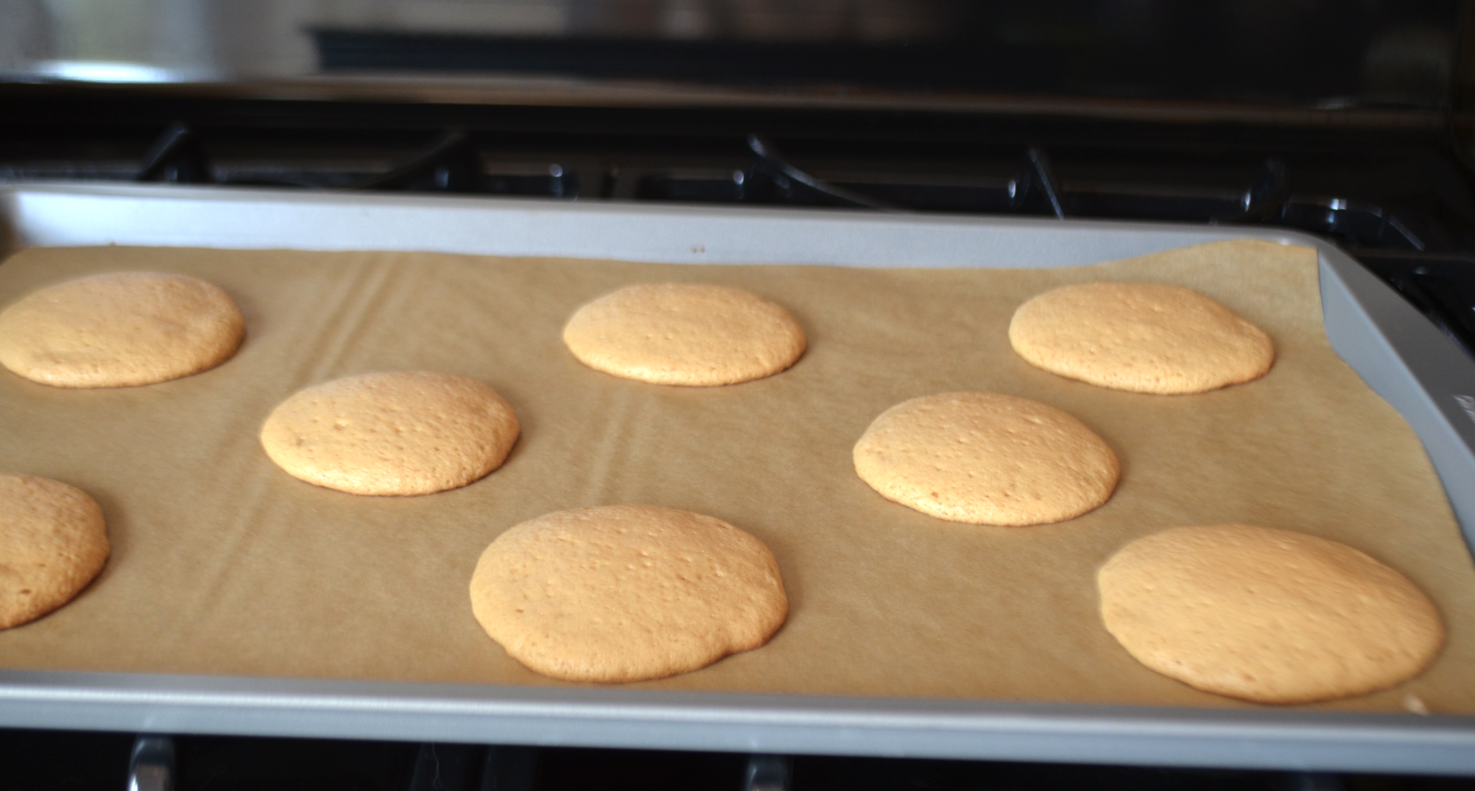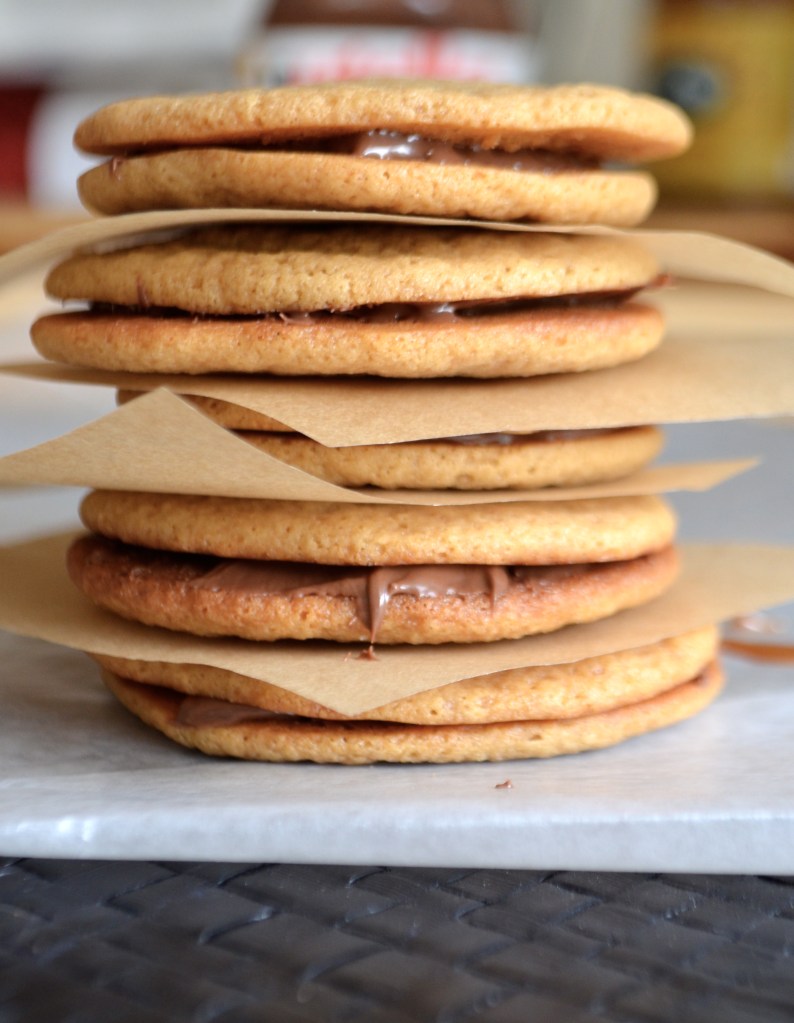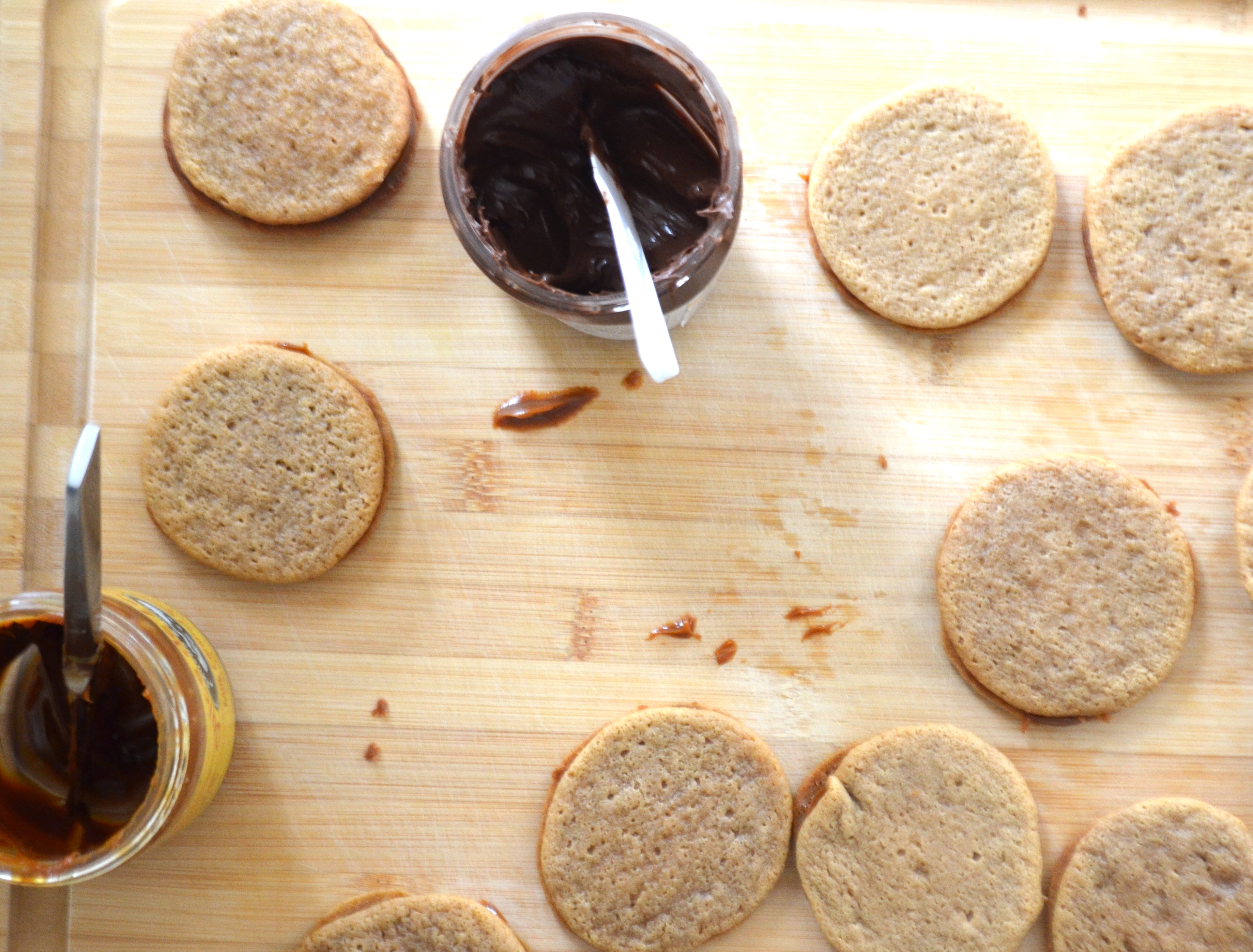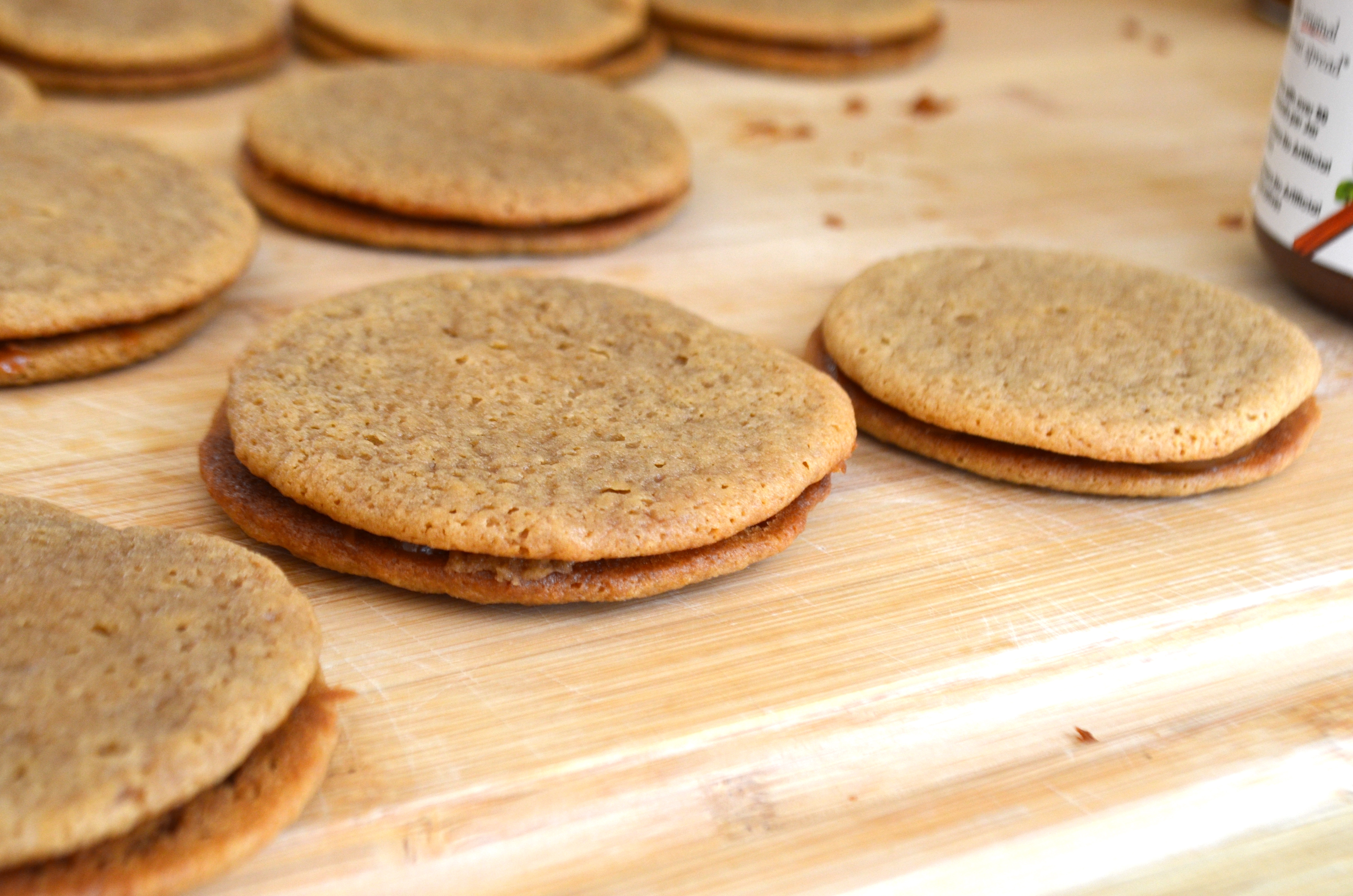 Let cookies cool on a drying rack. Once cool, spread a thin layer of dulce de leche, Nutella or peanut butter between two cookies and serve!