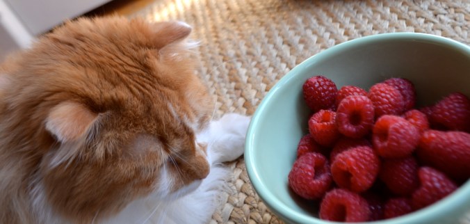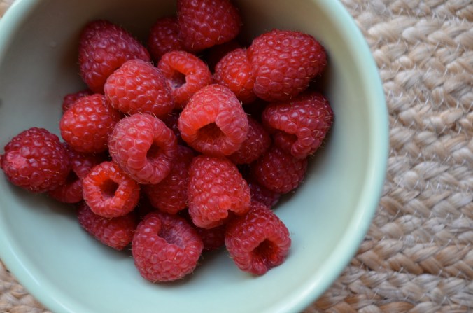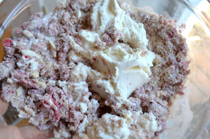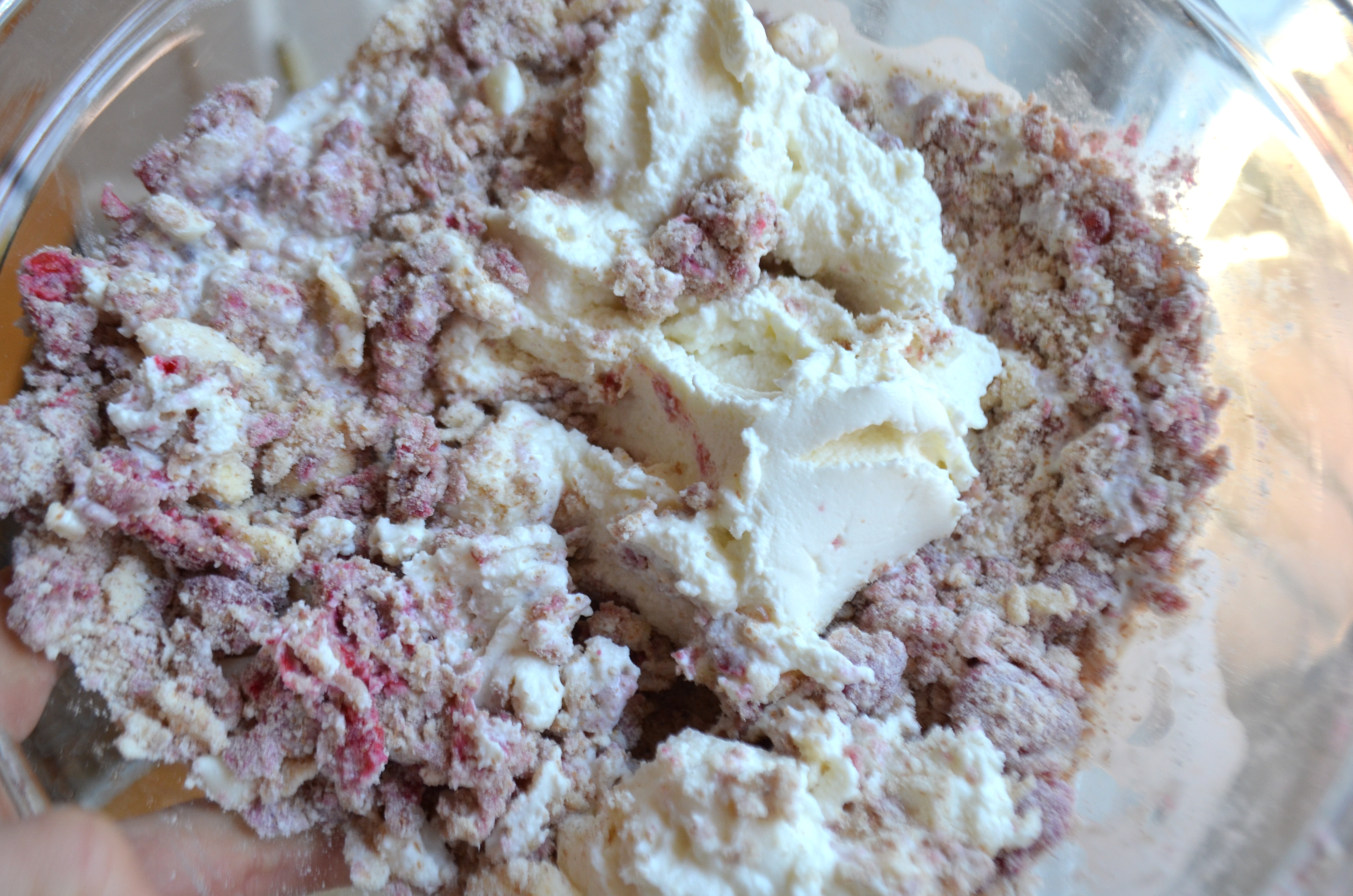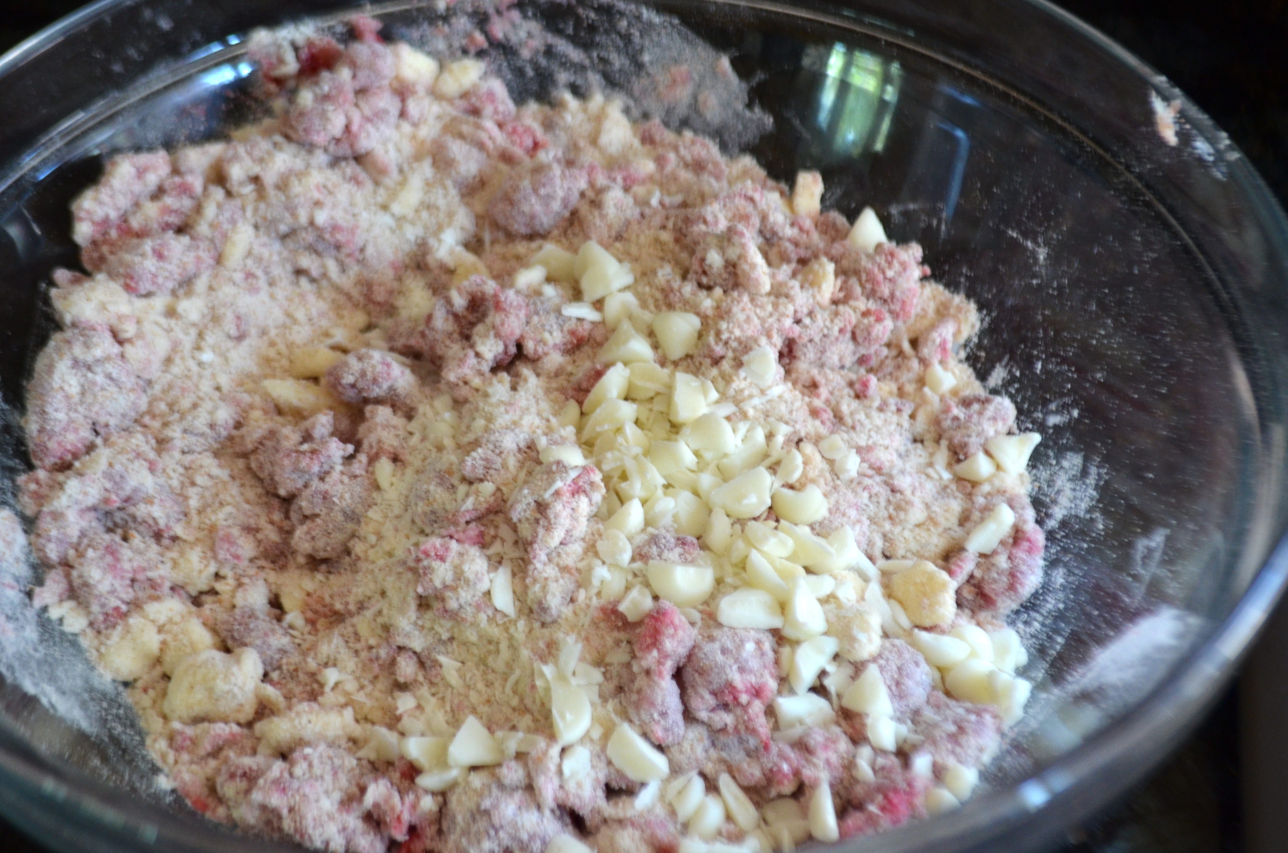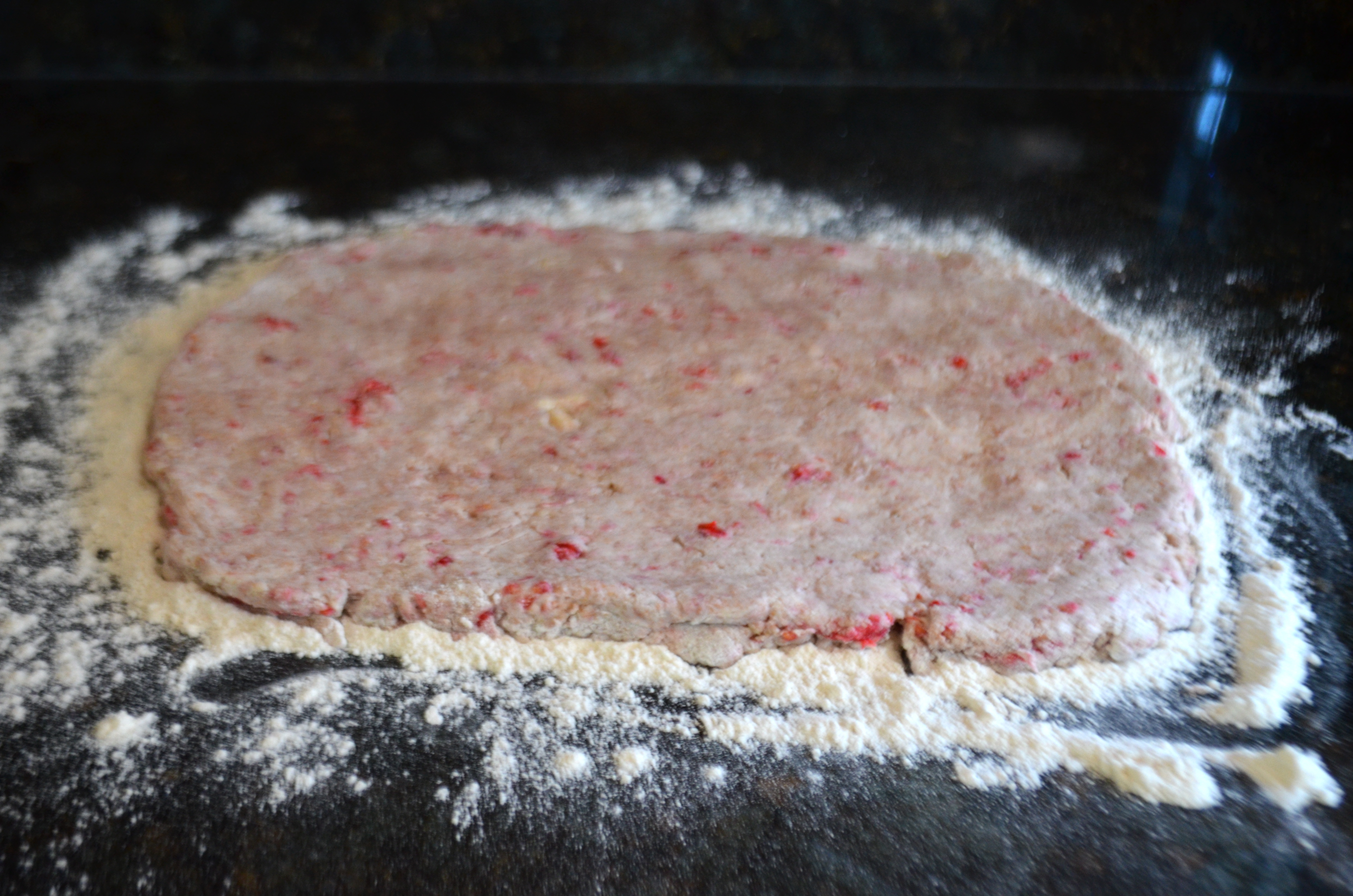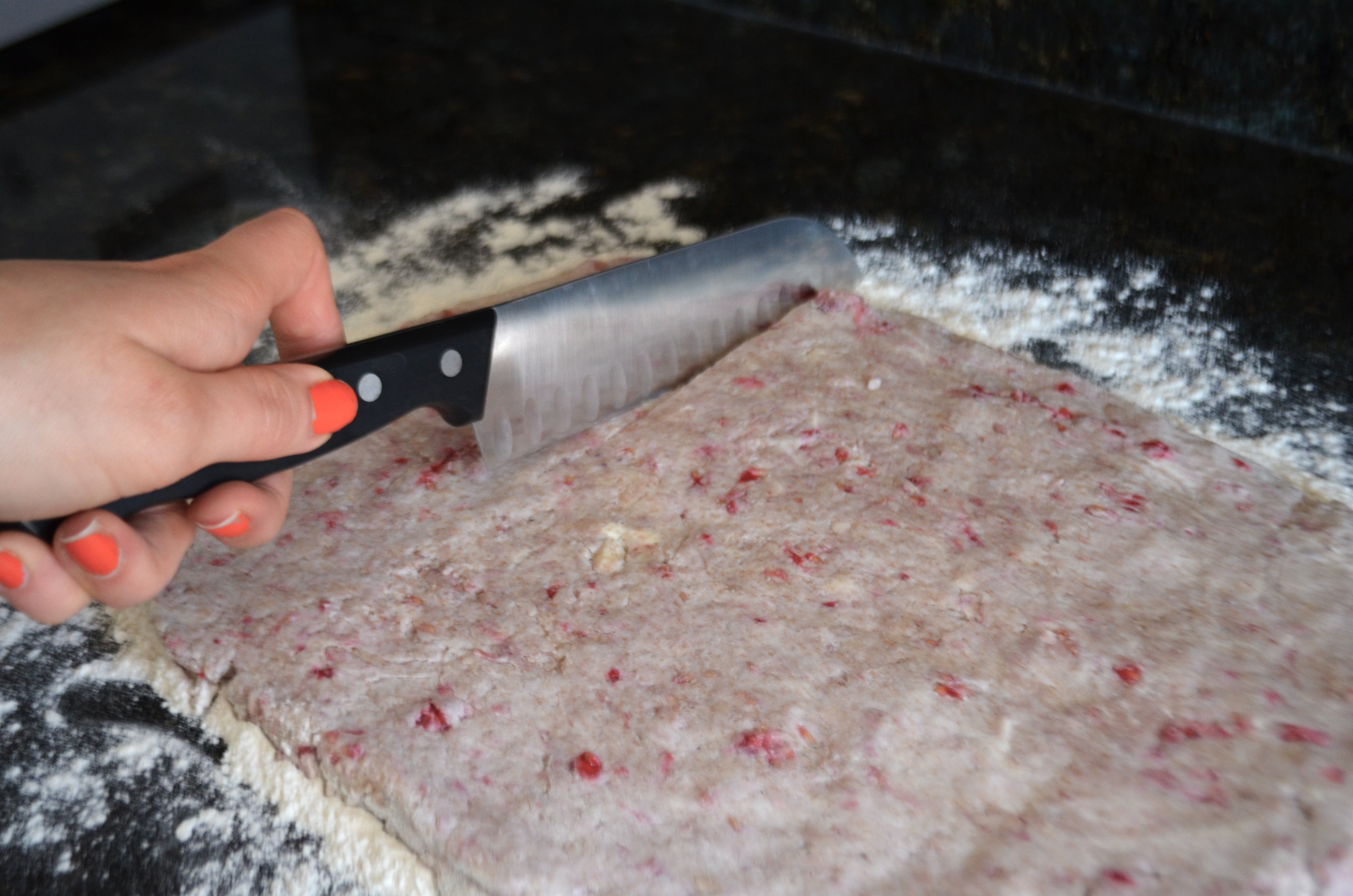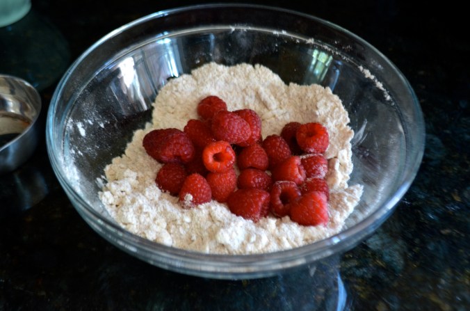Add raspberries and use blender to chop berries at least until they are quartered in the dough. This is the best part because it smells amazing and the dough takes on a beautiful pink color.