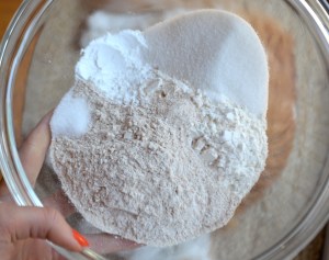 In a large bowl, whisk together flours, baking powder, sugar and salt.