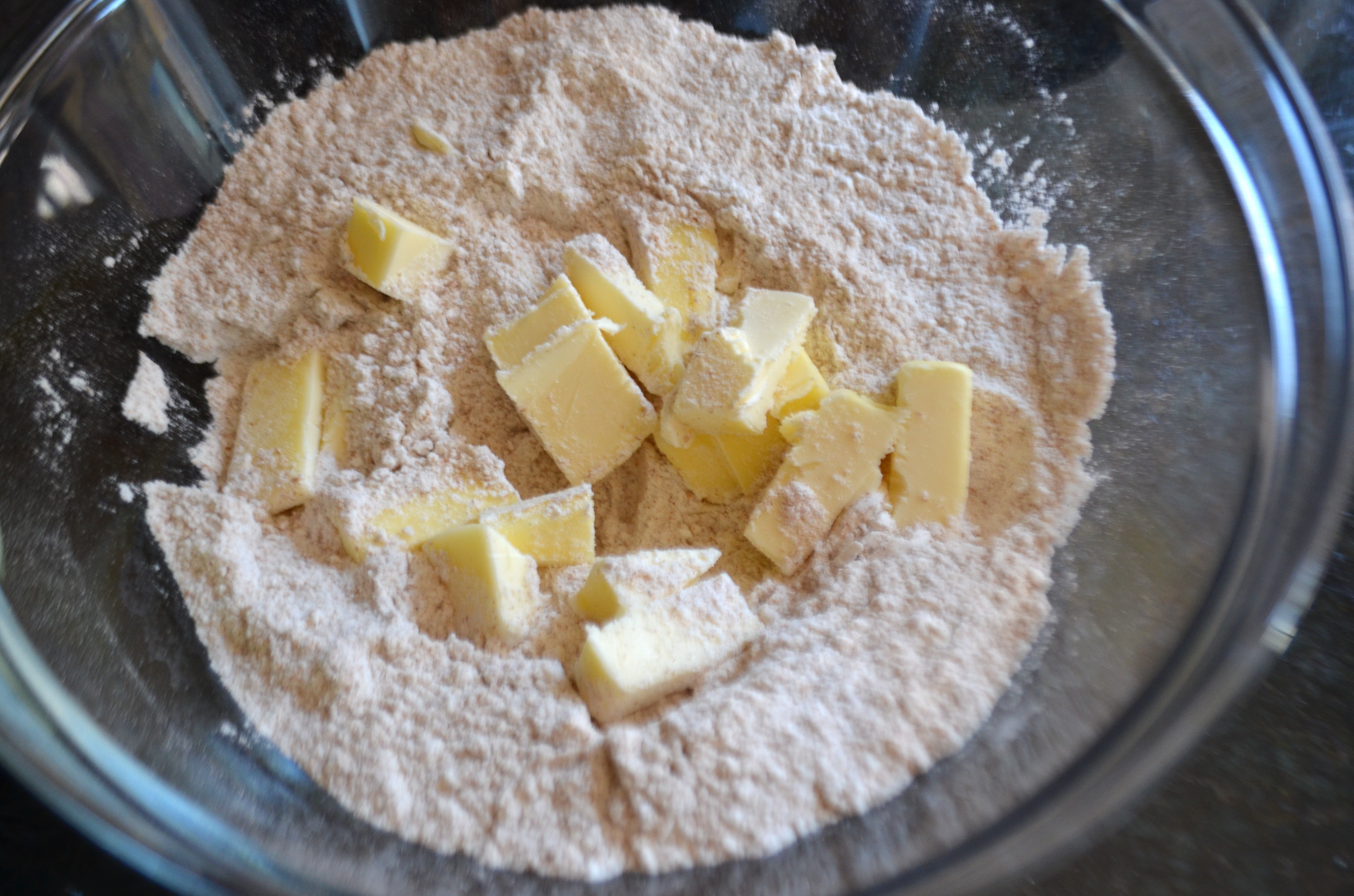 Using a pastry blender, add the butter and cut it into the flour until the largest pieces are the size of small peas. Make sure the butter is cold, this will help the butter keep its shape and give the scone great texture.