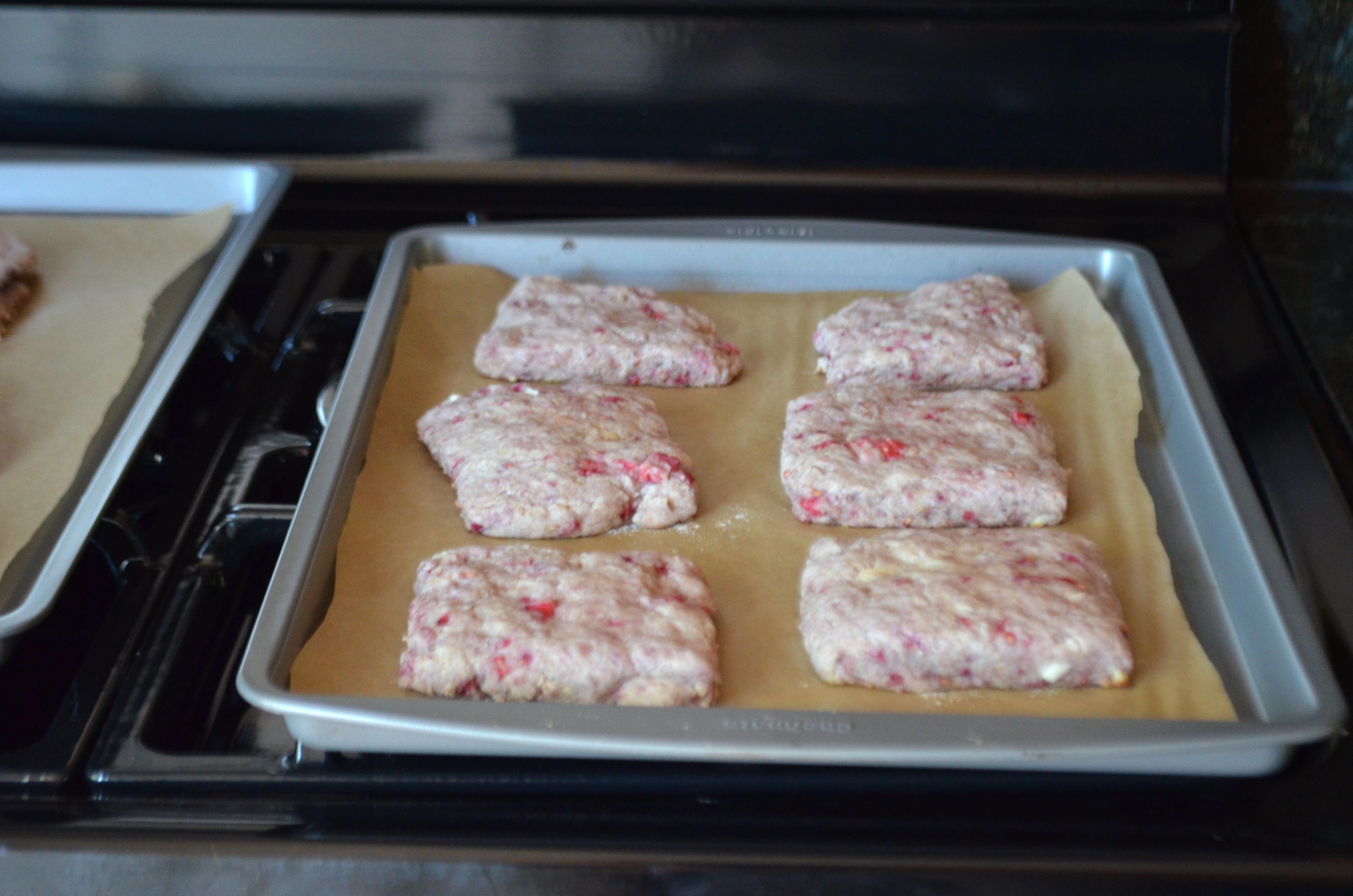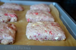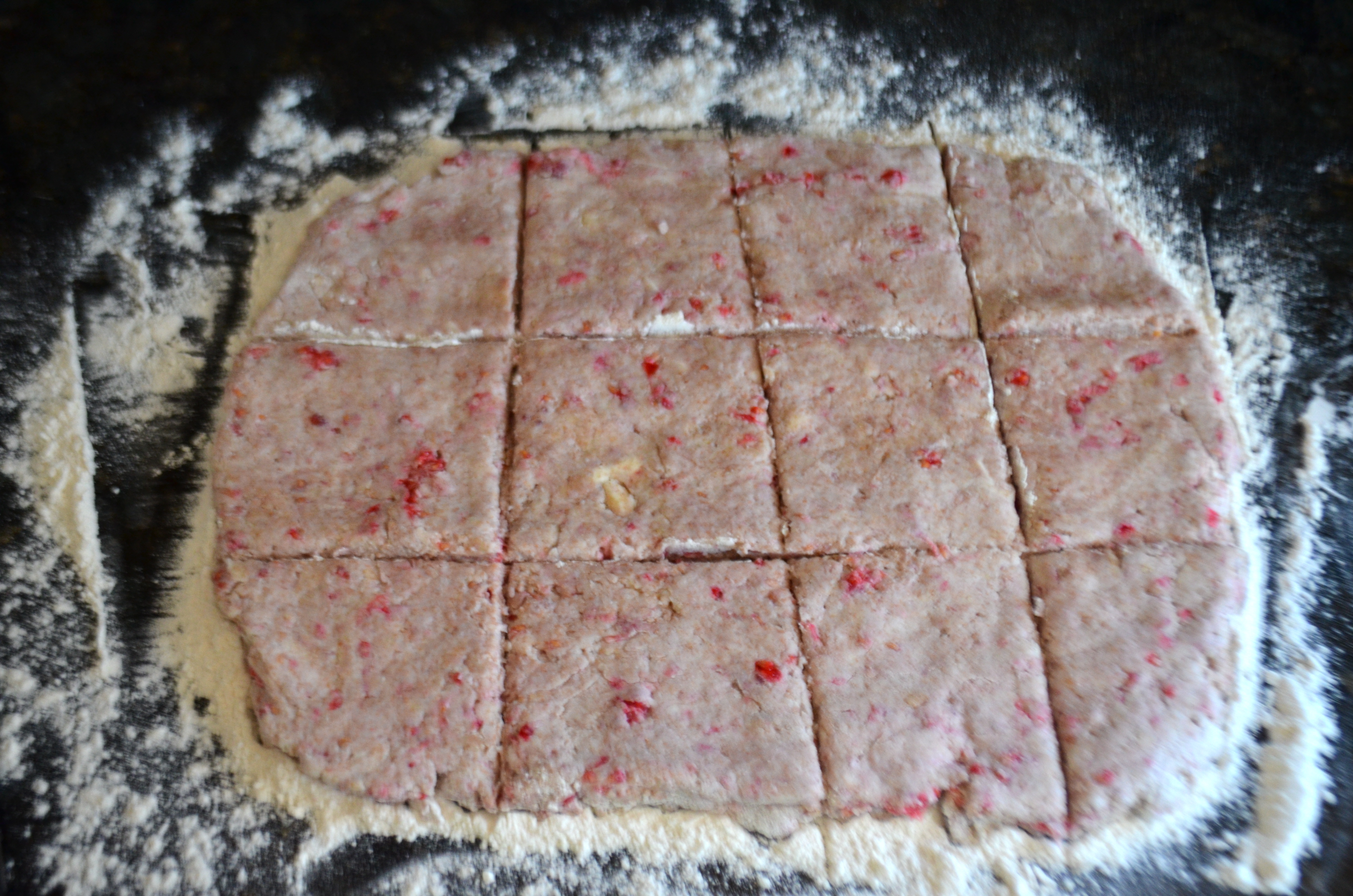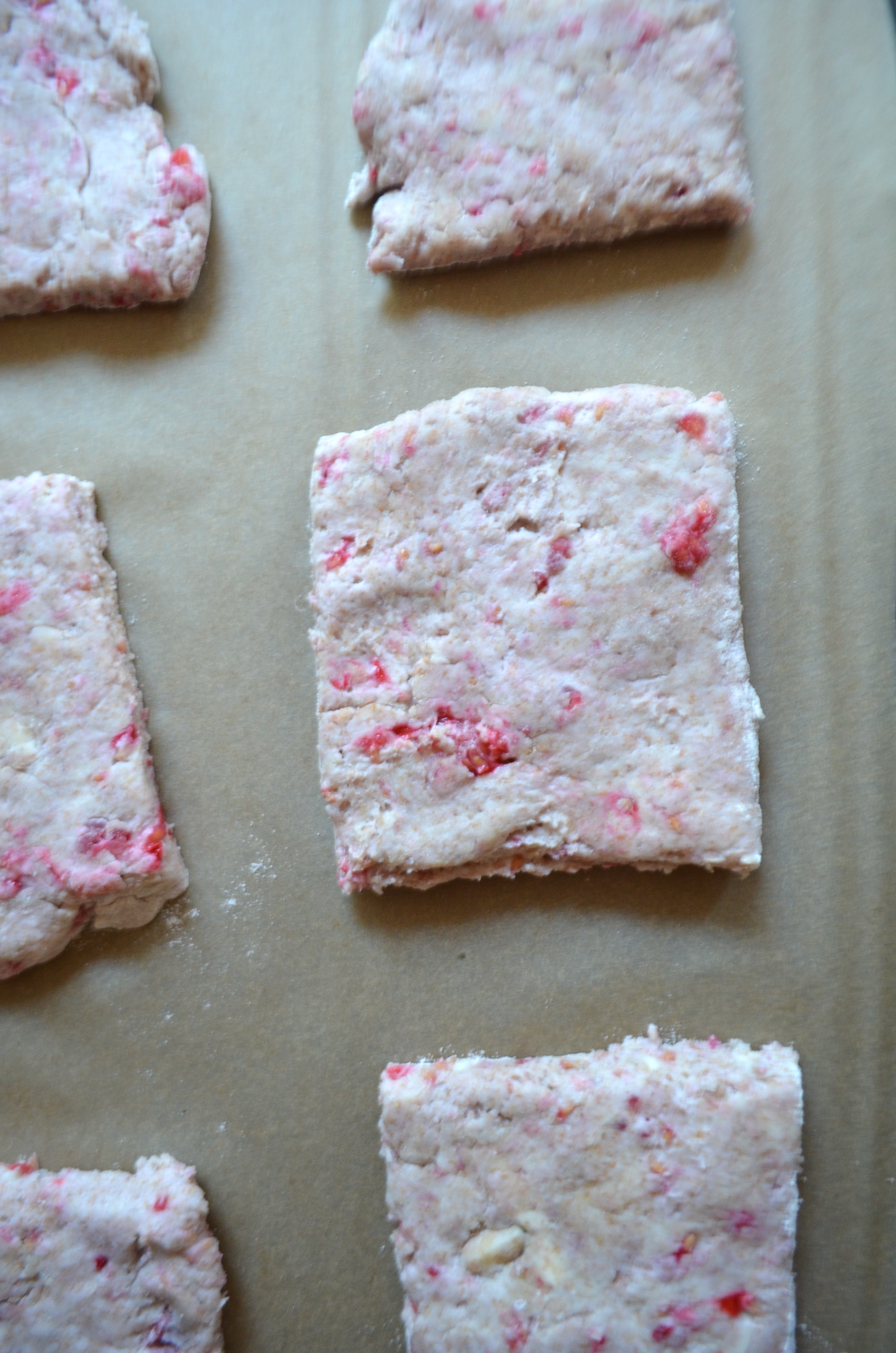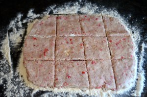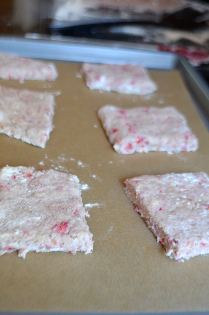 Transfer the dough quickly to a floured surface and pat the dough until it reaches a square/rectangle that is about 1 inch thick overall. Use a knife to cut the dough into squares and transfer with a spatula to prepared baking sheet (or sheets).  Bake for about 15 minutes until lightly golden around the edges.