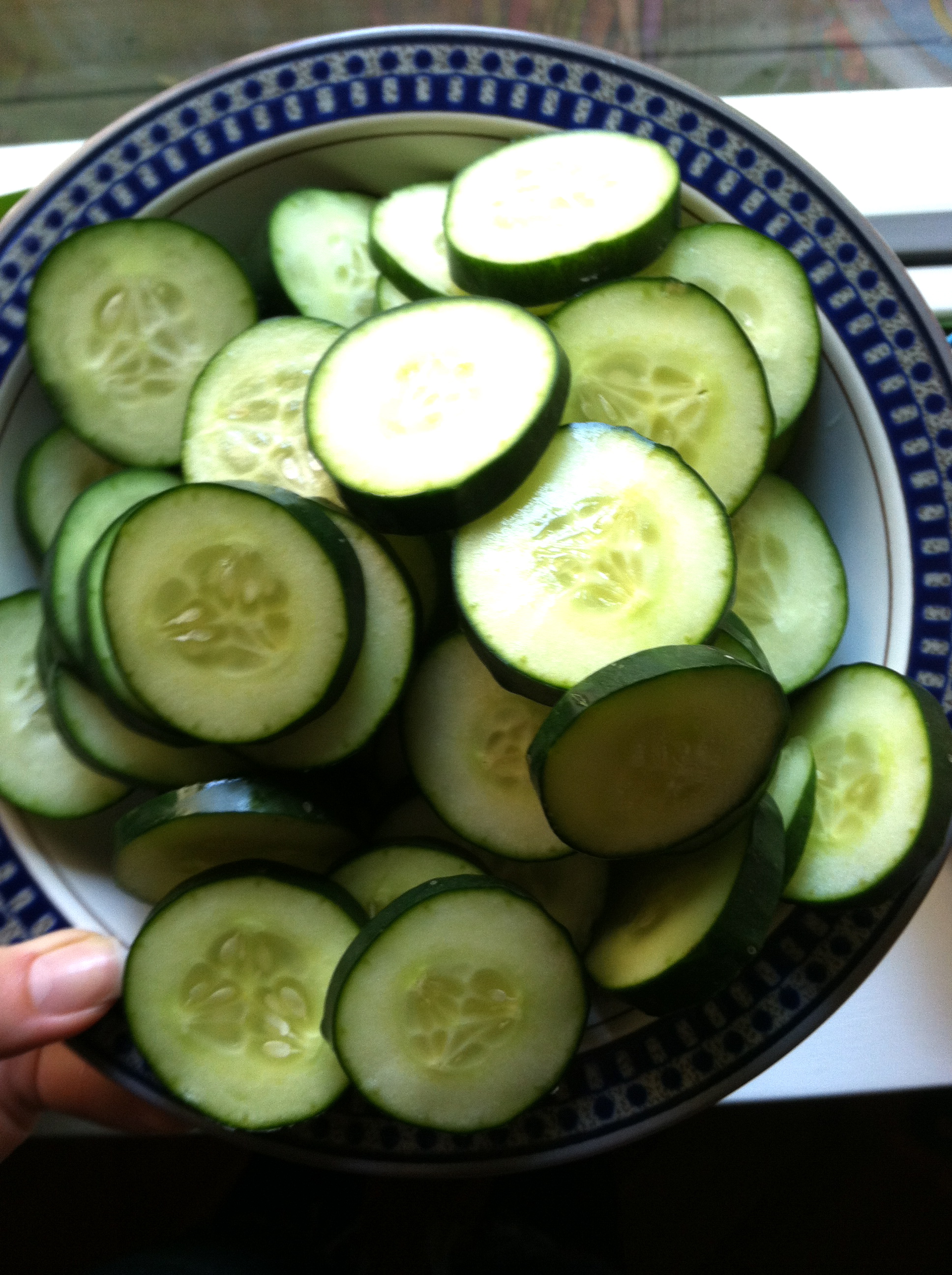 Wash 3 canning jars (more or less depending on what size you use) and place sliced cucumbers into jars.
