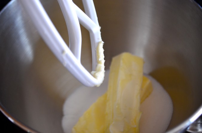 In a large mixing bowl, cream butter and sugar together until it reaches a fluffy consistency.