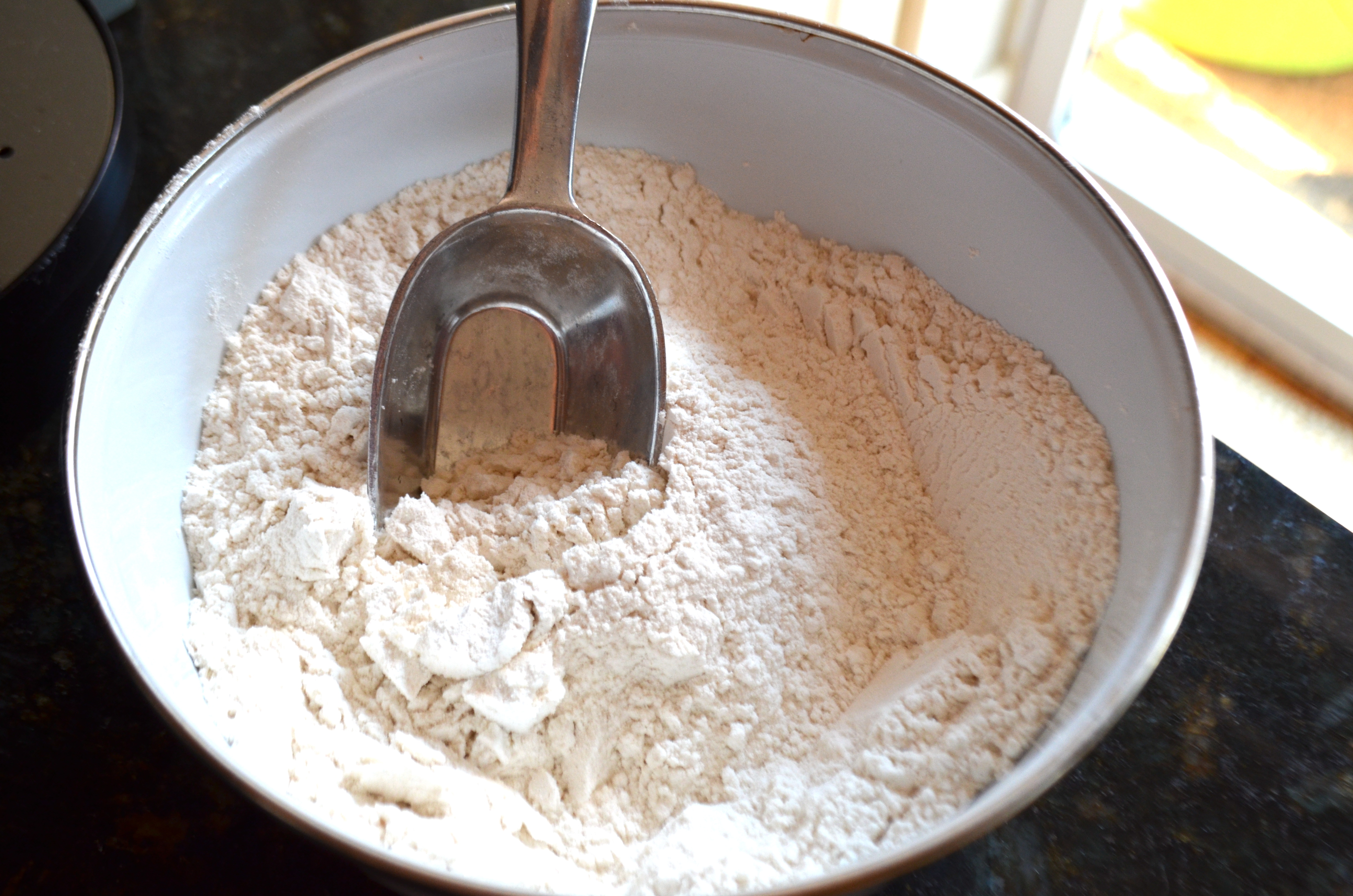 In a small bowl, combine flours and set aside.