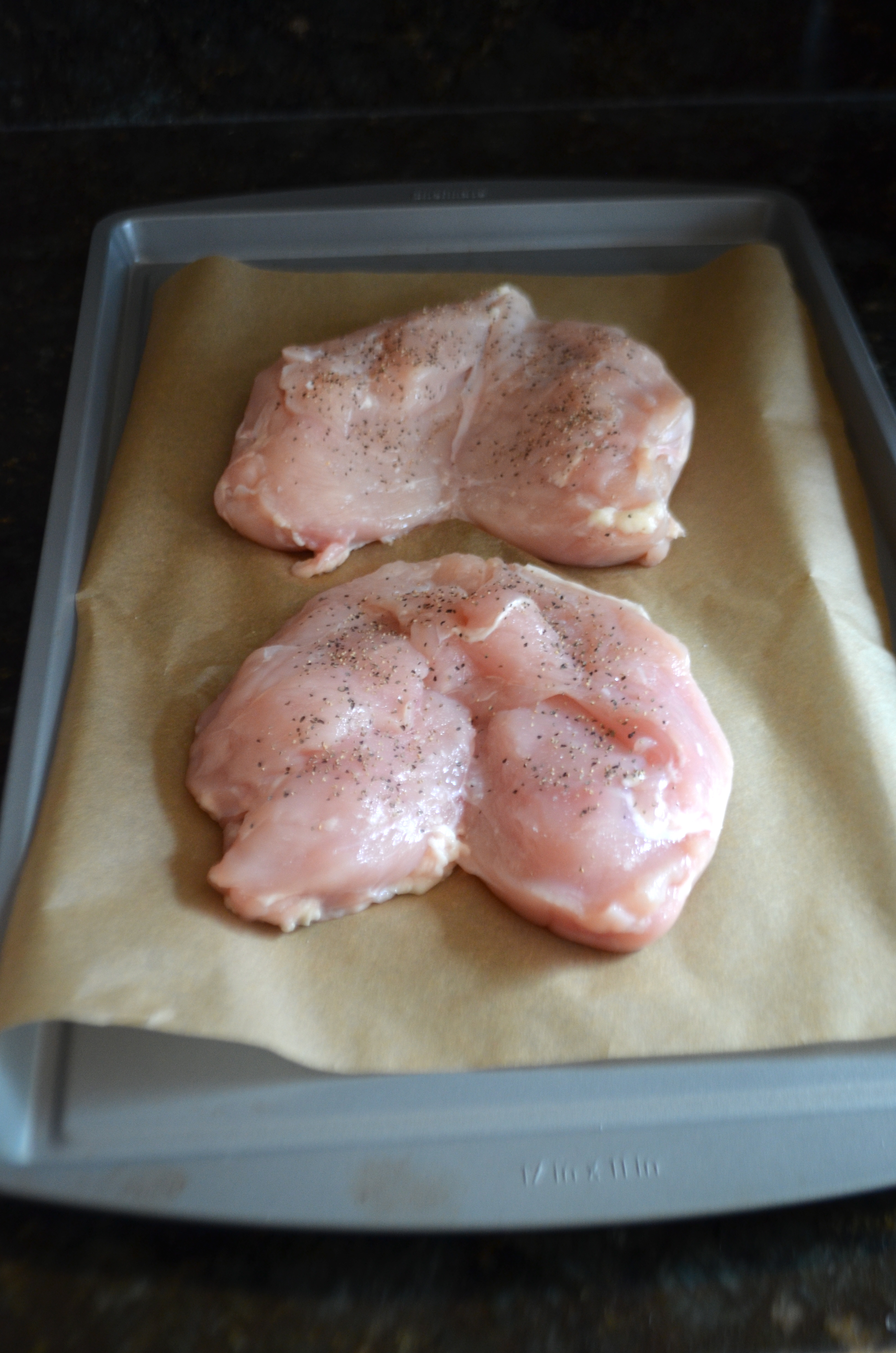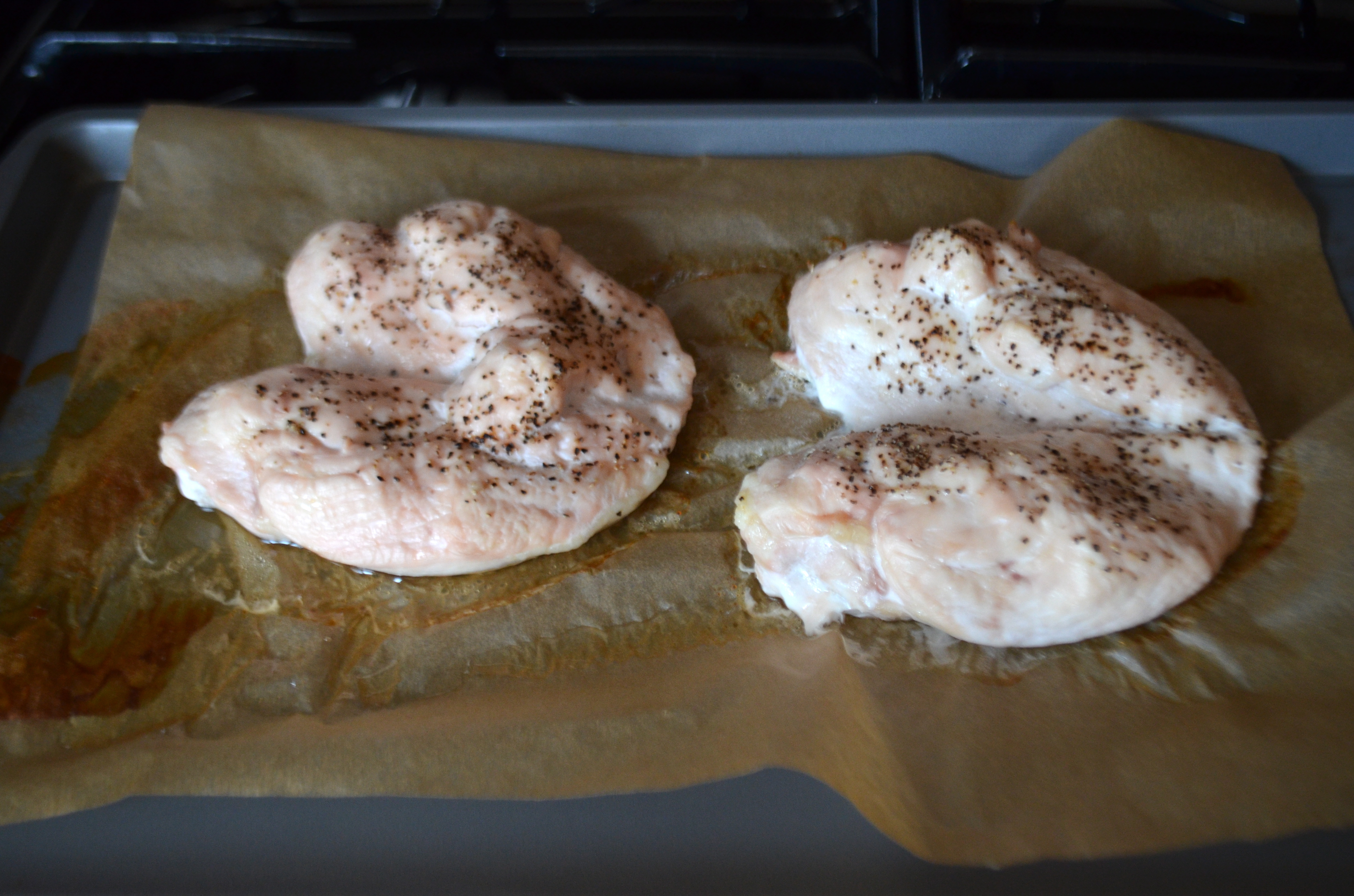 Line a baking sheet with parchment paper and place chicken breasts on pan. Salt and pepper both sides of breasts and roast  in oven for 35 minutes/until juices of chicken run clear.
