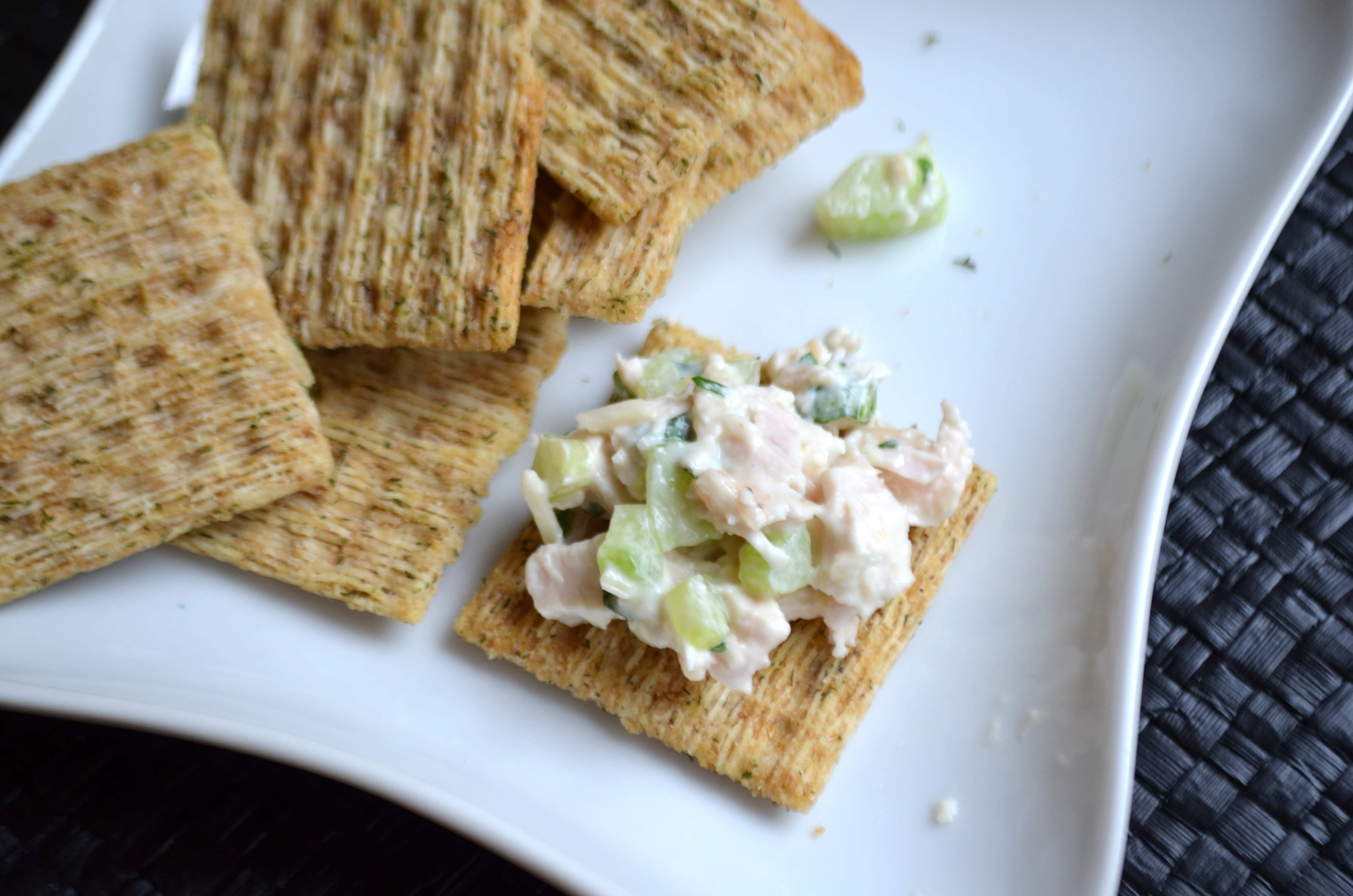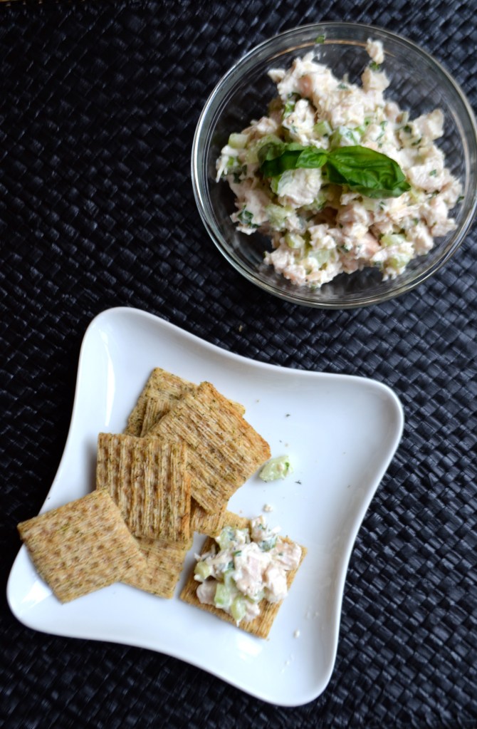 Combine all ingredients in a medium bowl and add chicken to mixture. Stir until chicken is evenly coated and serve with crackers, on a sandwich or stuffed in a pita!