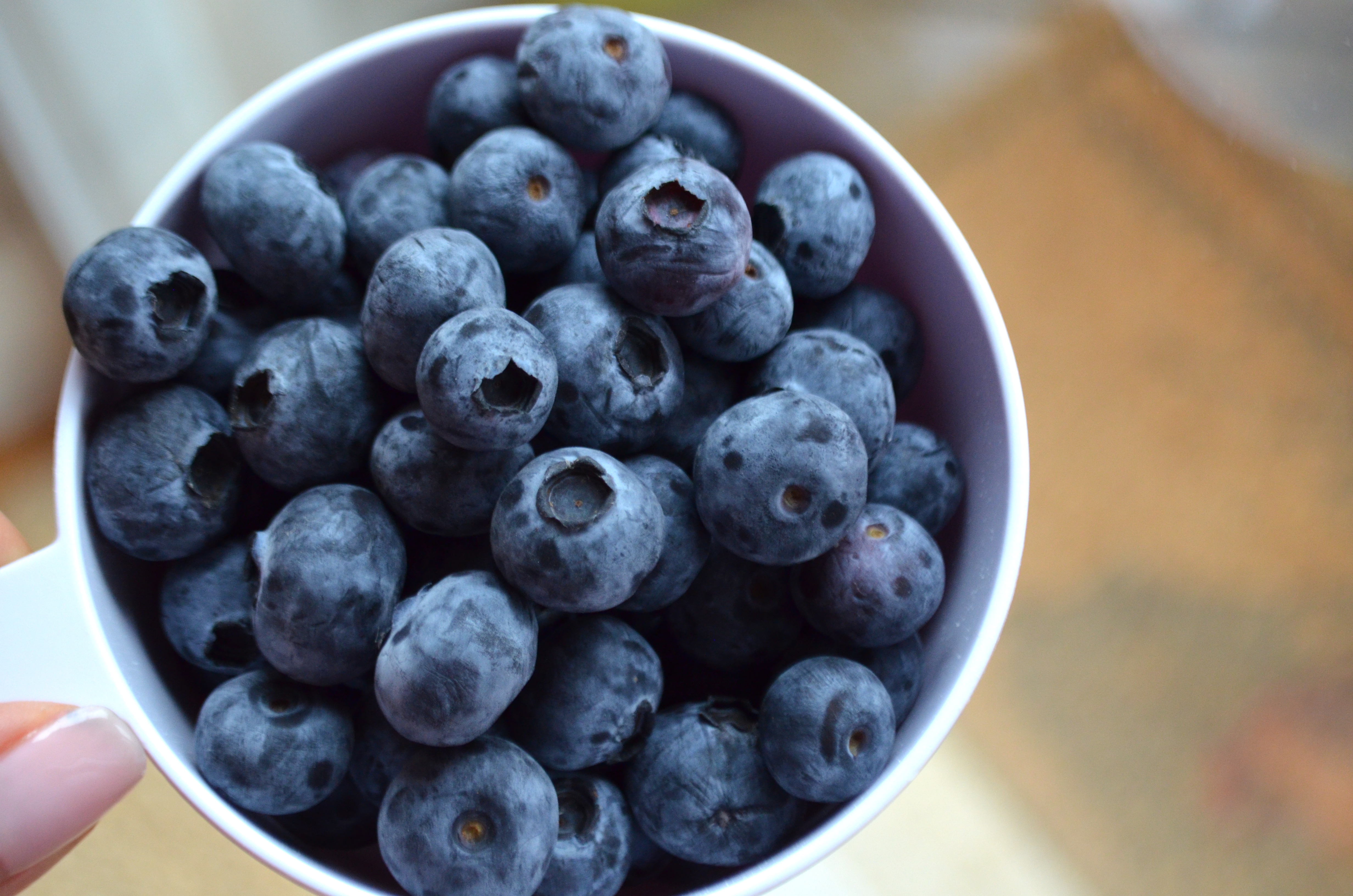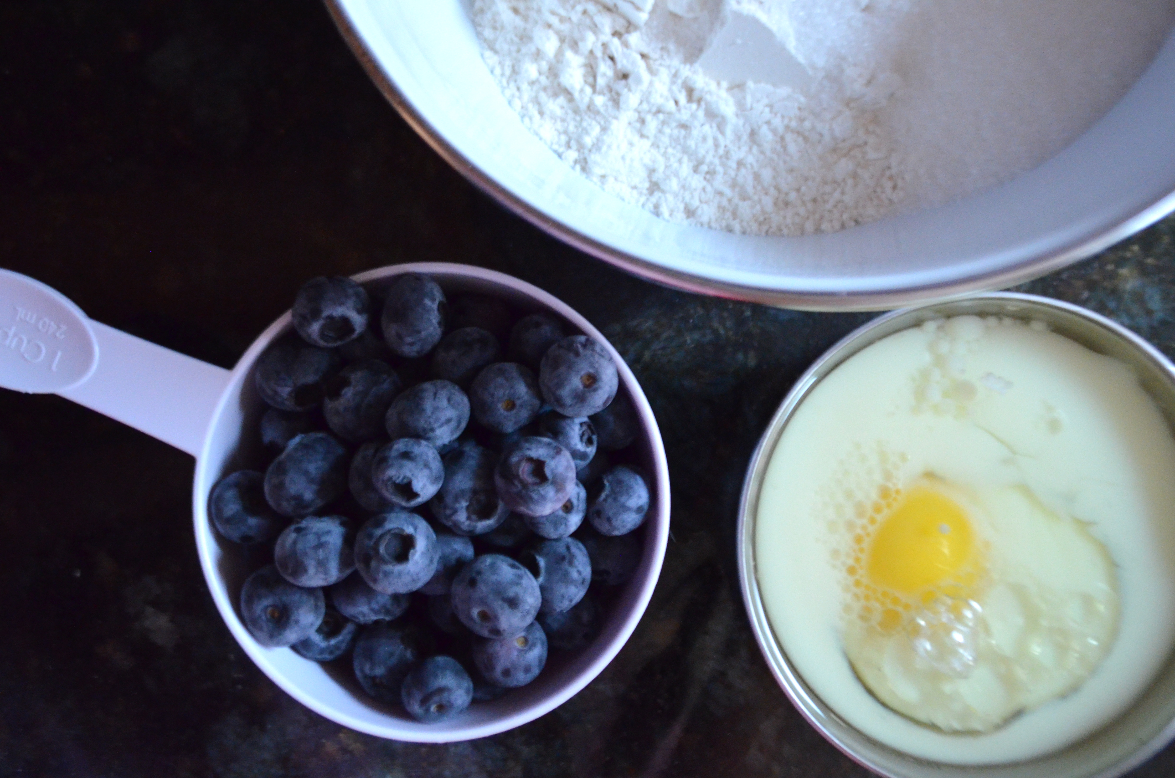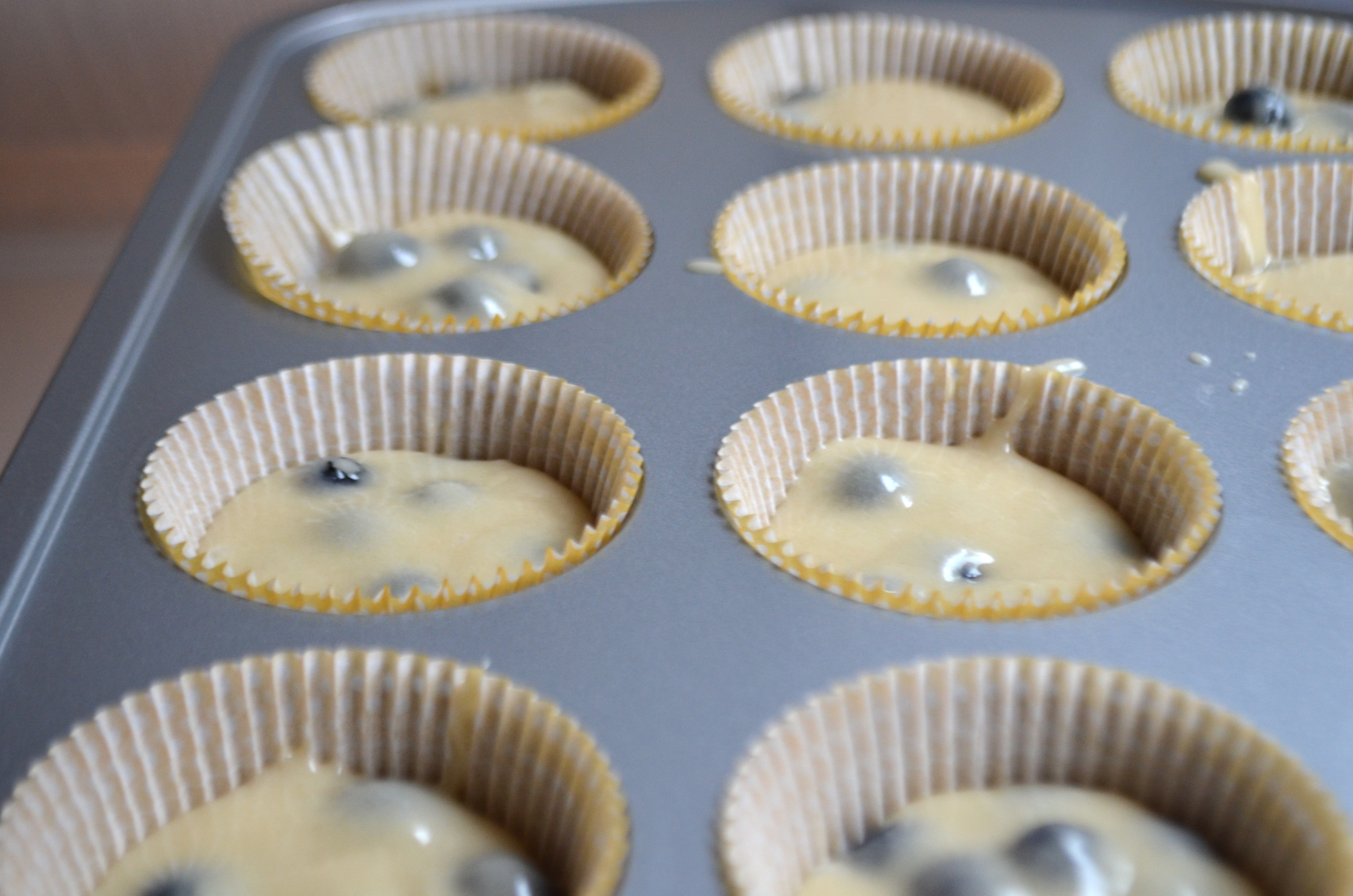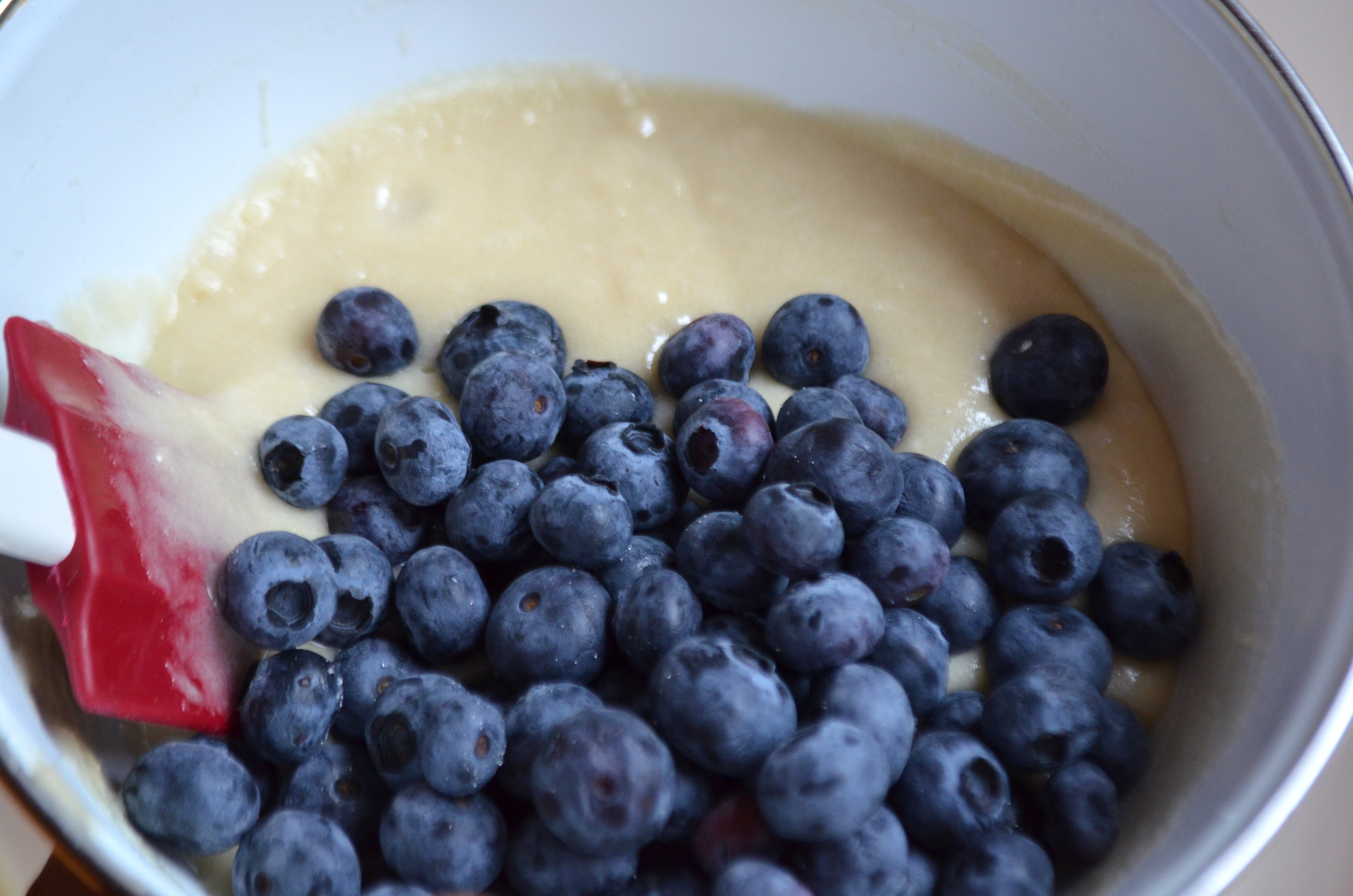 Mix egg mixture into the flour mixture and stir to combine. Stir in blueberries and fill muffin cups about 2/3 full.