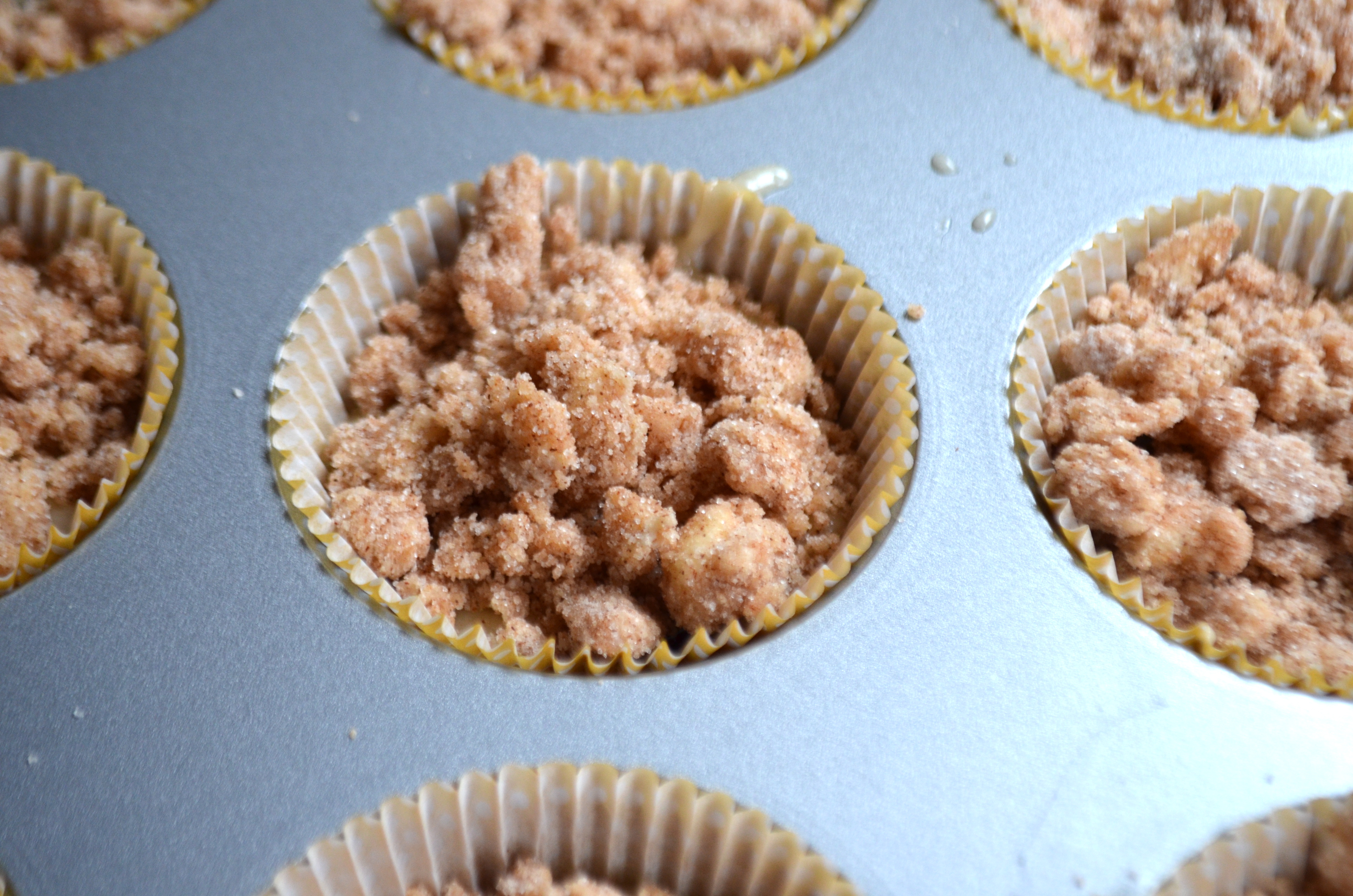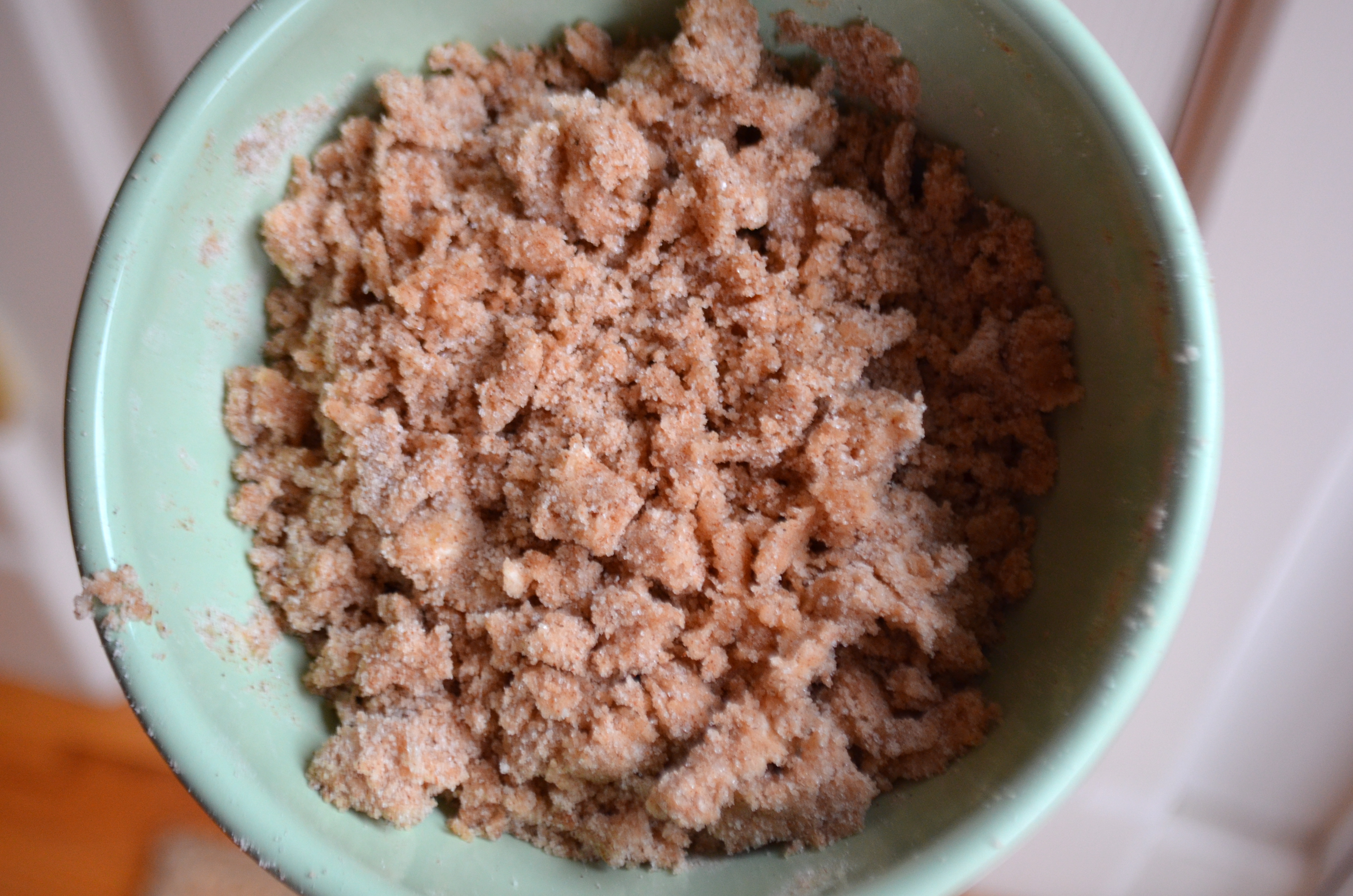 Sprinkle streusel over top of batter and place in oven for about 20-25 minutes, or until a toothpick inserted into the center comes out clean.