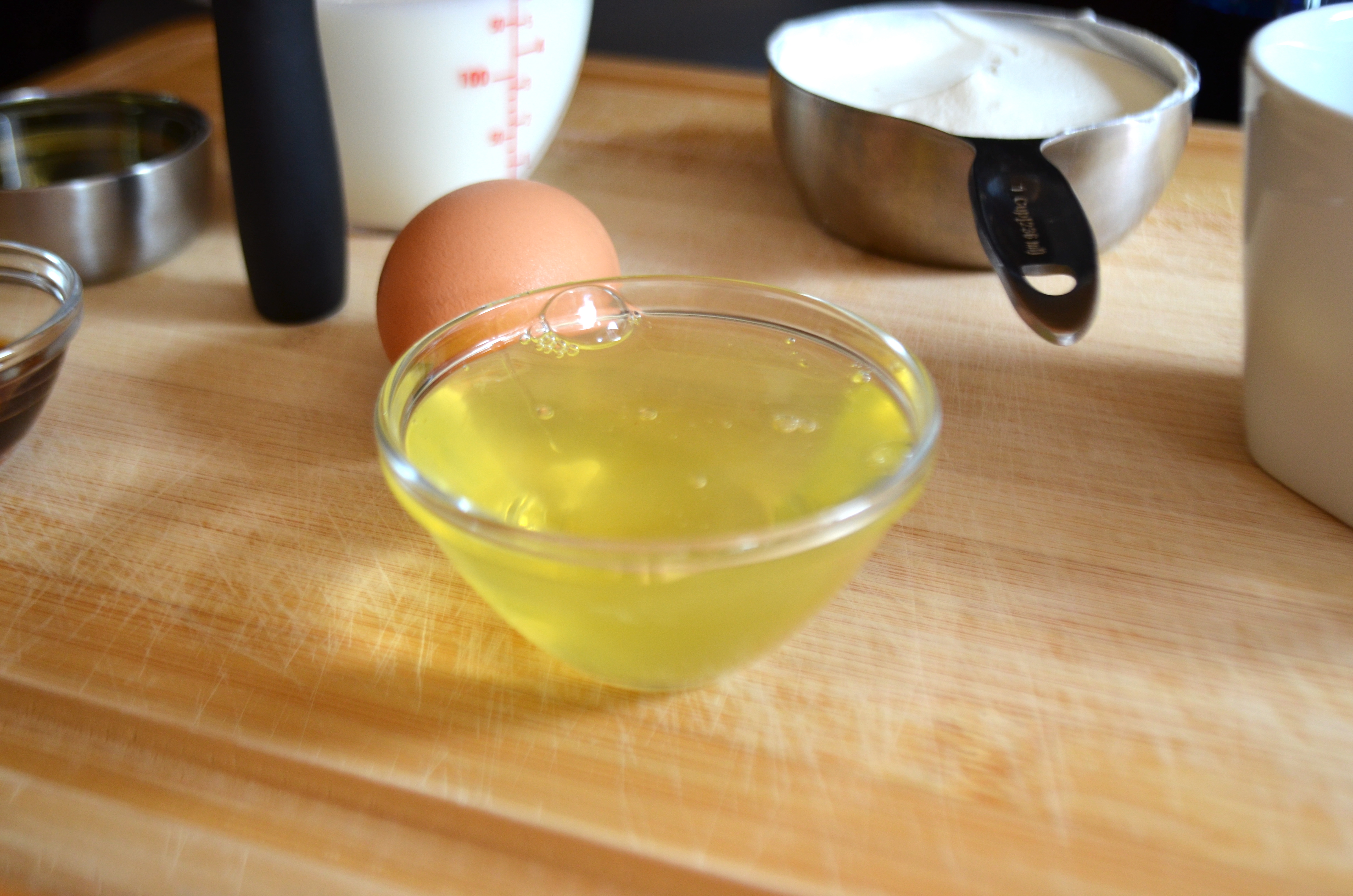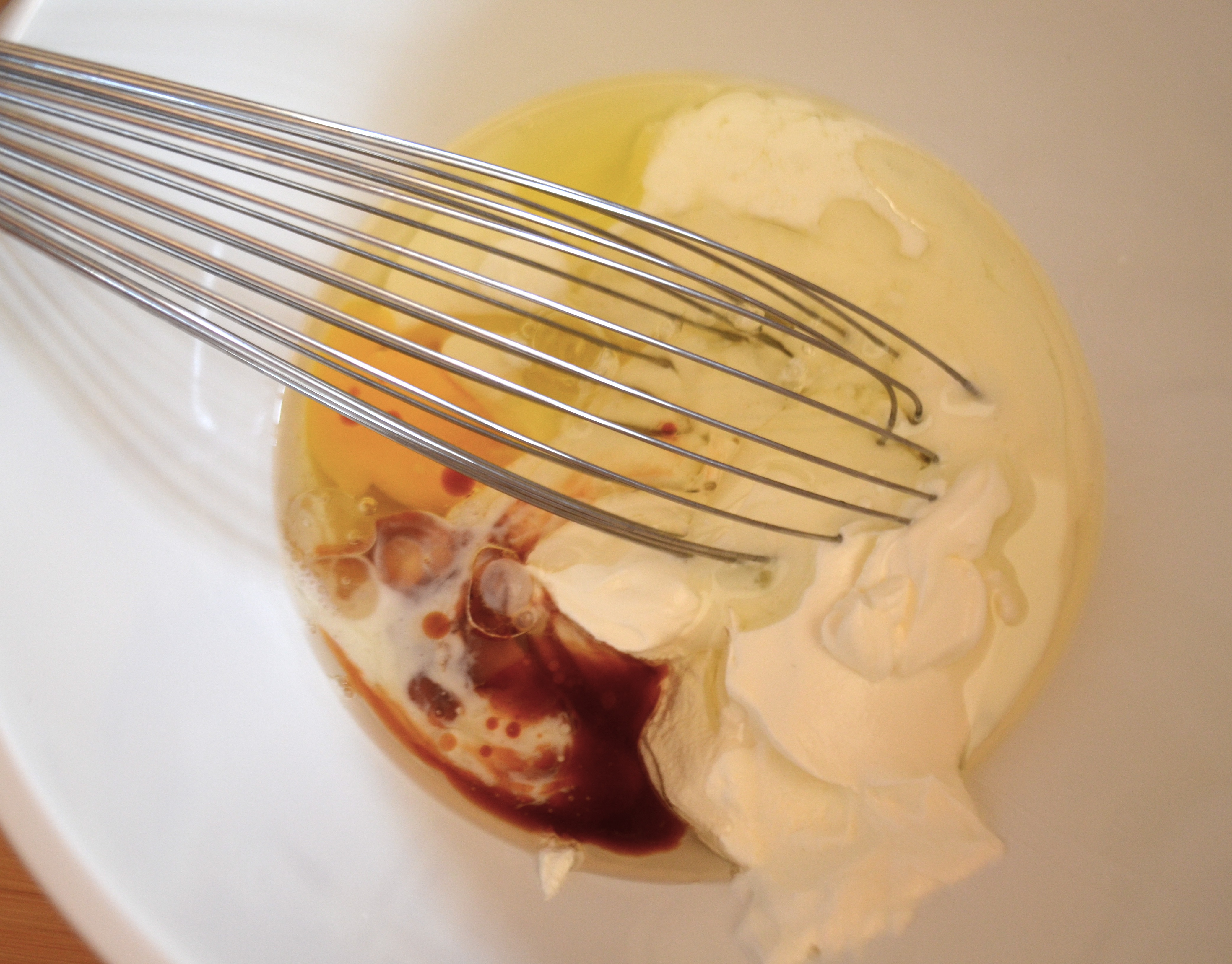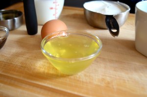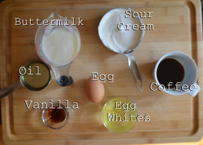 In a medium size bowl, whisk together egg whites, egg, oil, buttermilk, sour cream and vanilla.