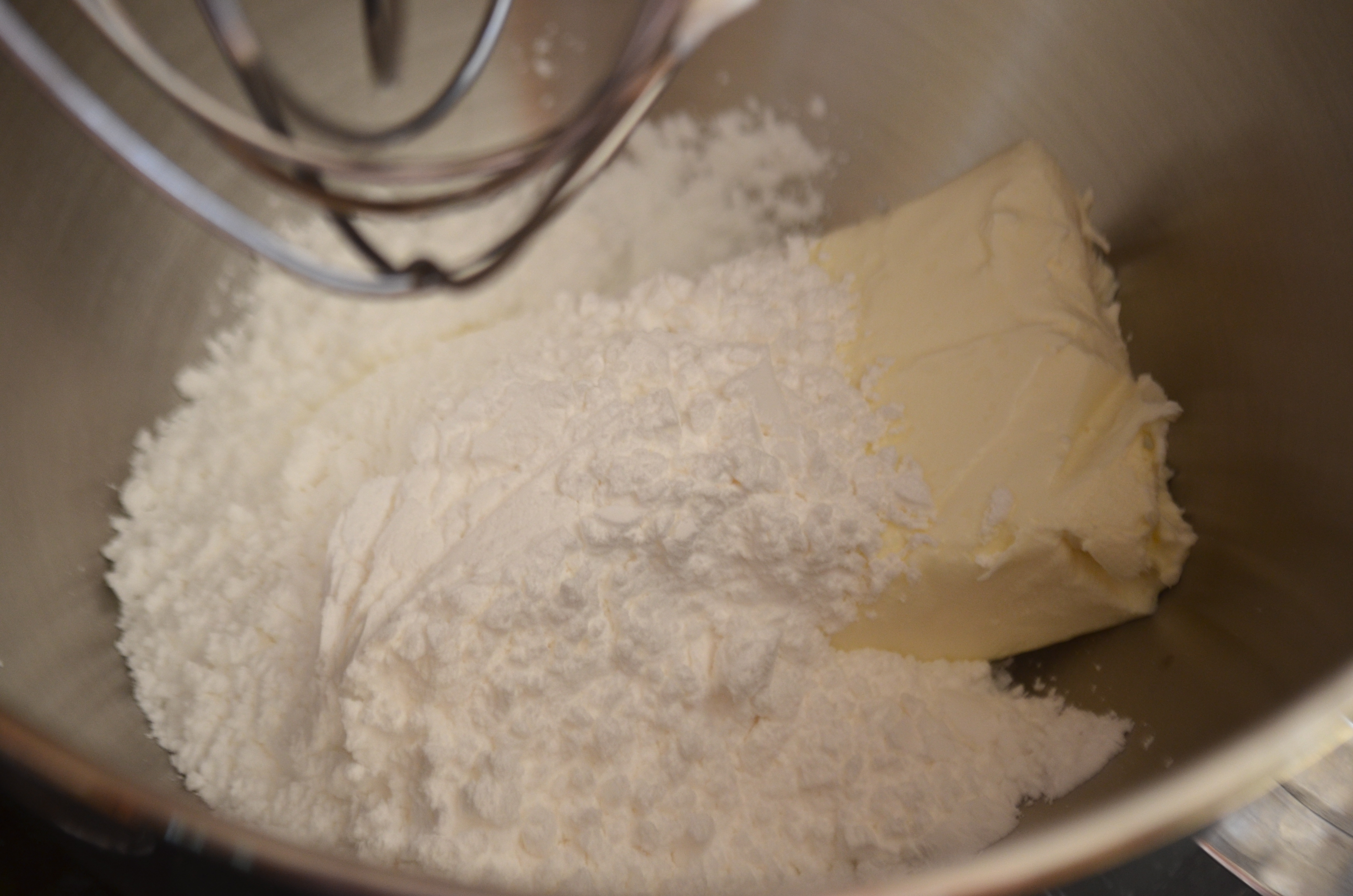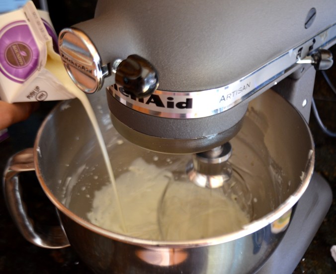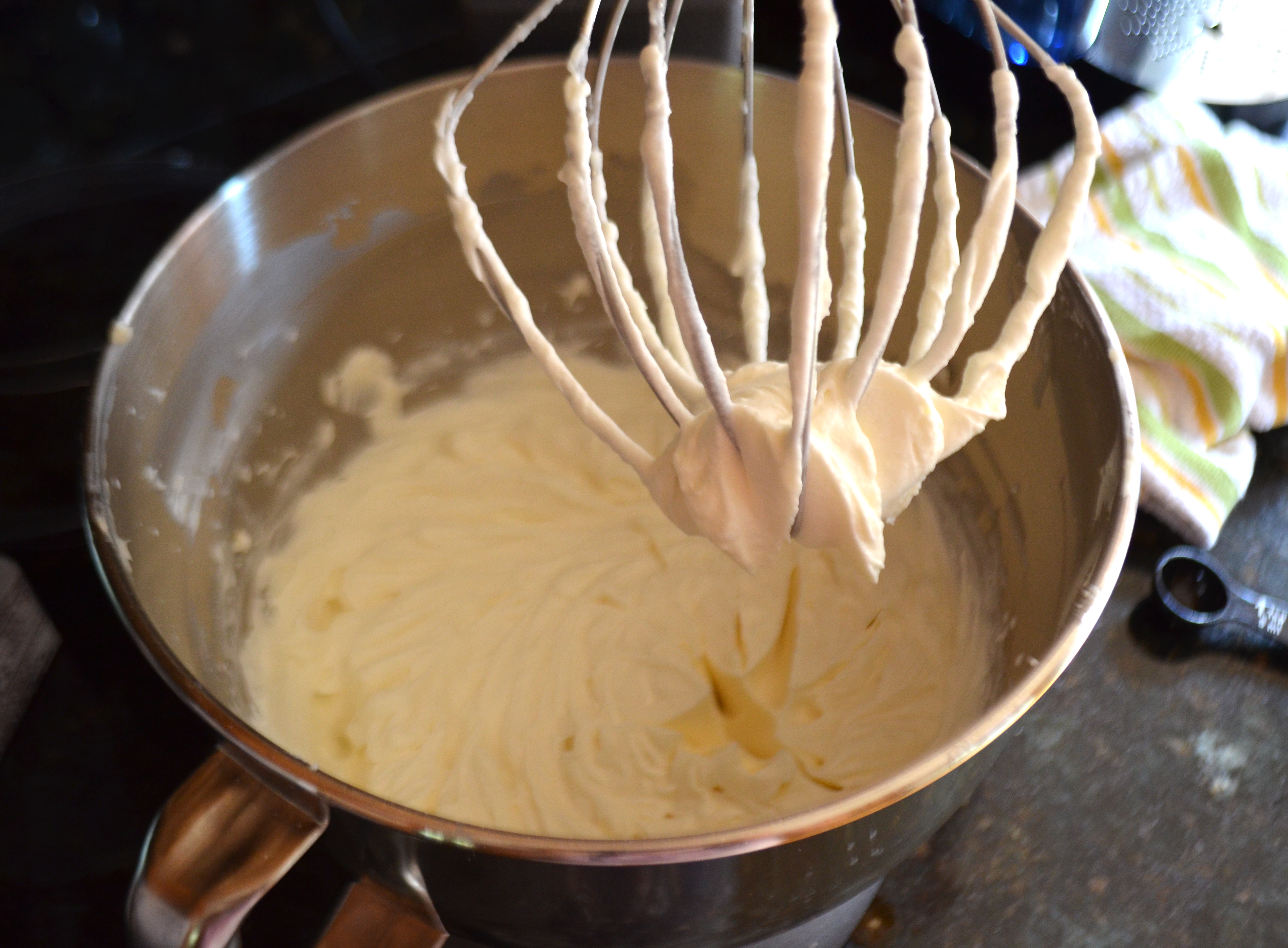 For the frosting, use the whisk attachment on your stand mixture to beat cream cheese and powdered sugar until smooth.