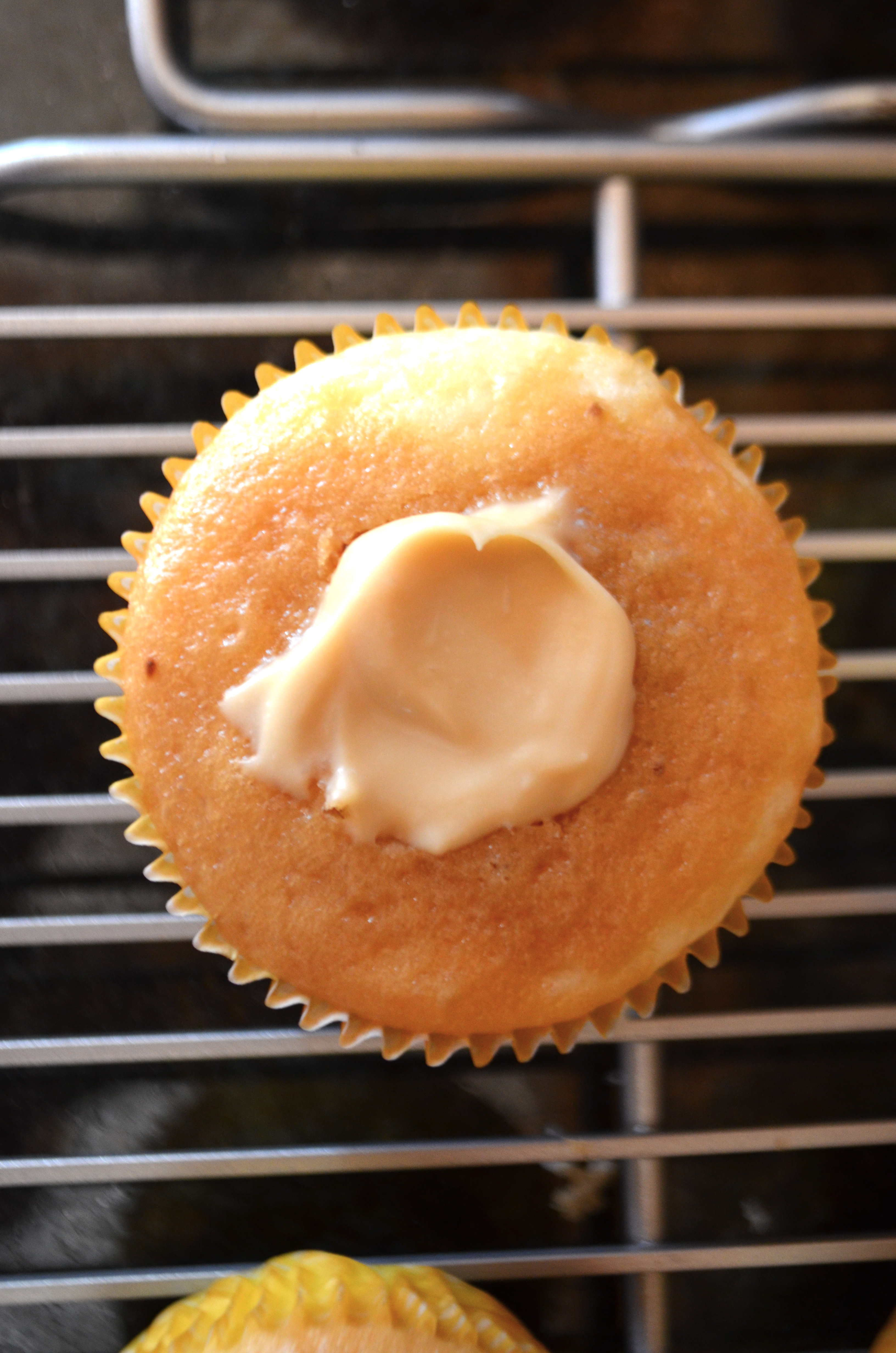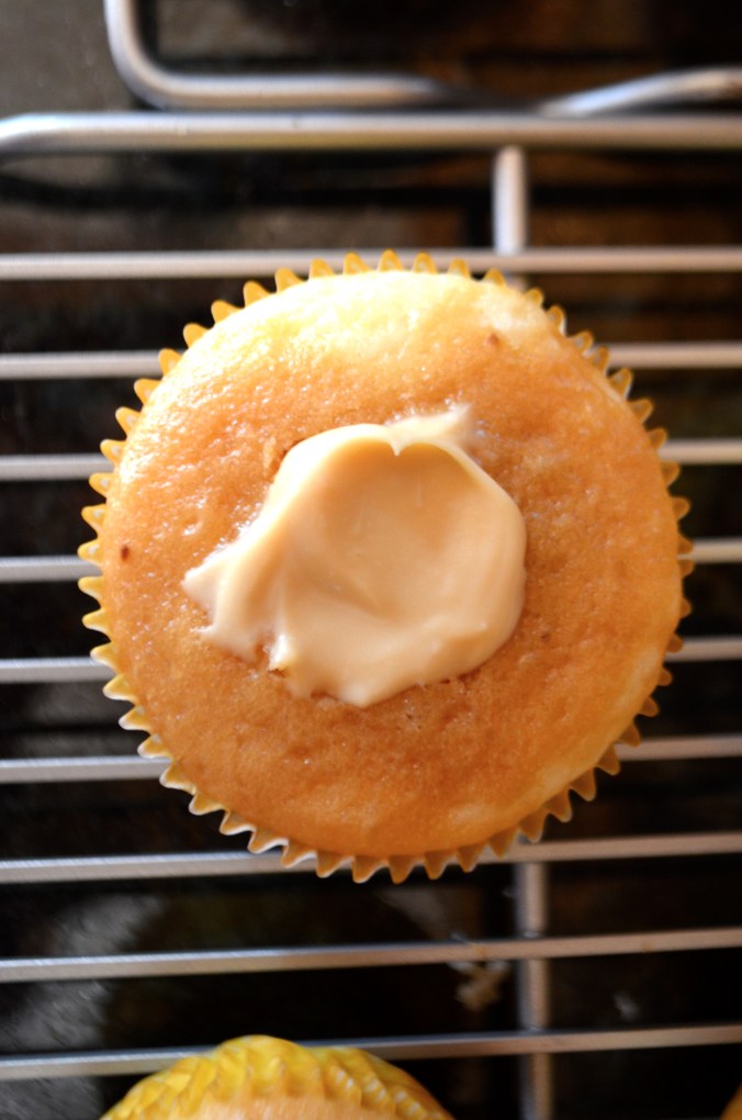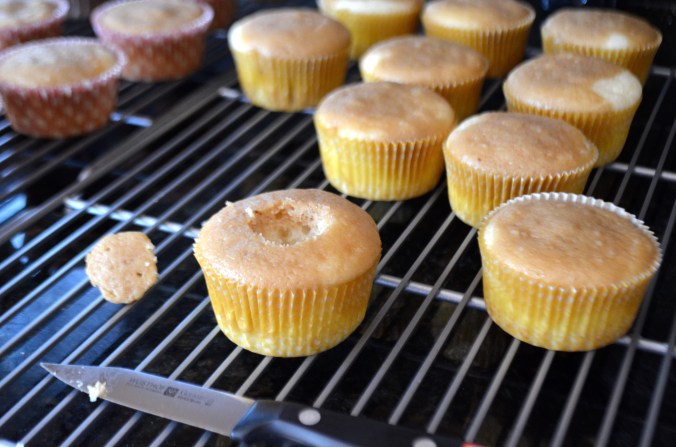 Cut a cone shaped hole into the middle of the cupcake and fill with cheese filling.