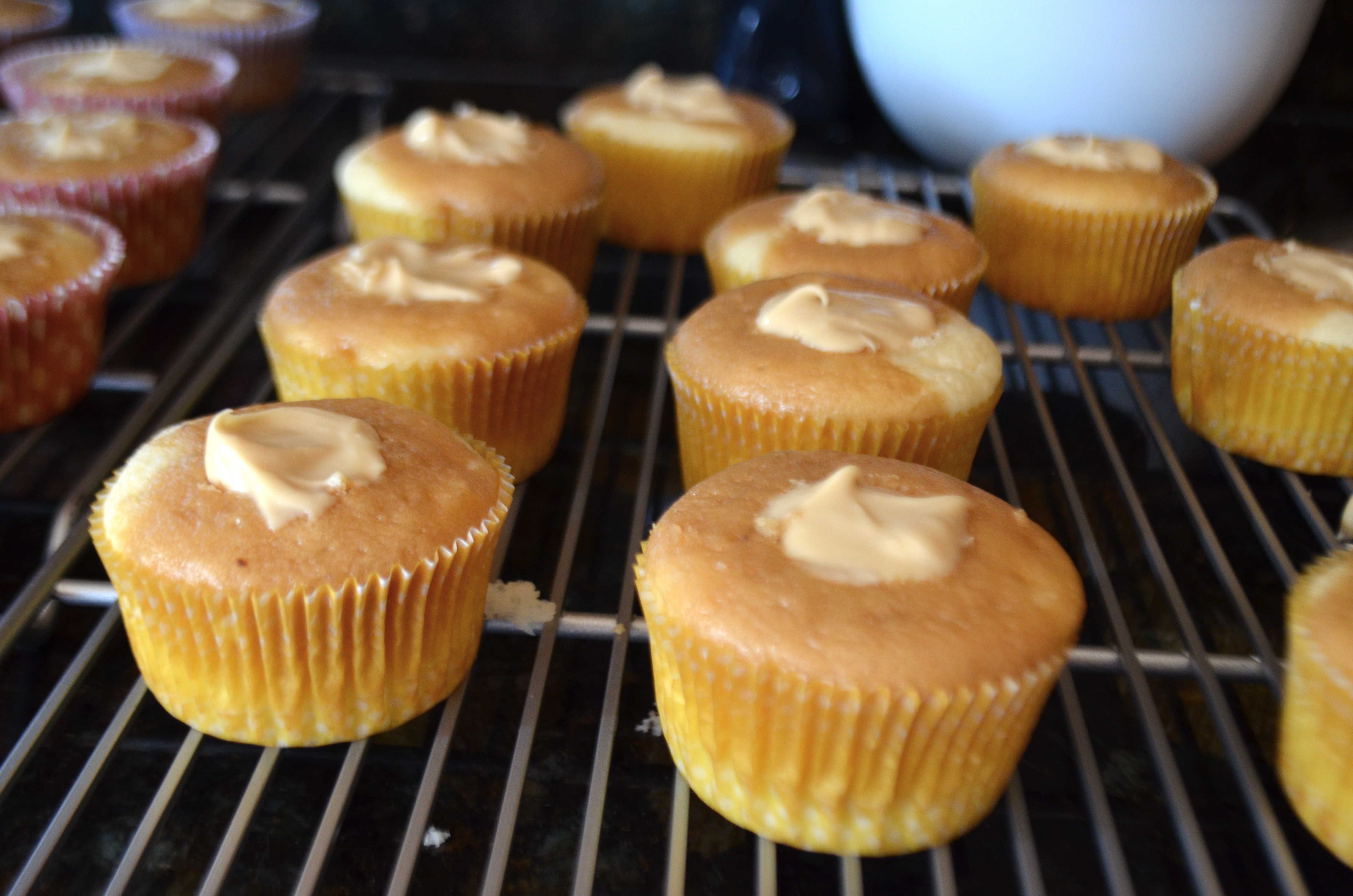 With the remaining batter add the 1/4 cup of strong coffee and mix well.  Pour remaining batter over the top of the vanilla batter cupcakes so you have a half vanilla half coffee cupcake.  Place into oven for 15-20 minutes or until a toothpick inserted into the center comes out clean.