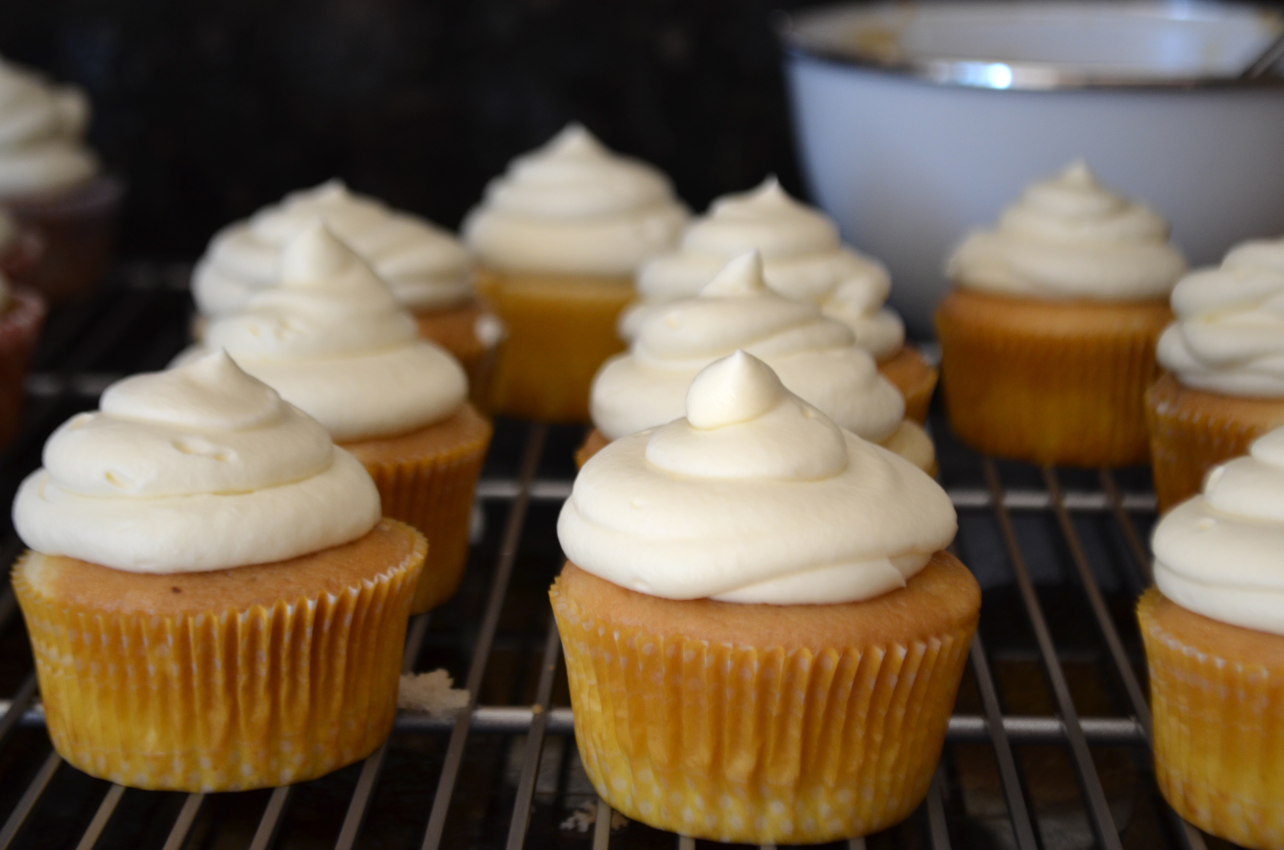 While the cupcakes cool, mix together the mascarpone cheese, coffee and powdered sugar.