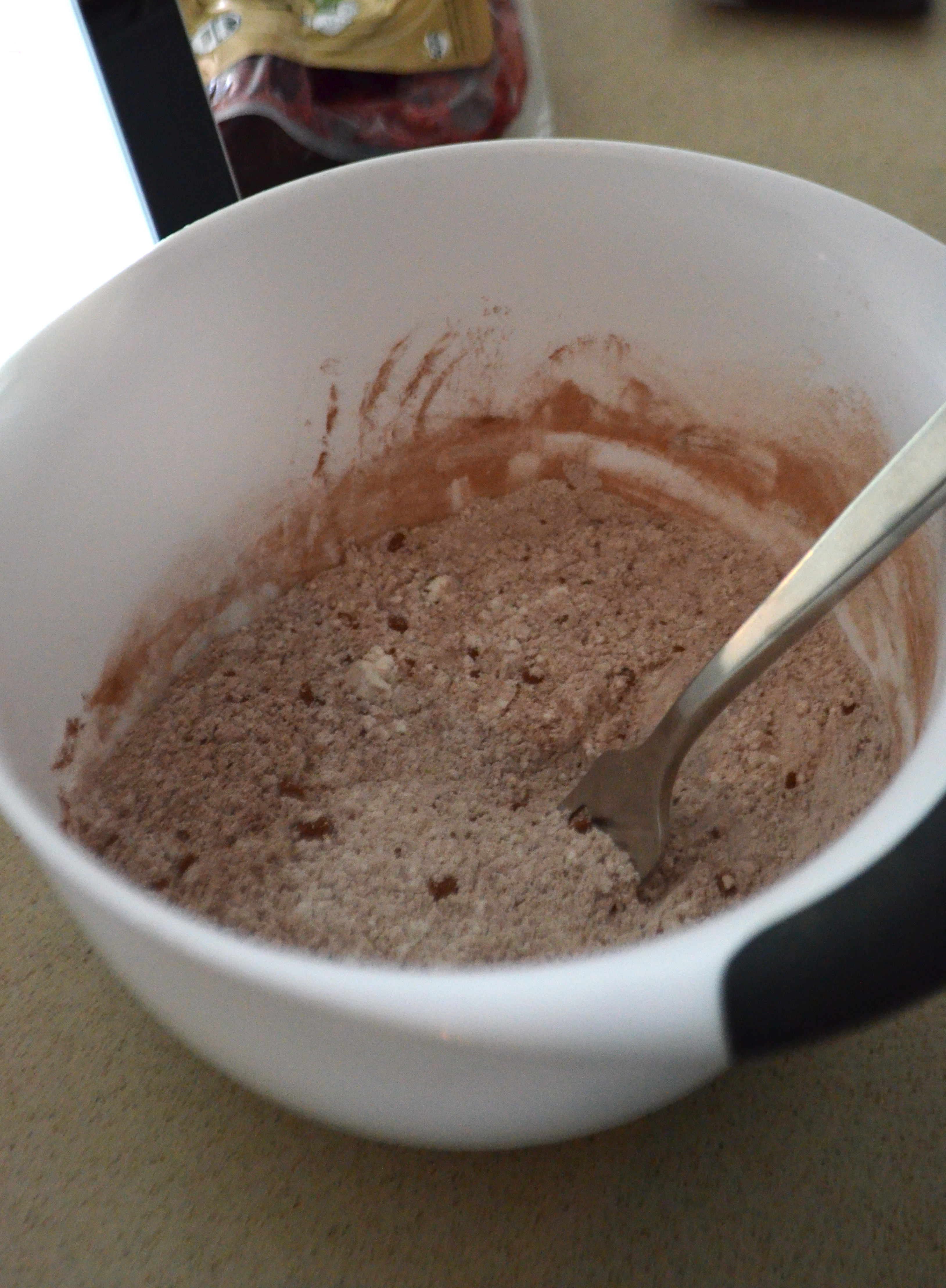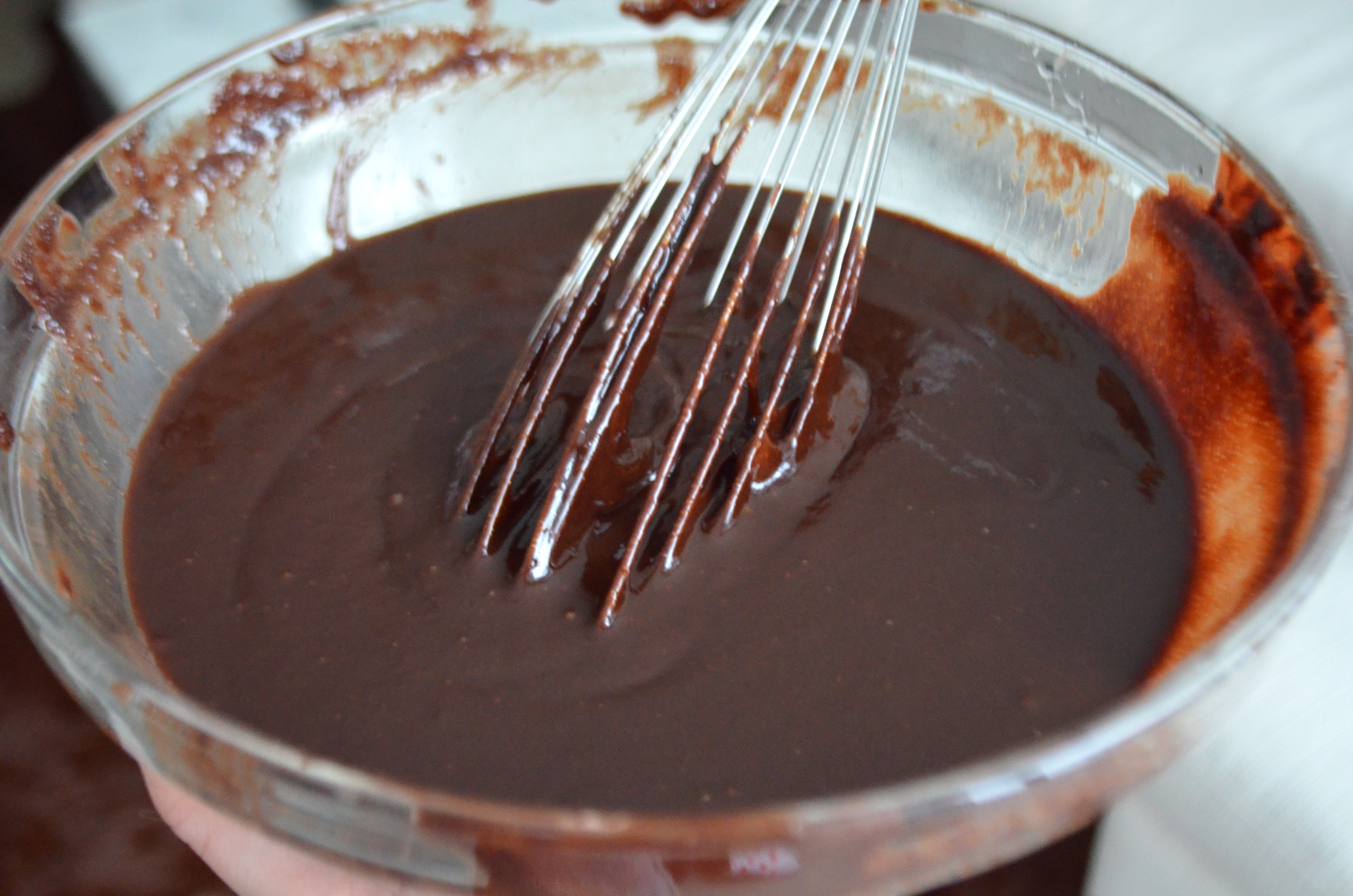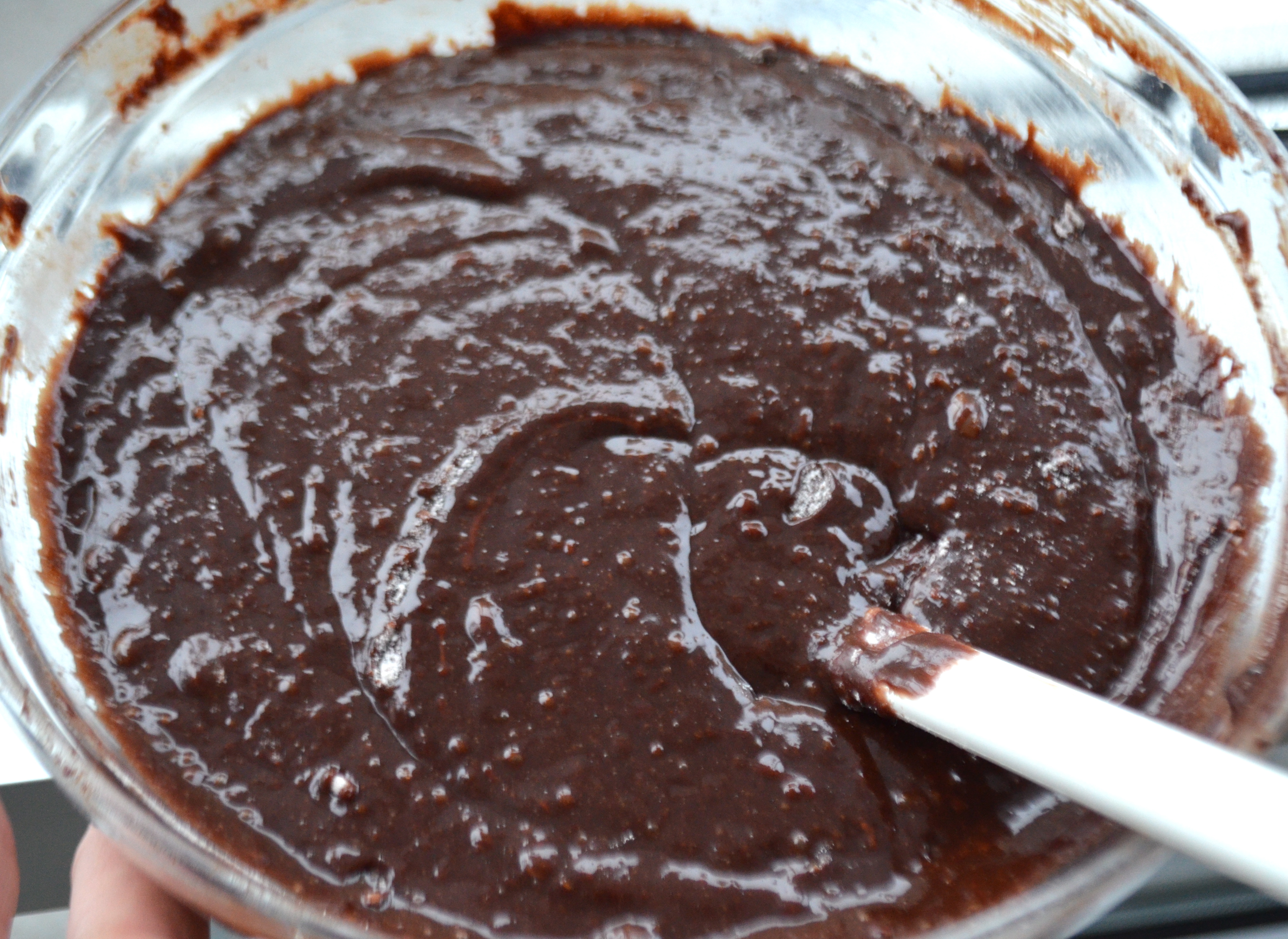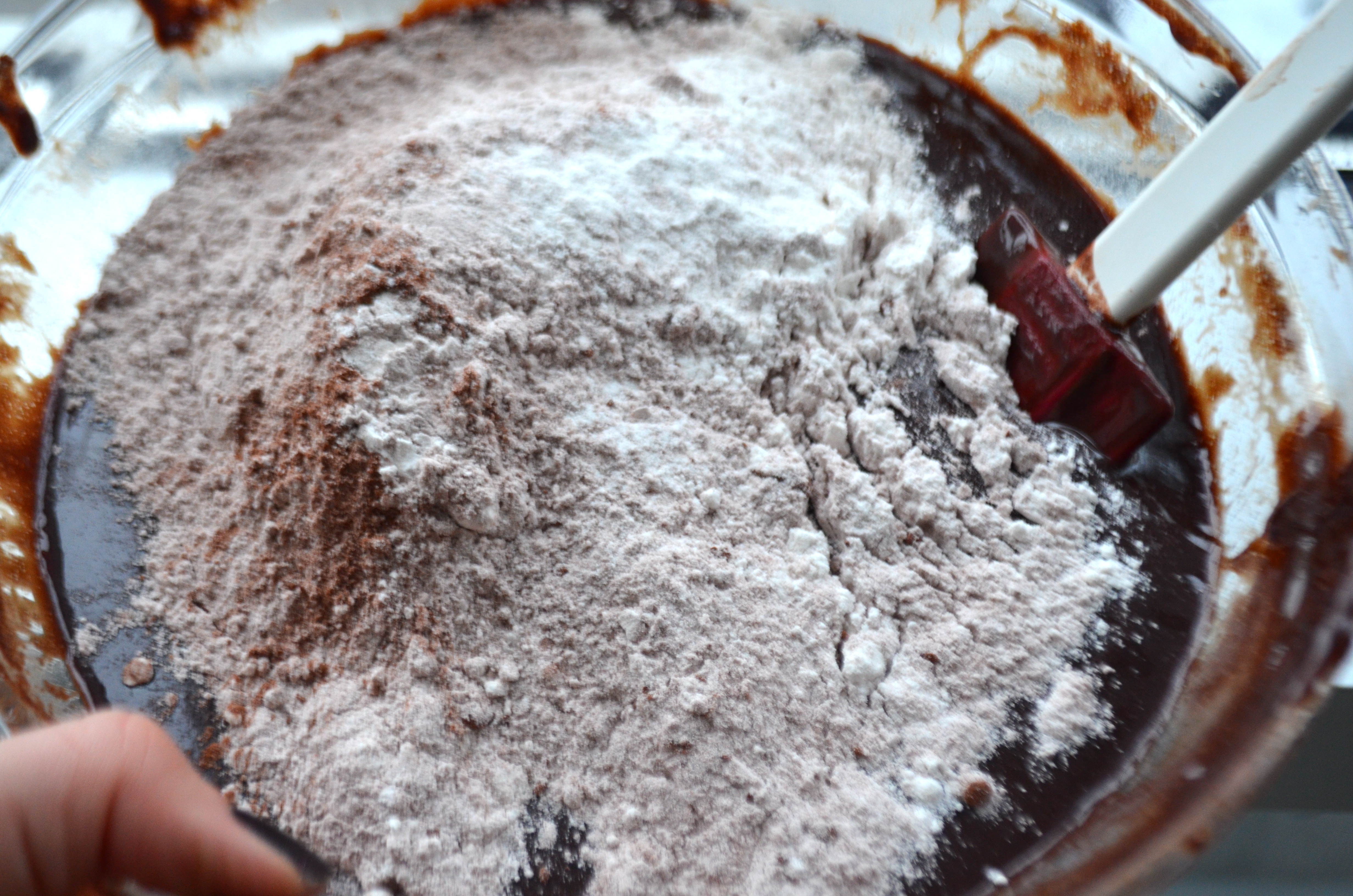 Then using a spatula, gently fold flour mixture into chocolate, barely mixing and leaving some chunks of flour in dough (as you can see in my last batter picture).