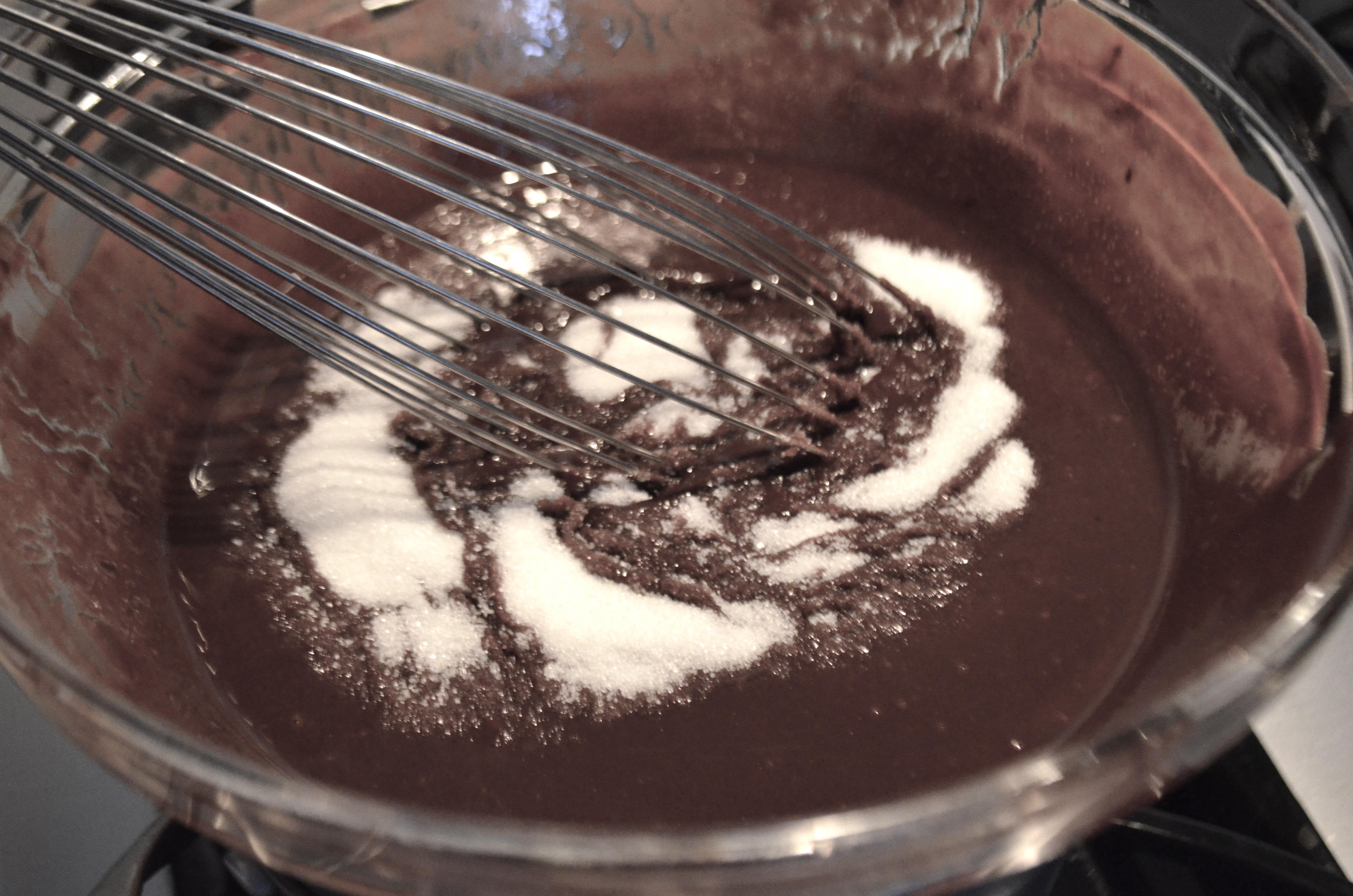 Place chocolate, butter and espresso powder in a glass bowl and set over a pot of boiling water. Let chocolate mixture melt down, stirring with a spatula until smooth. Once melted, turn off heat immediately (or before chocolate is totally melted and stir until smooth). Keep bowl over water and add sugars, whisking gently until completely melted into smooth sauce.