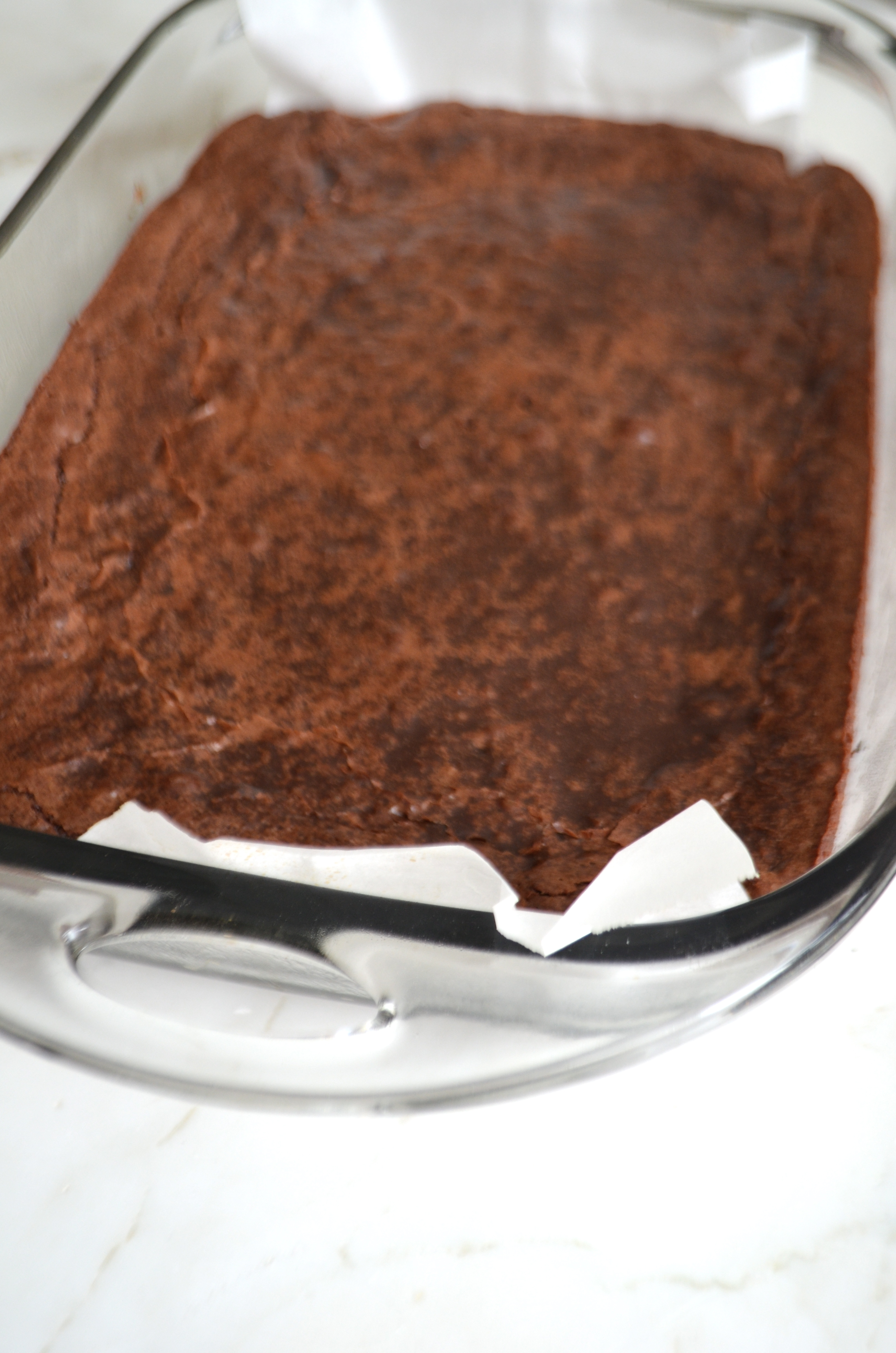 Preheat oven to 350 degrees and grease a 9×13 pan. Then cut a piece of parchment paper to size, leaving two sides long enough so you can lift baked brownies by paper out of pan.