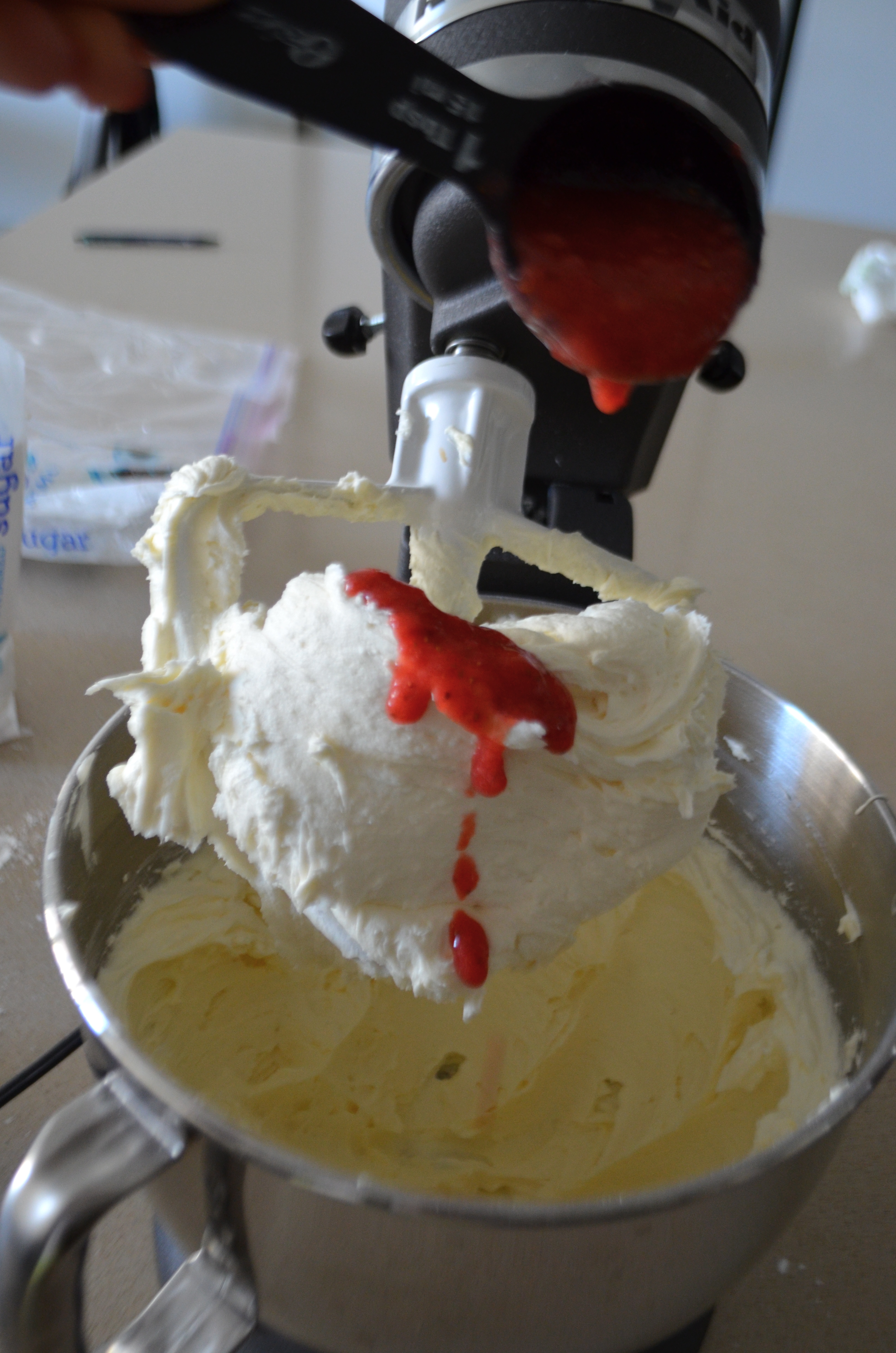If you have not already pureed your strawberries, do so by placing them in a food processor and mixing until a sauce forms. If you make the strawberry cupcakes, just make sure you have about 3 tablespoons reserved for the frosting.