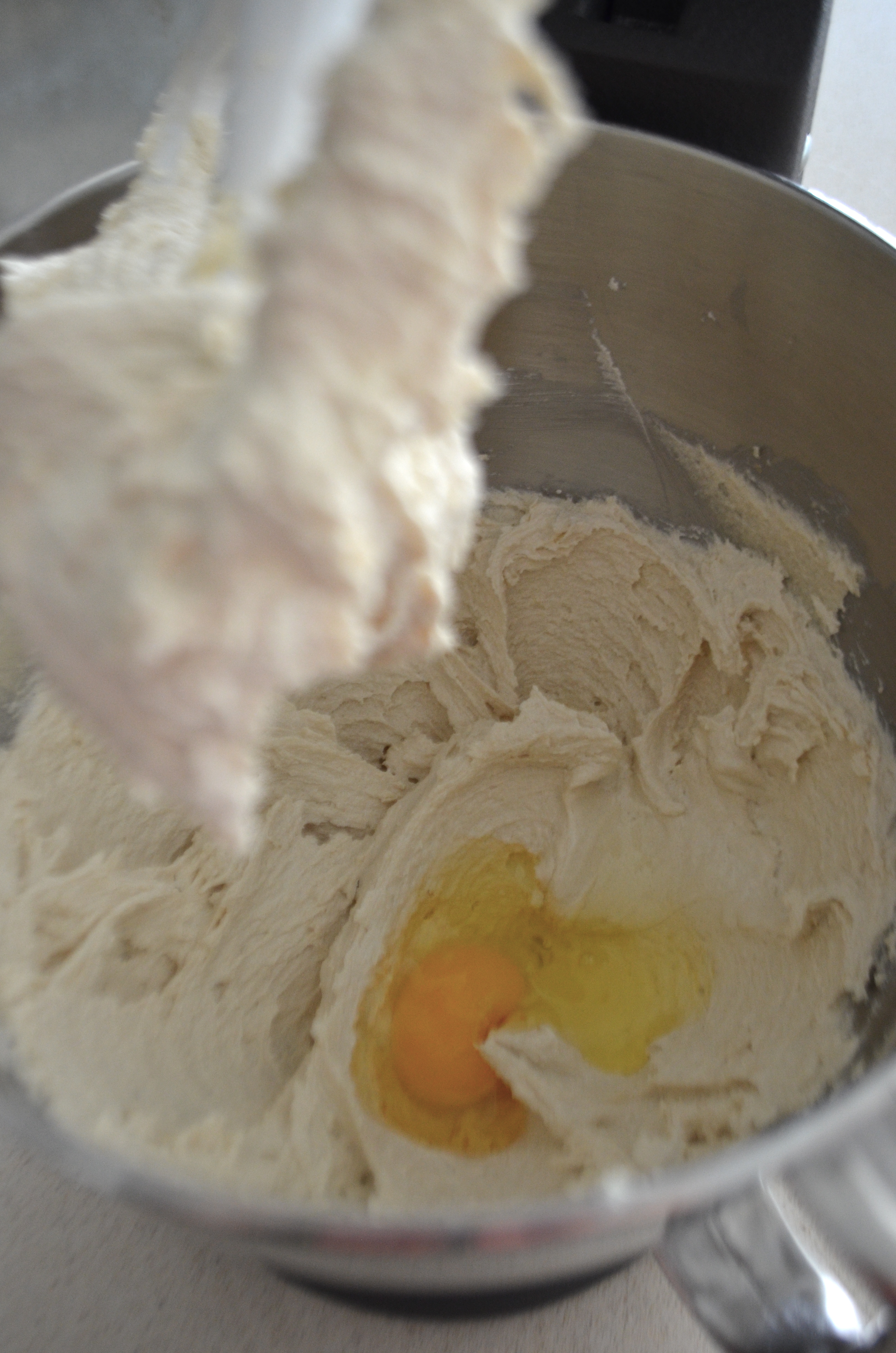 Add egg and vanilla to butter mixture and cream together, beating well until combined.