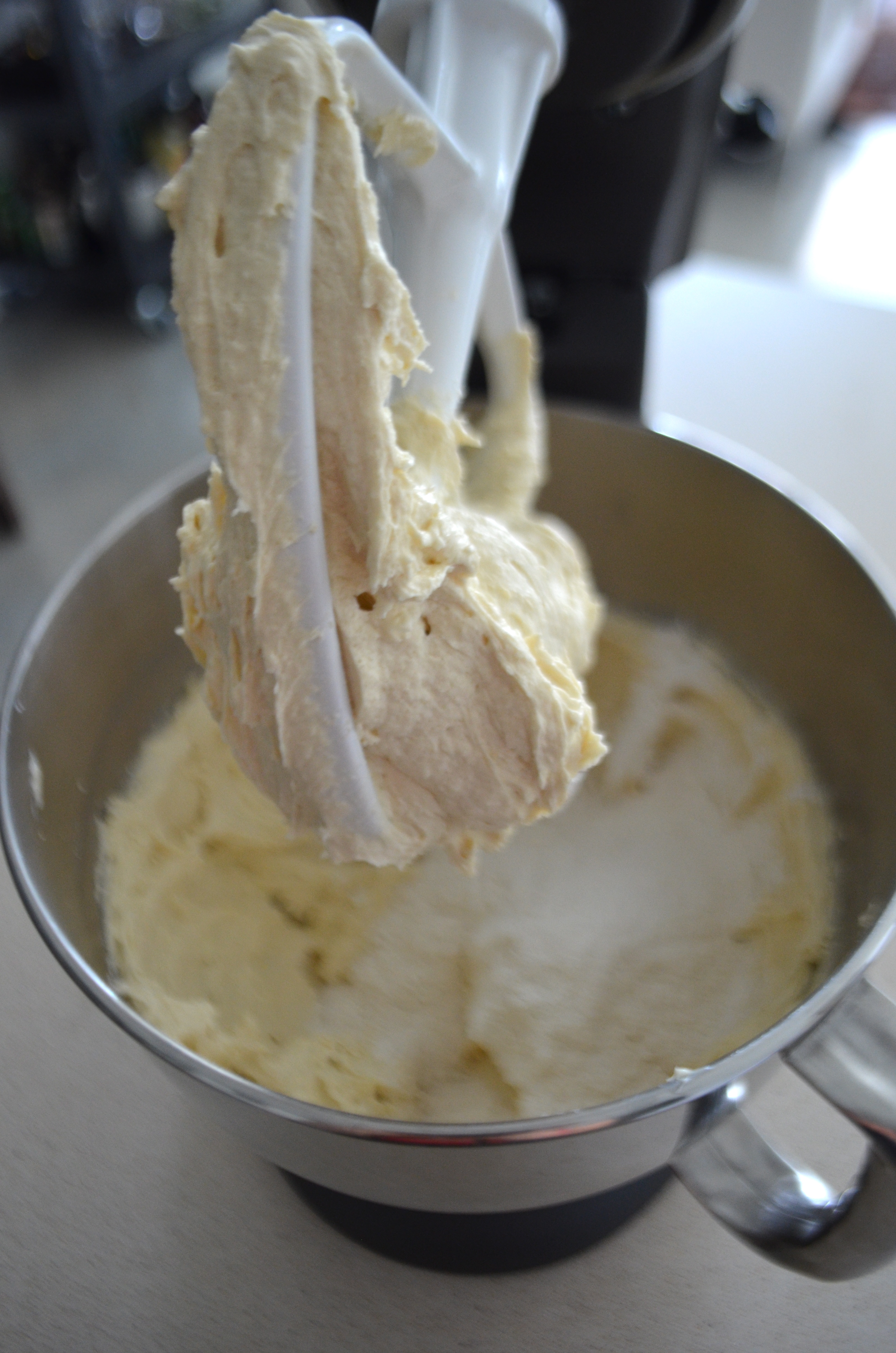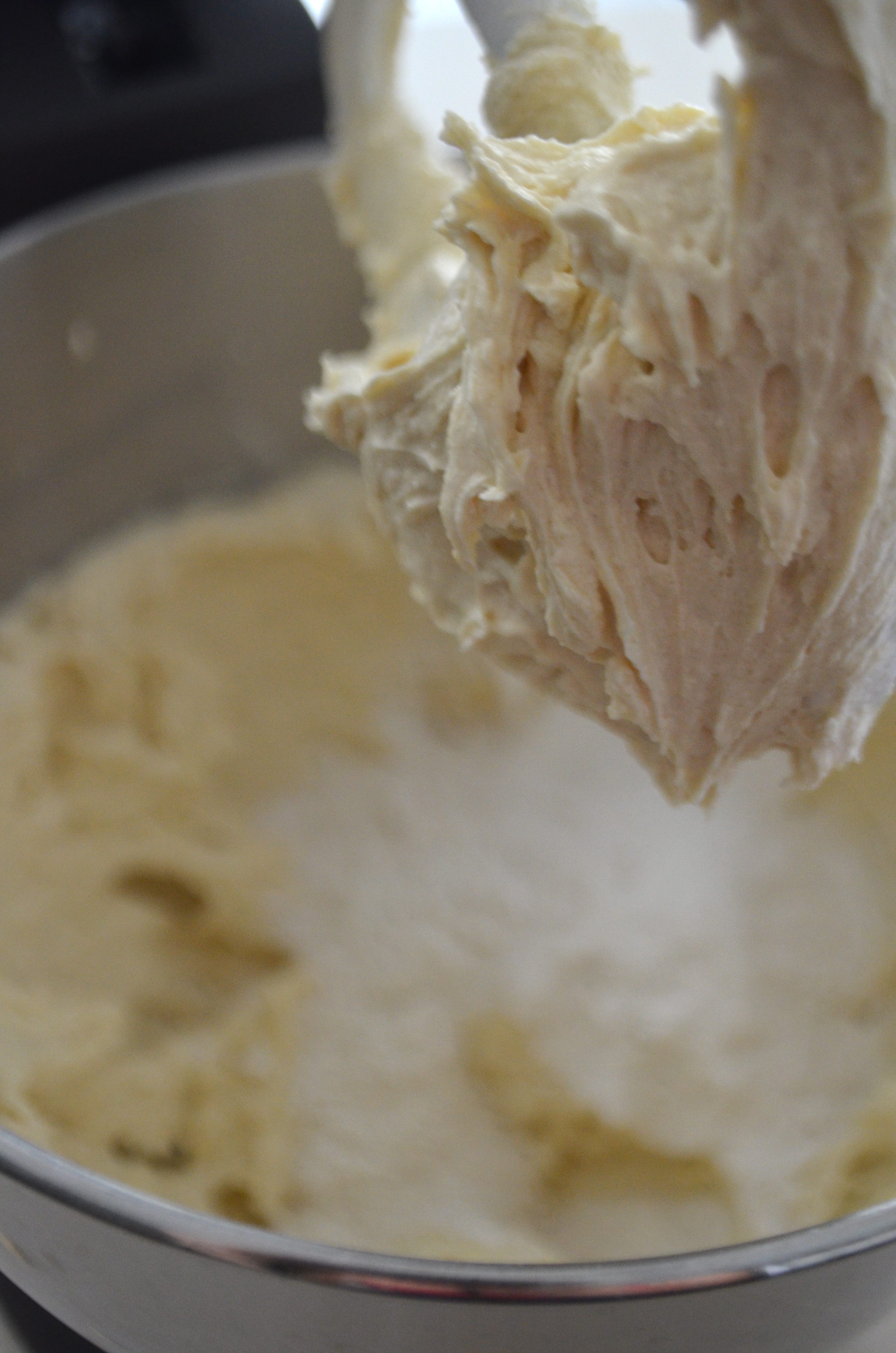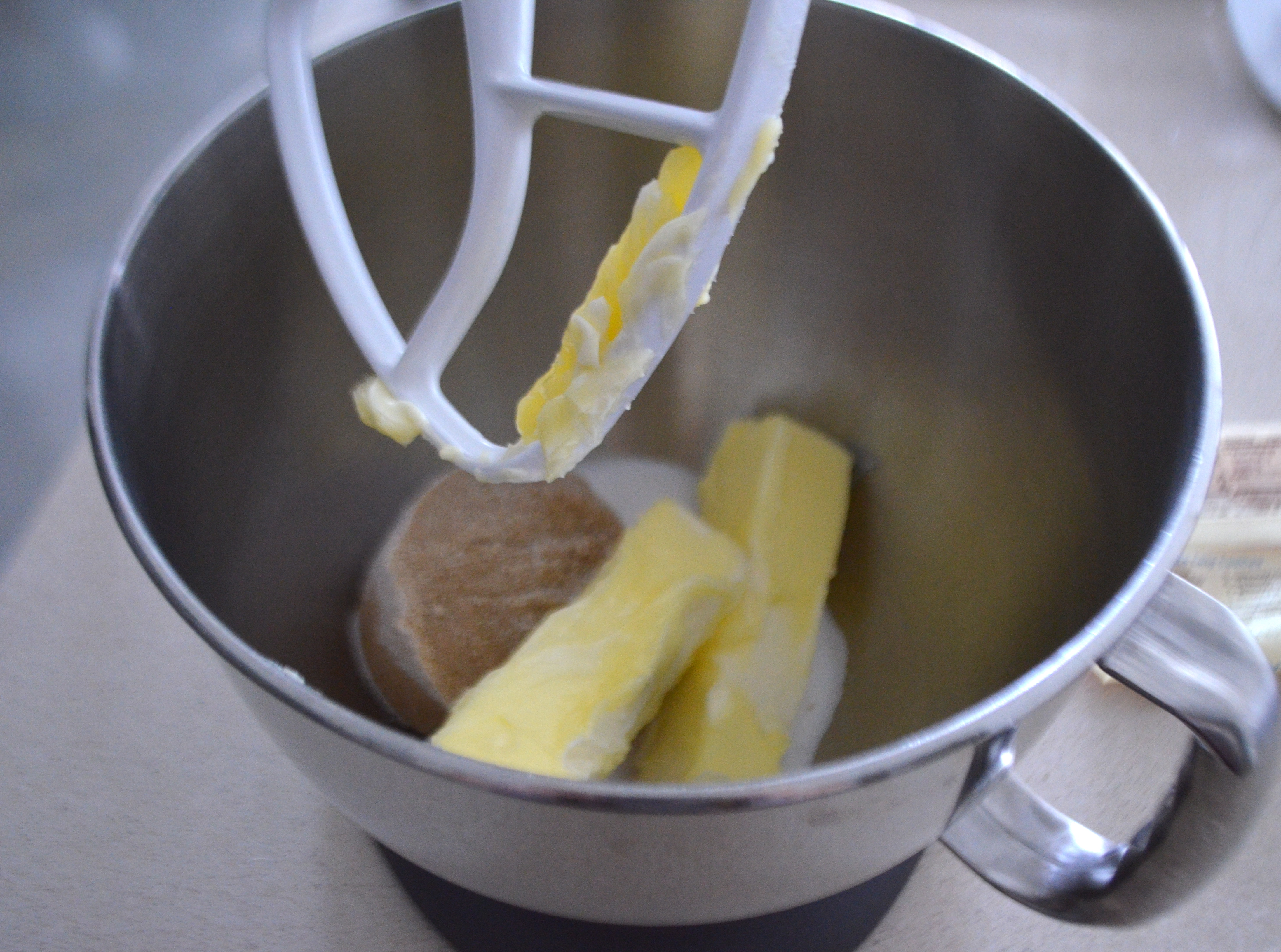 In the bowl of an electric mixer, combine room temp butter and sugars, beating well on medium speed, scraping sides periodically until well mixed and fluffy.