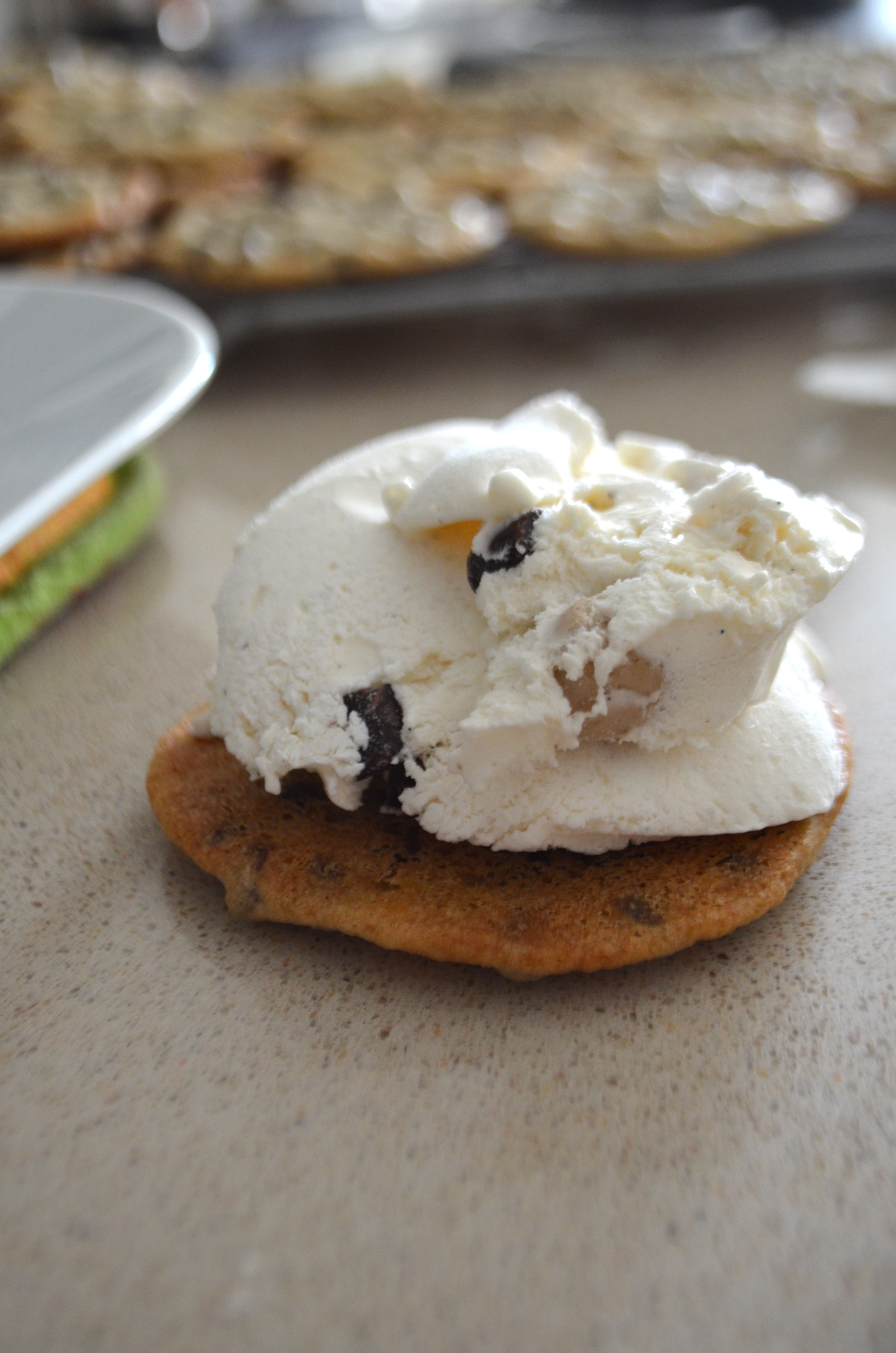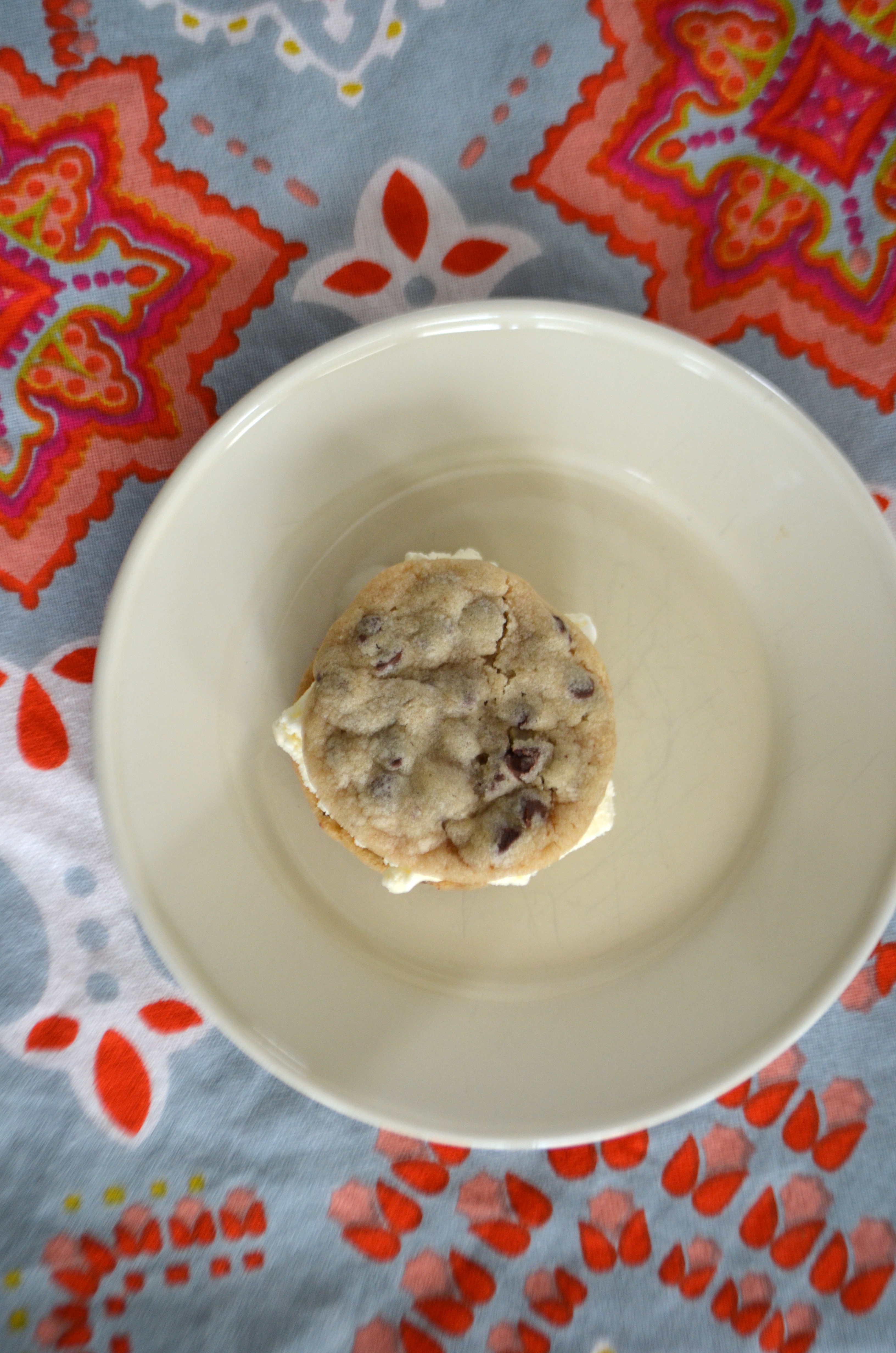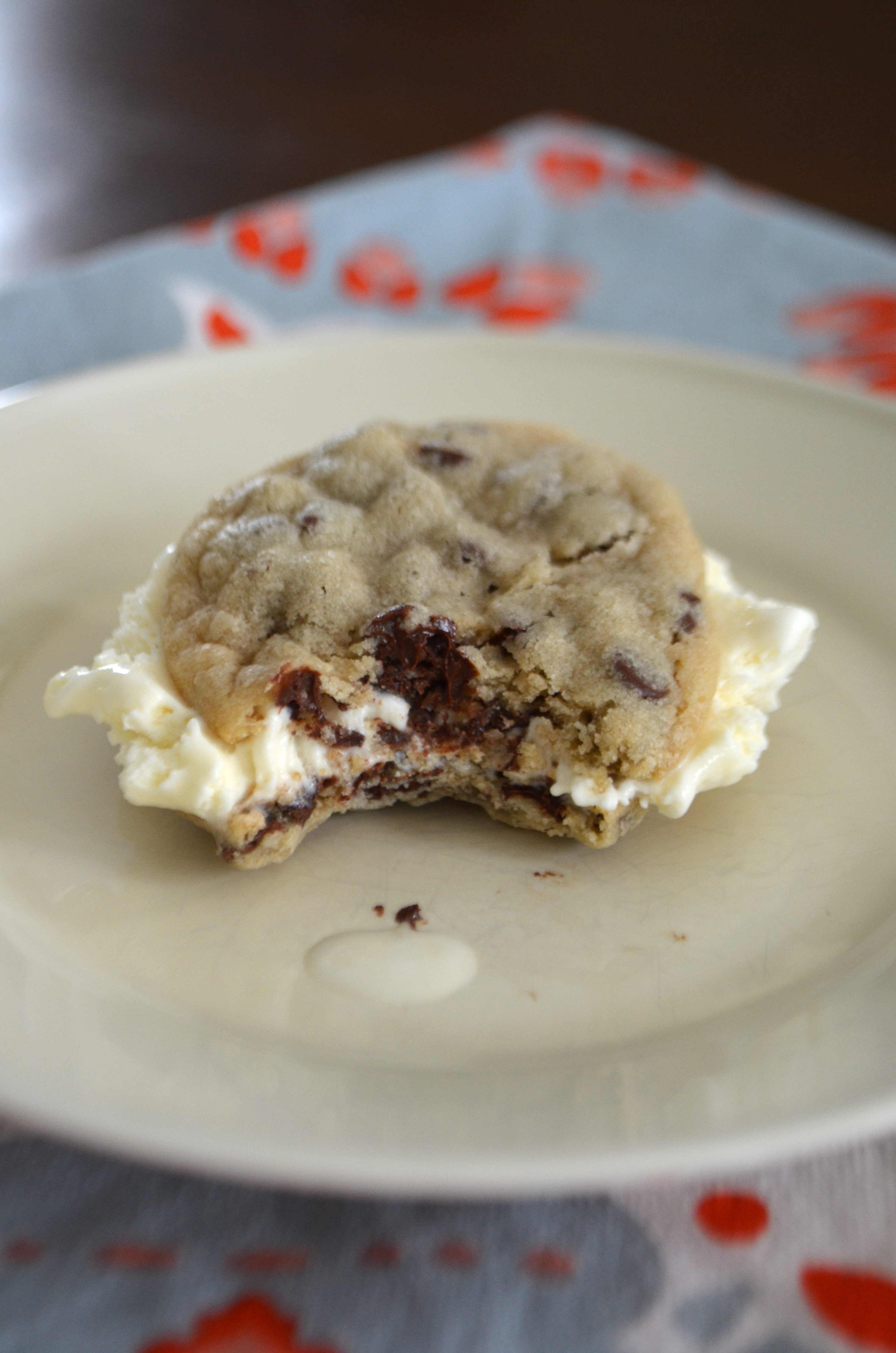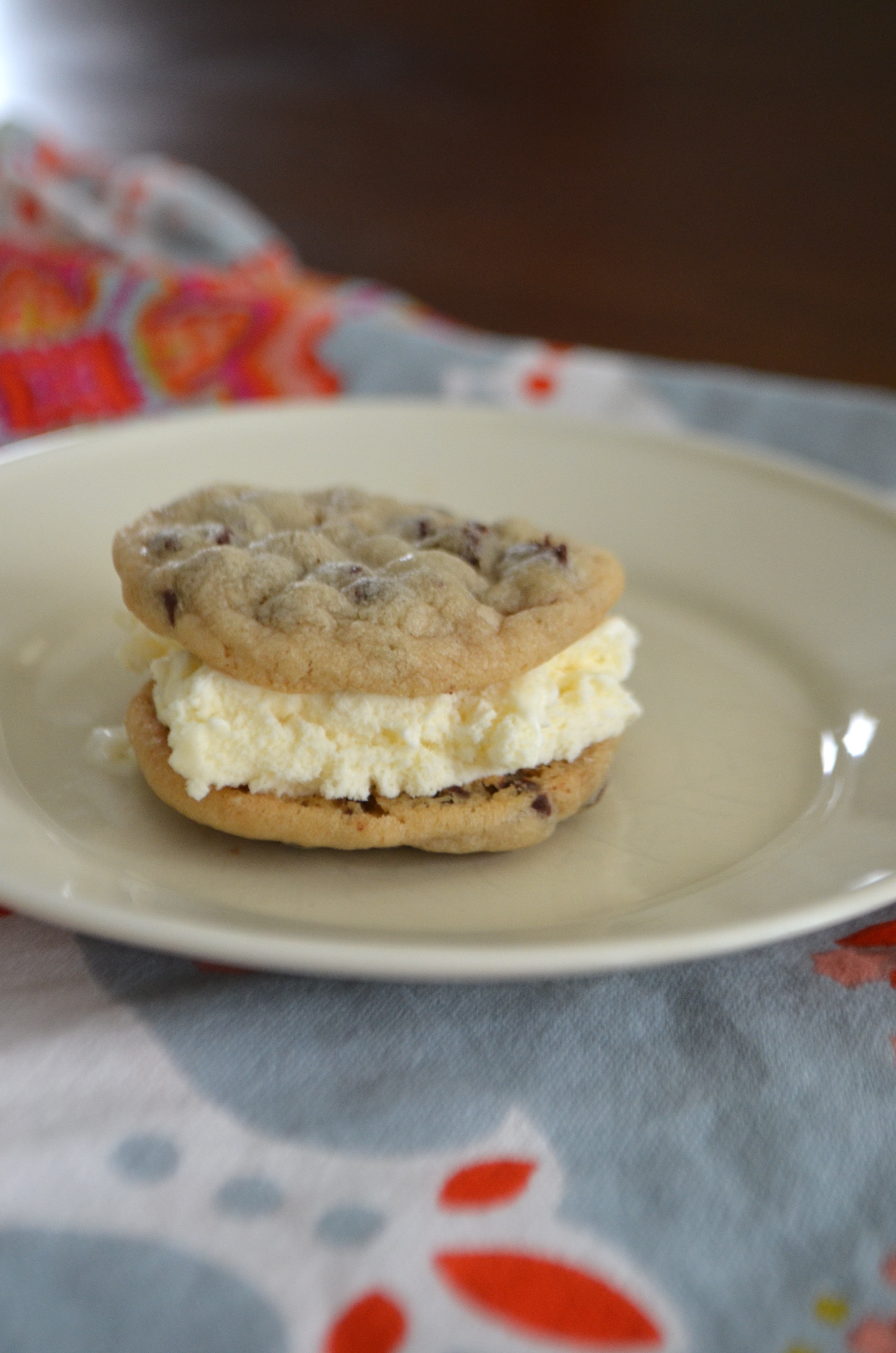 They came about sort-of by accident. I needed to make a dessert and It was super hot out so I didn’t want anything that would take long in the oven. I had a bag of mini-chocolate chips and decided to make some little chocolate chip cookies. I then decided to go further and stick a scoop of ice cream in the middle and make sandwiches. Who knew they would be such a hit!