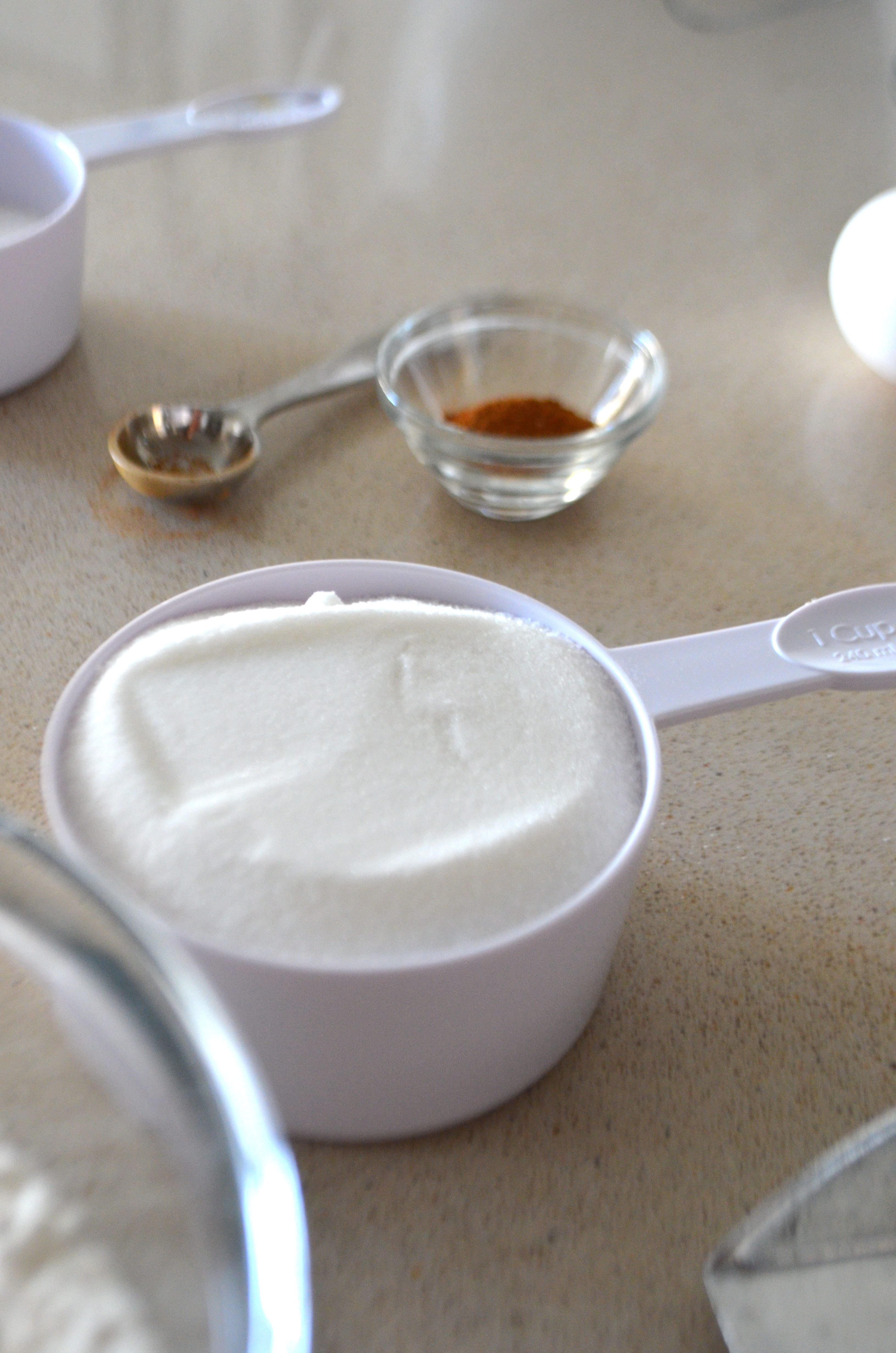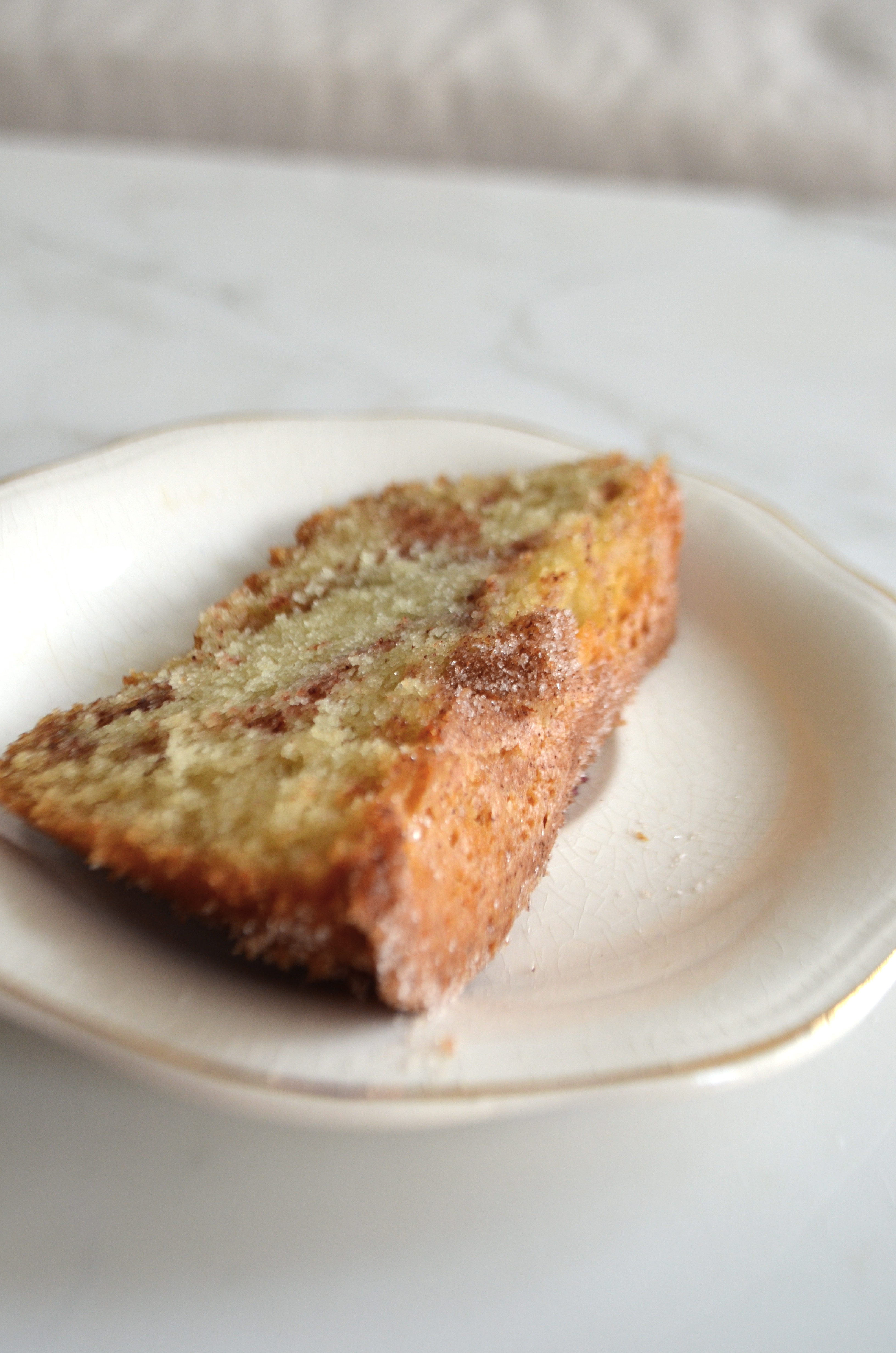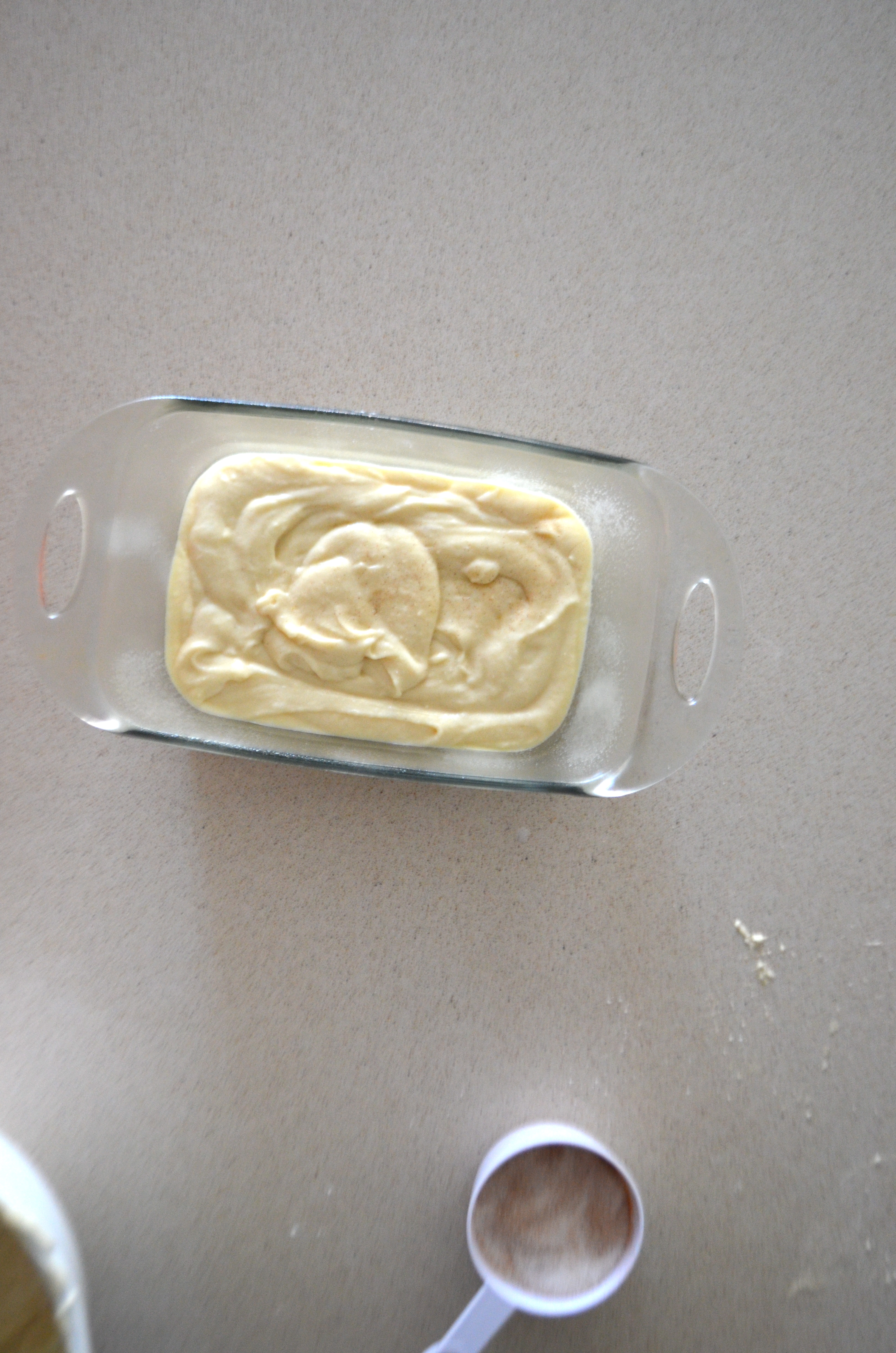 Pour half the batter into your loaf pan and then sprinkle with half the cinnamon and sugar mix.