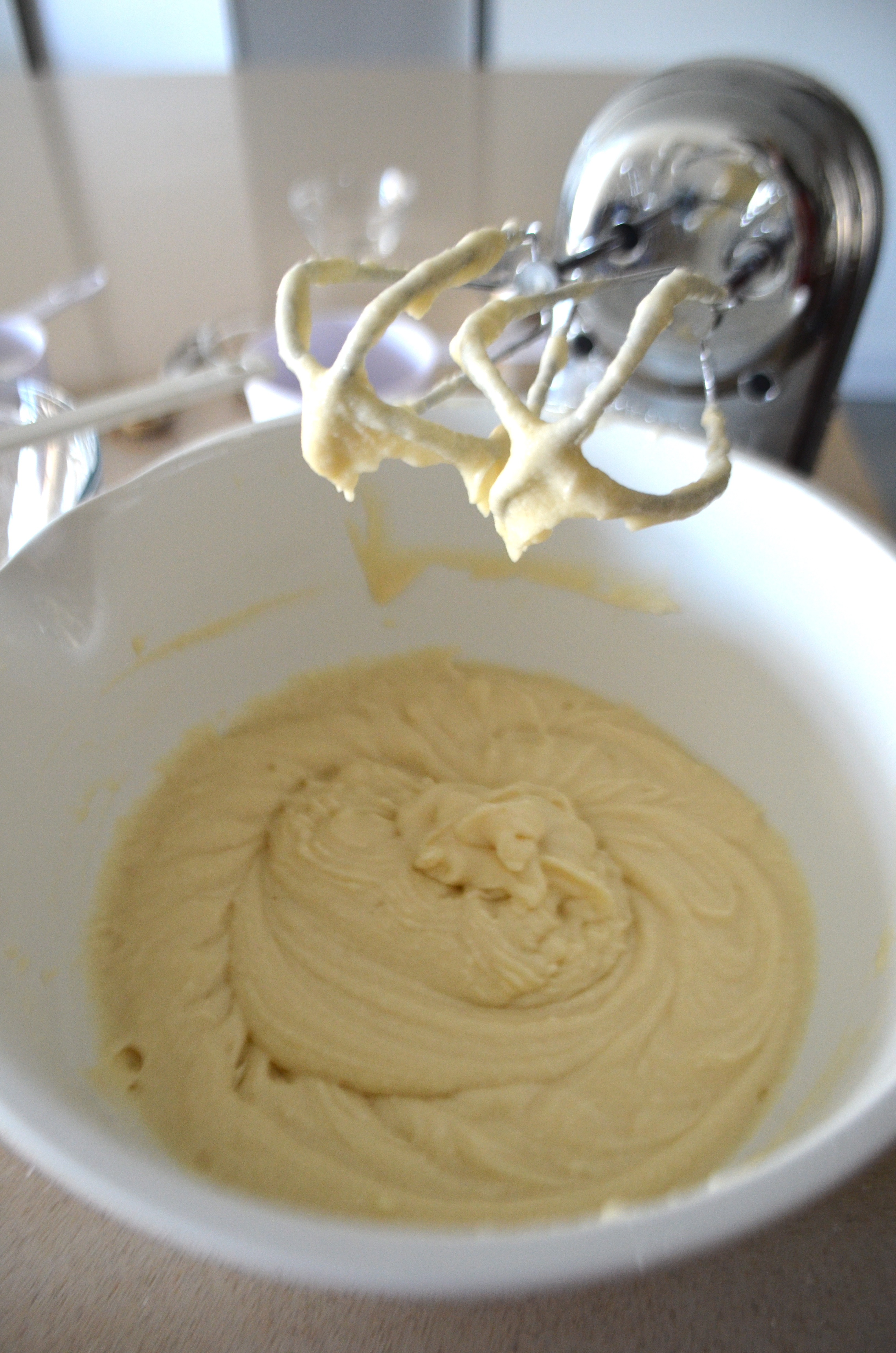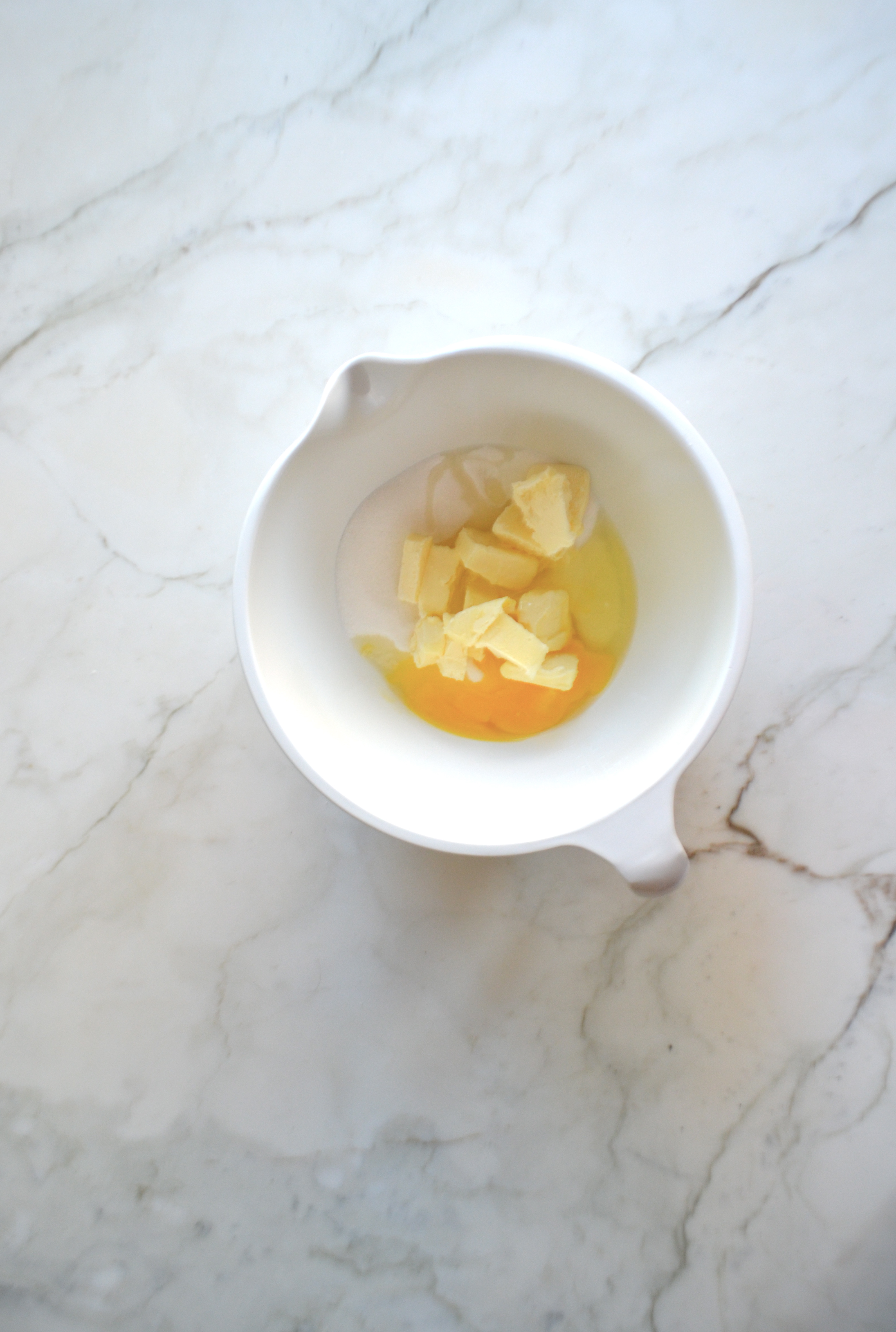 Cream butter and sugar together in the bowl of an electric mixer or in a medium bowl with a hand mixer.