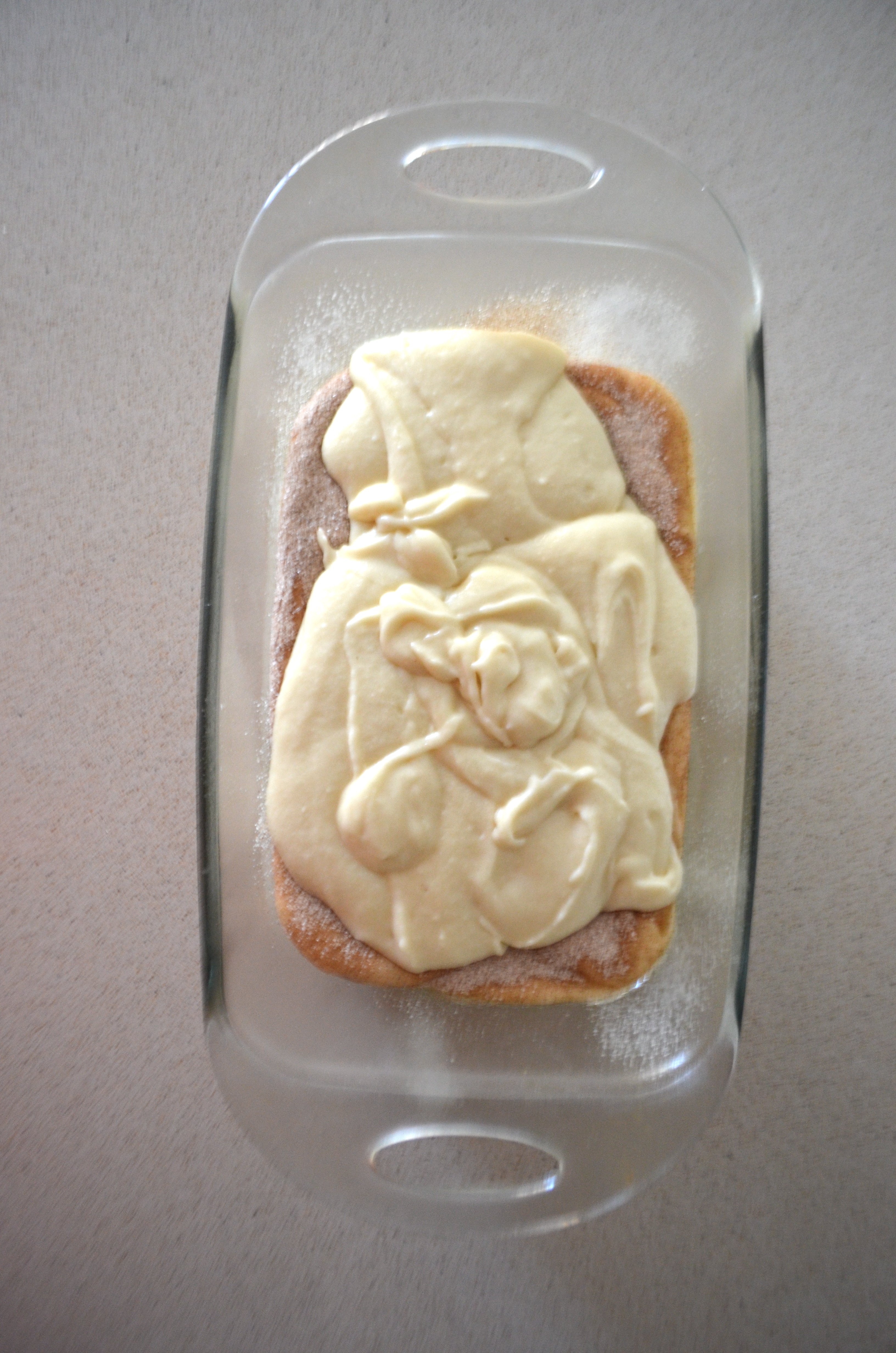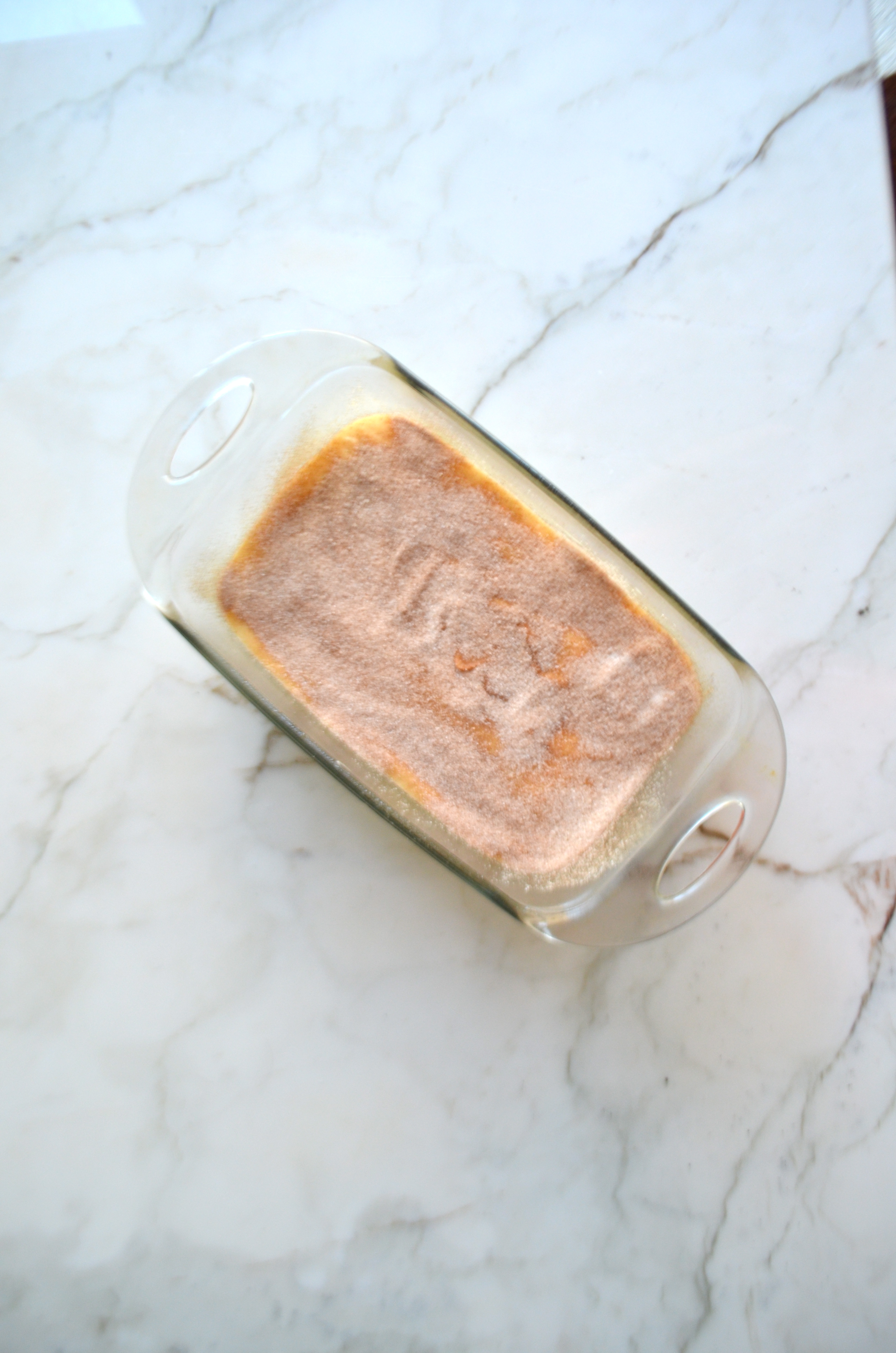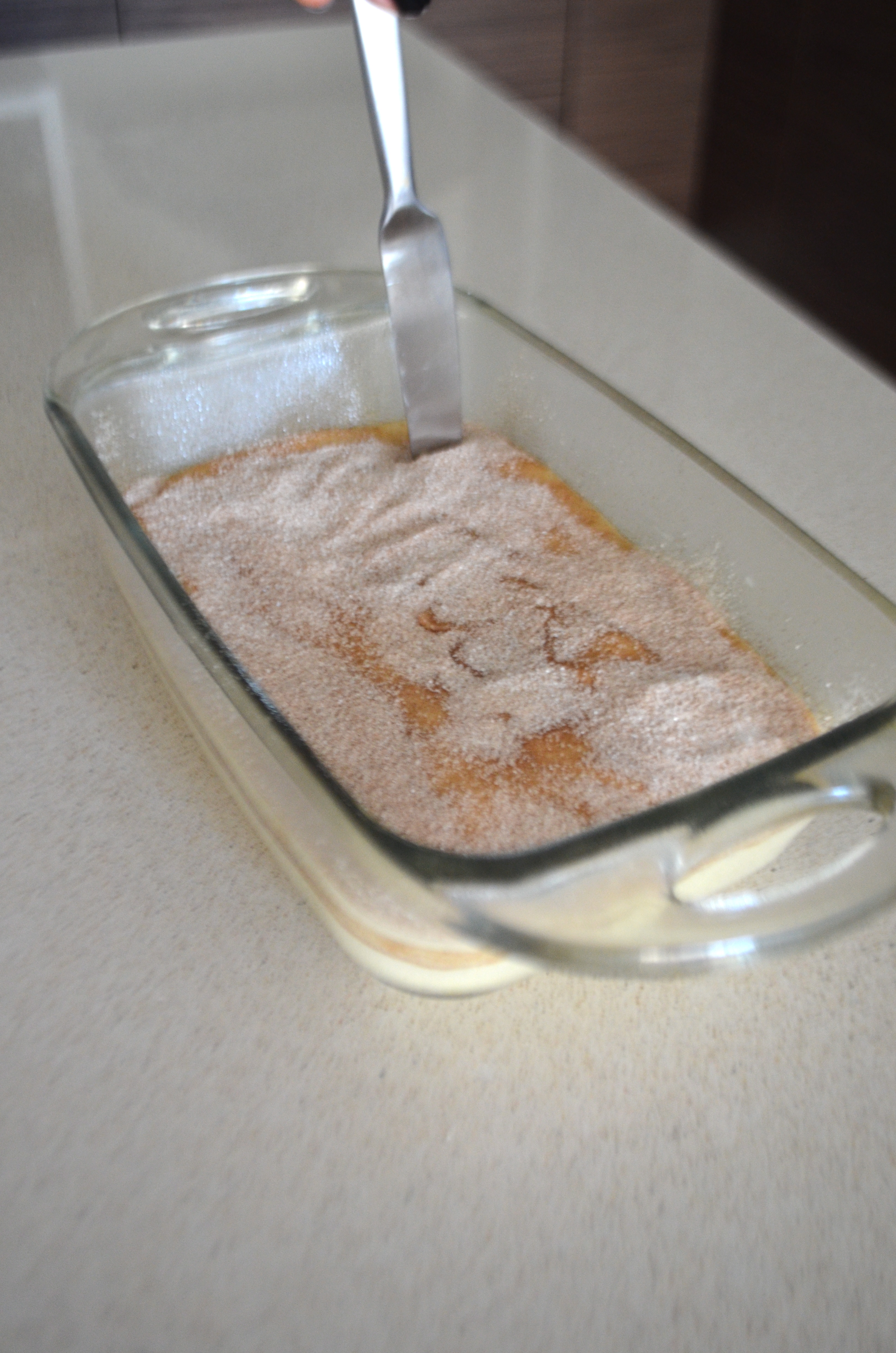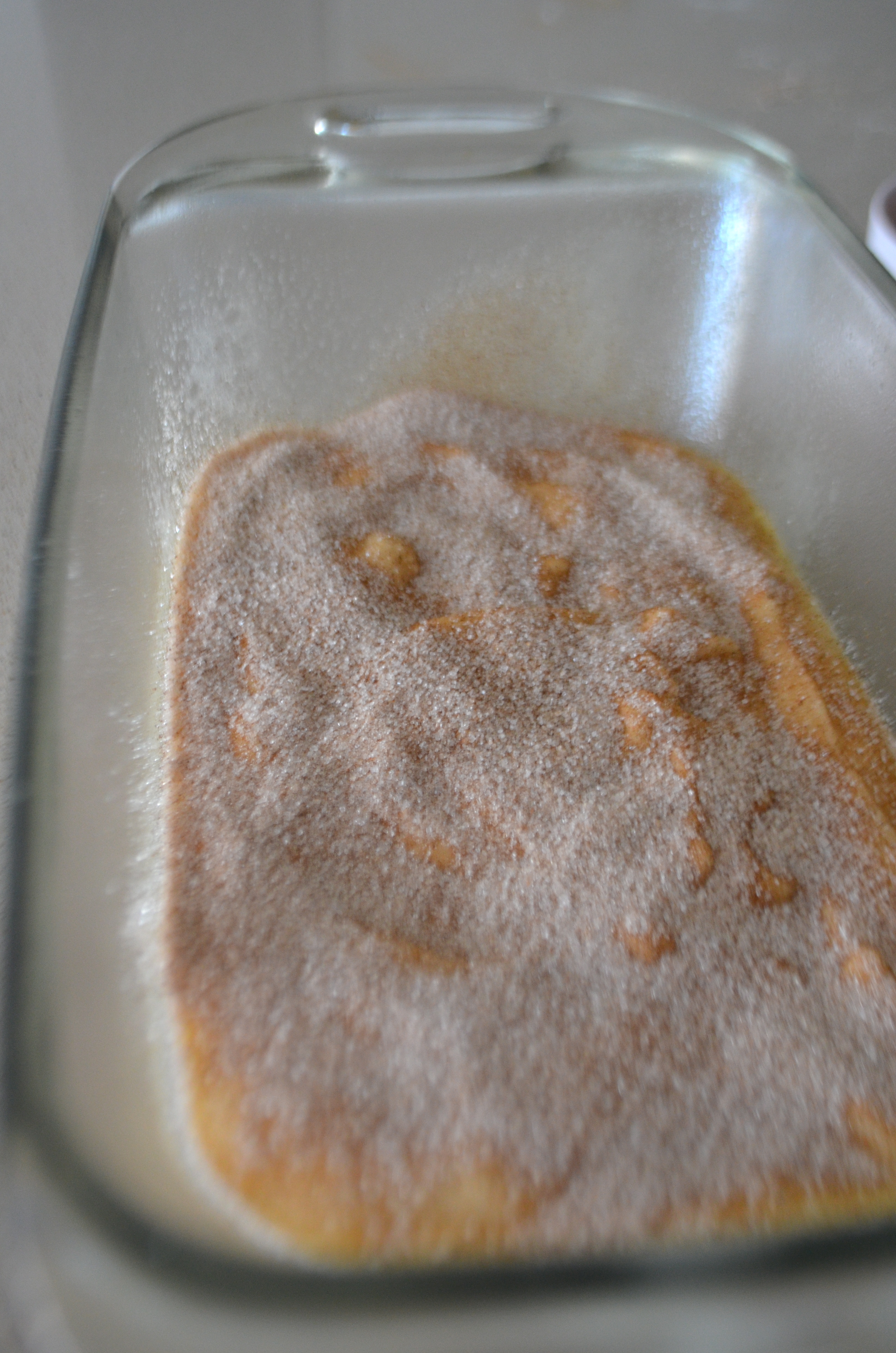 Pour the remaining batter on top of cinn and sugar and then sprinkle remaining cinnamon and sugar on top of bread (I would have used less on mine, so I suggest only lightly covering the batter rather than completely layering it on. Up to you).