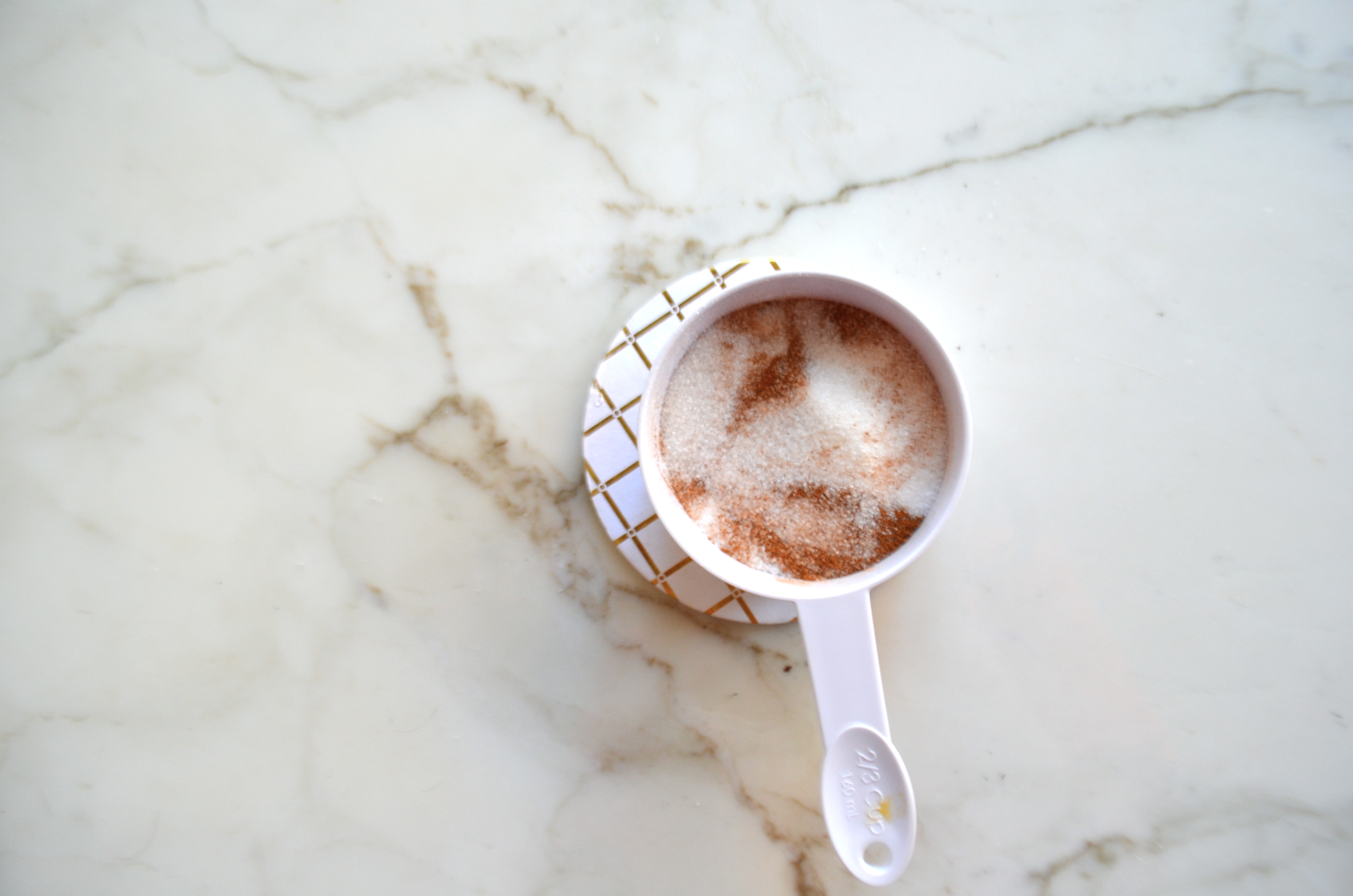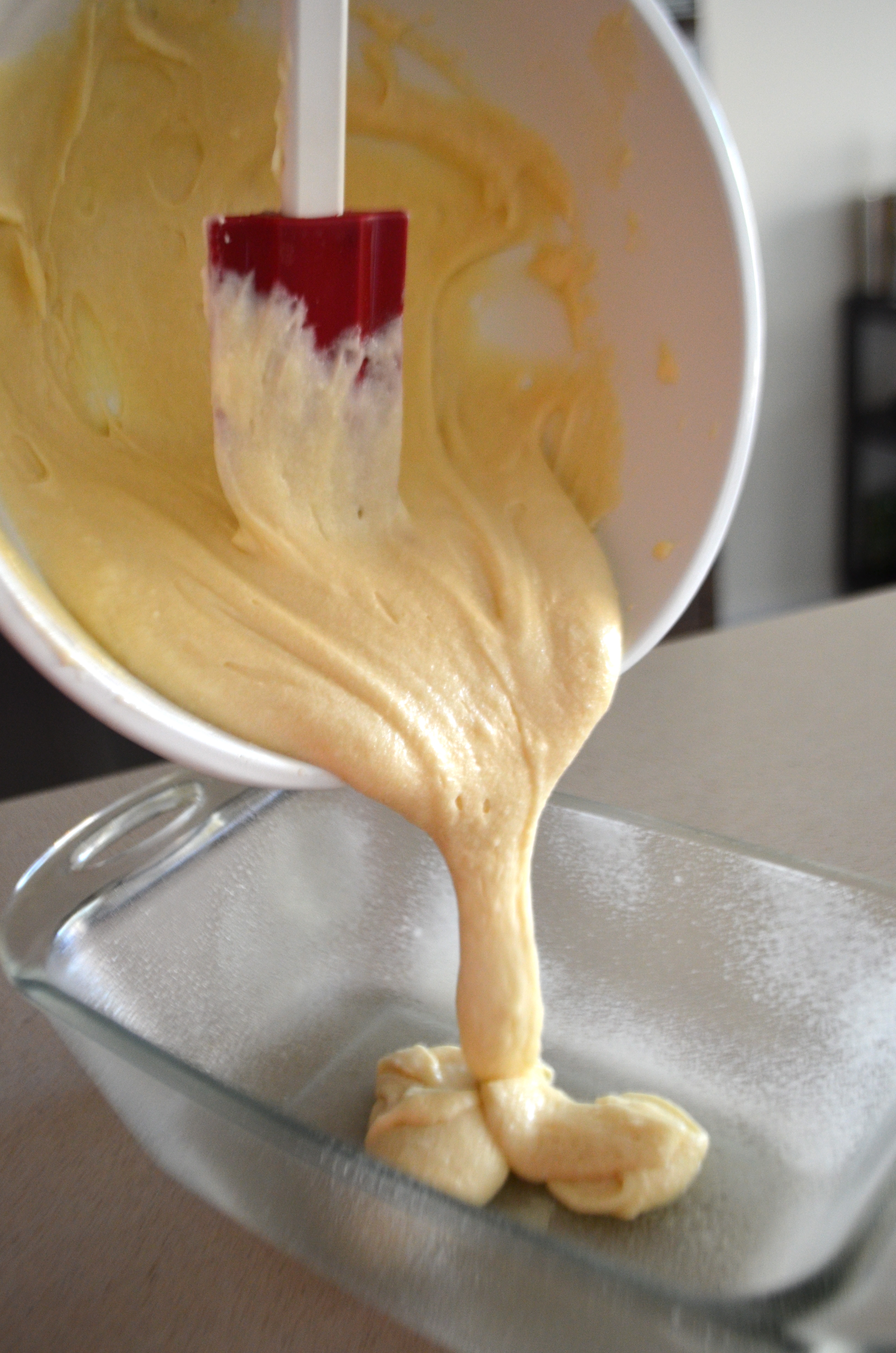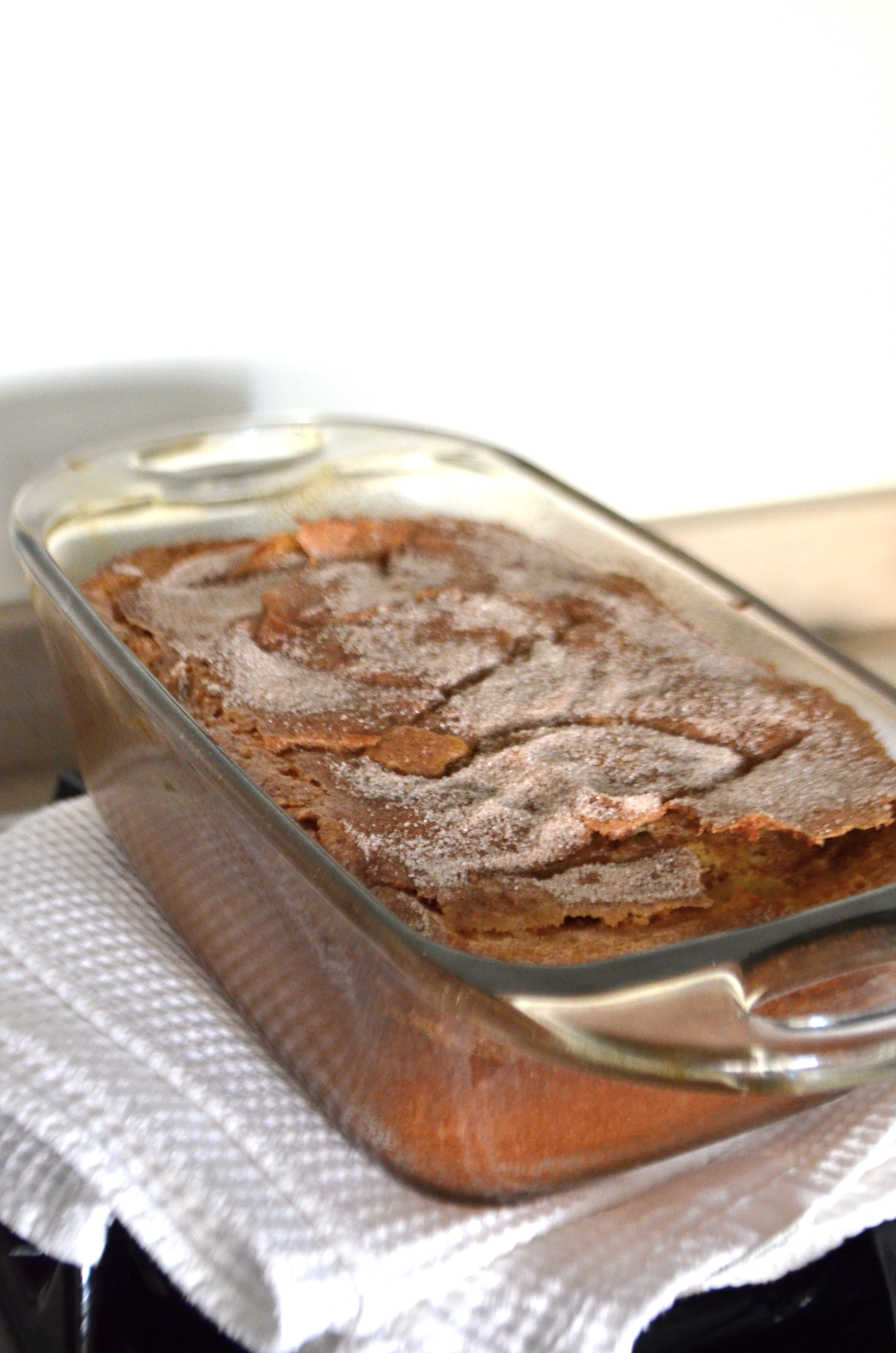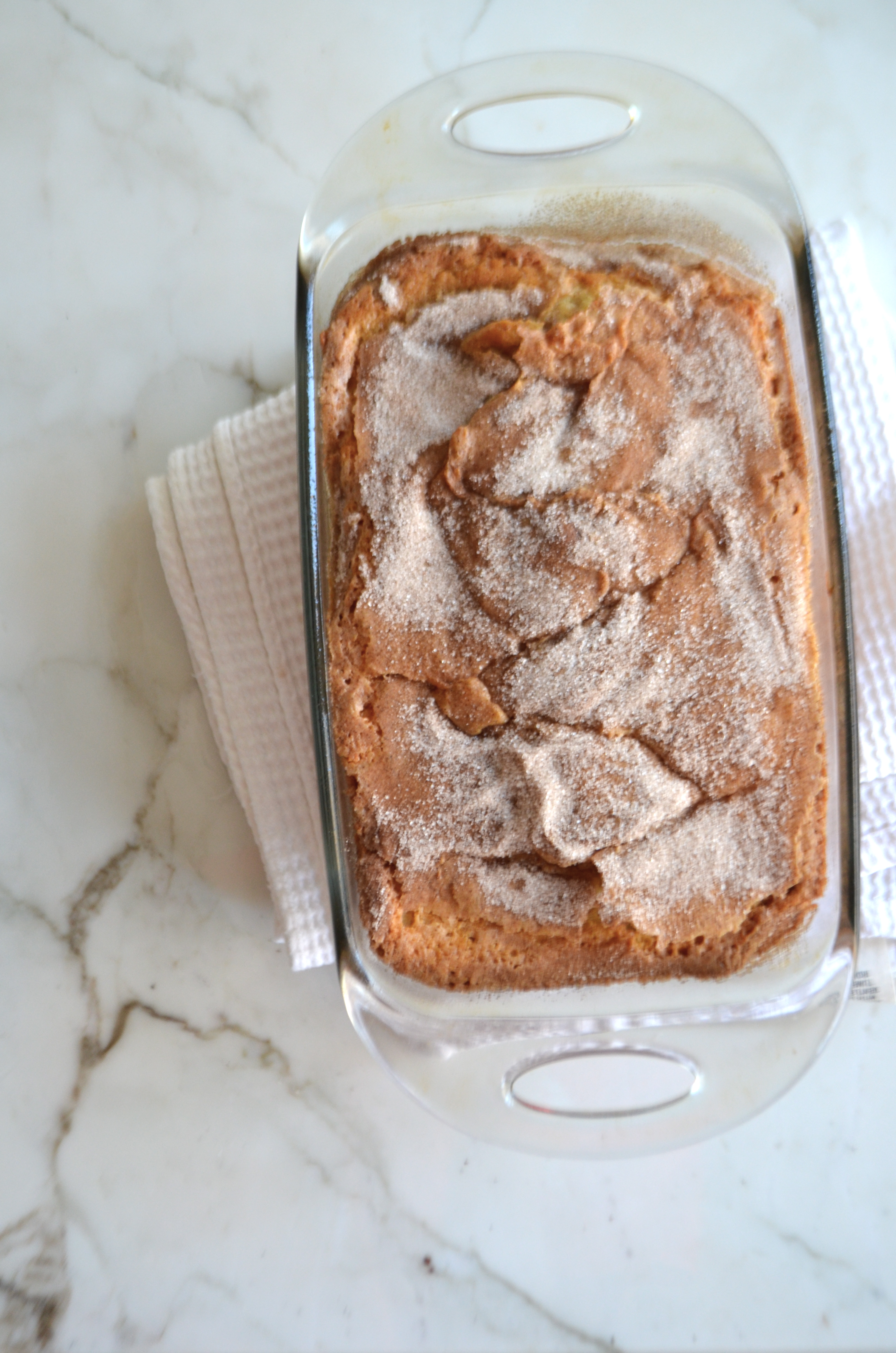 Pour the remaining batter on top of cinn and sugar and then sprinkle remaining cinnamon and sugar on top of bread (I would have used less on mine, so I suggest only lightly covering the batter rather than completely layering it on. Up to you).
