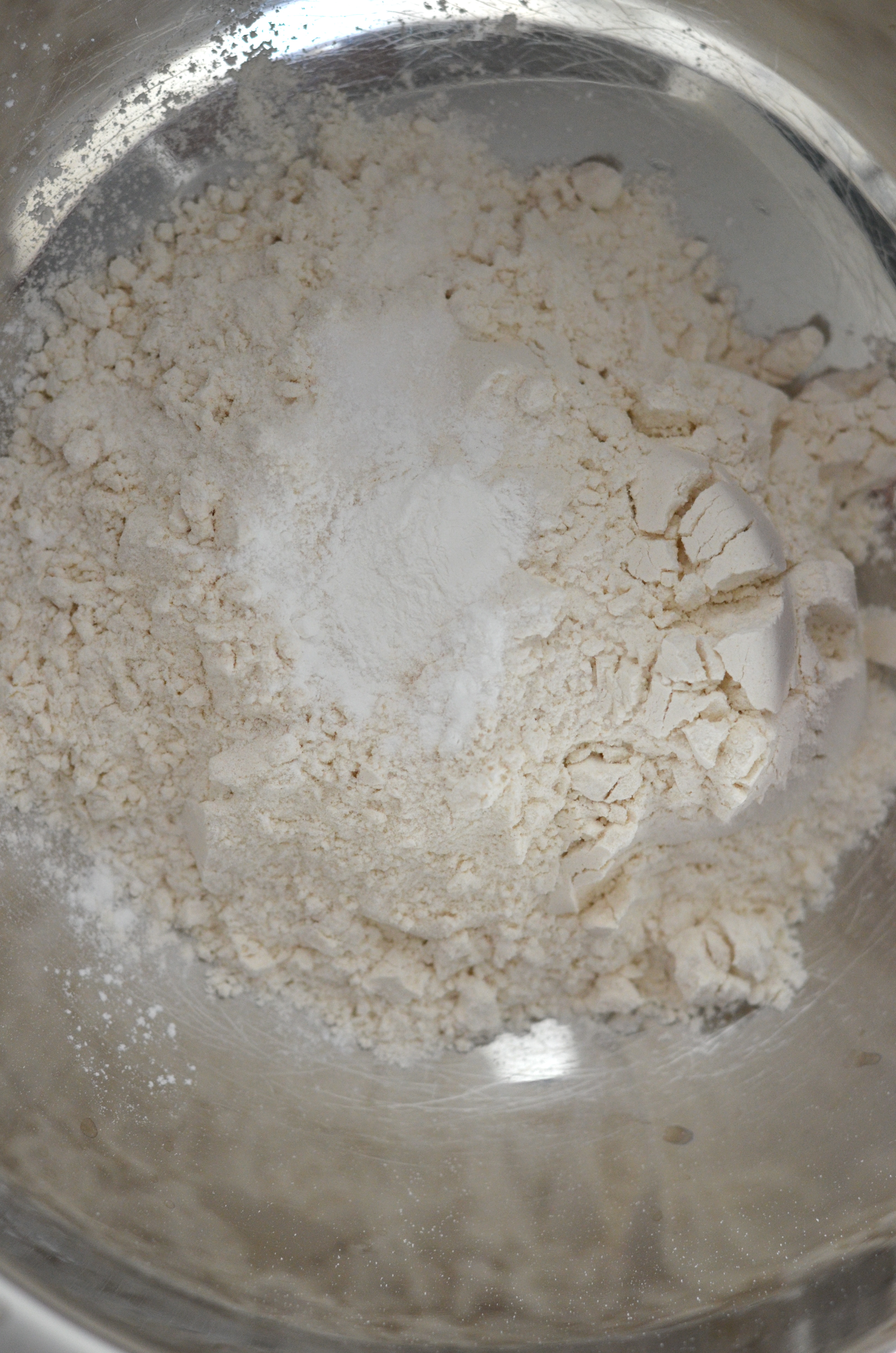 In a large mixing bowl, combine flour, baking soda, baking powder and salt, set aside.