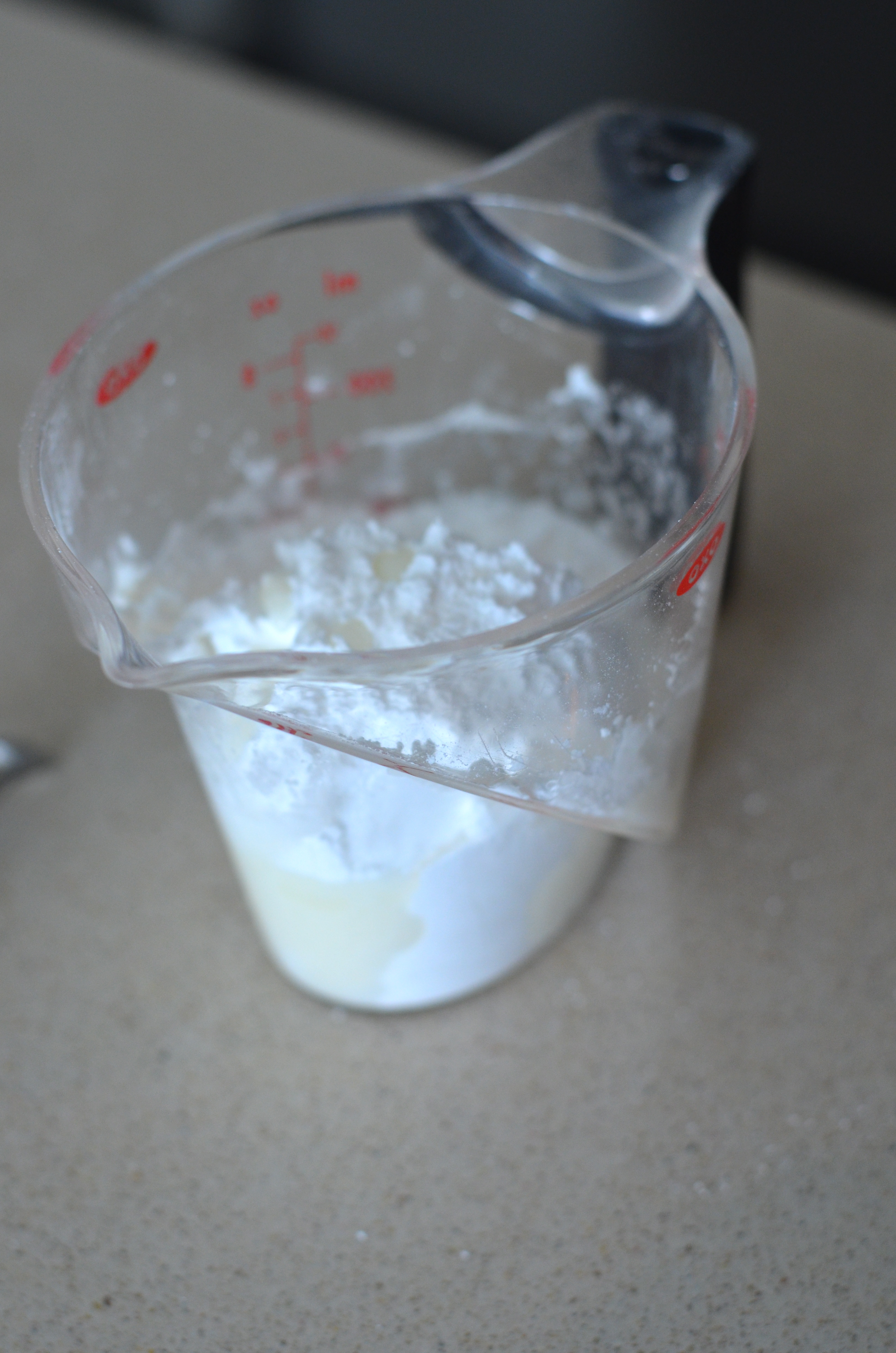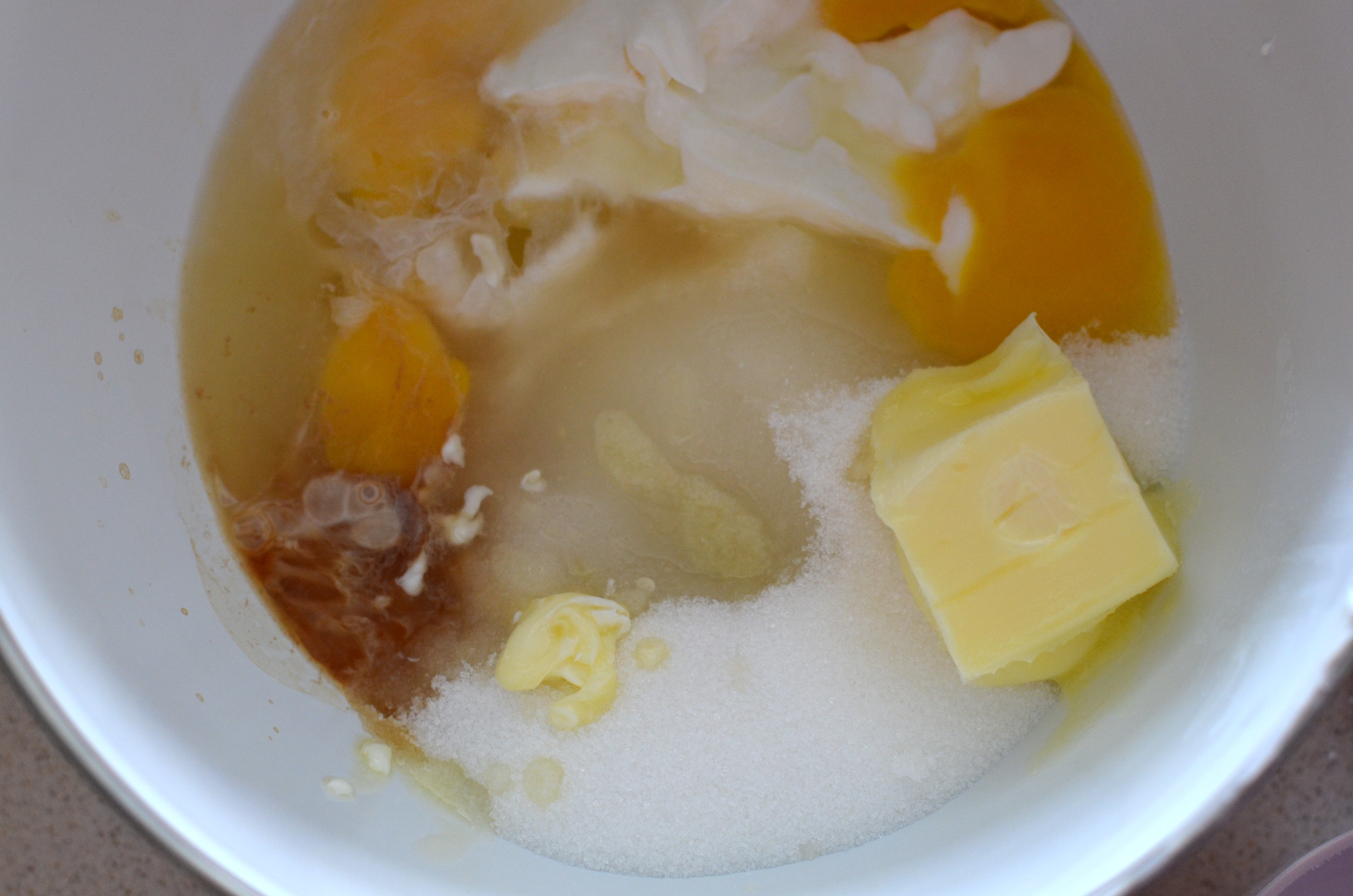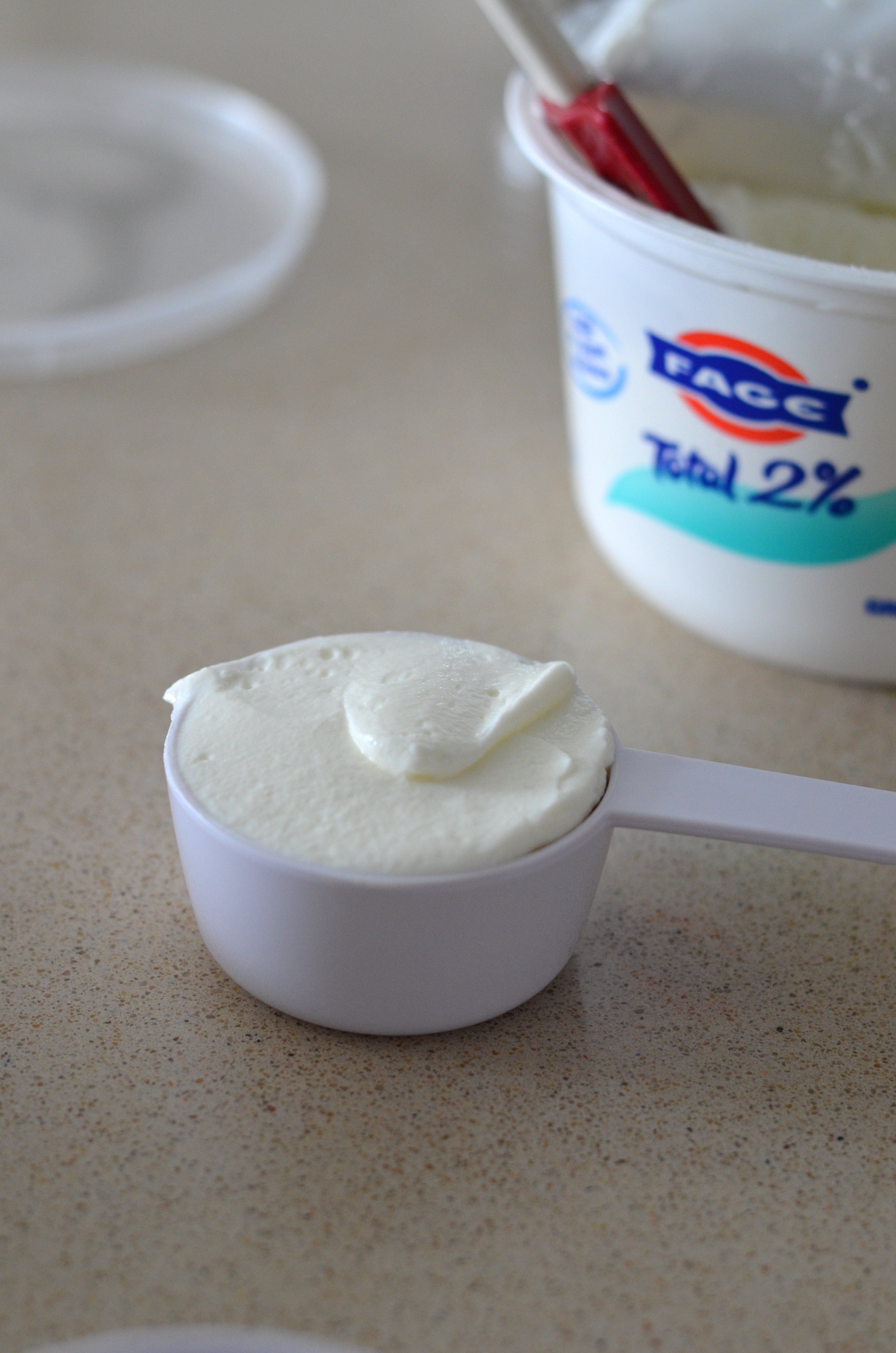 In a medium mixing bowl, combine egg, yogurt, sugar, butter, vanilla extract, lemon extract and lemon juice.