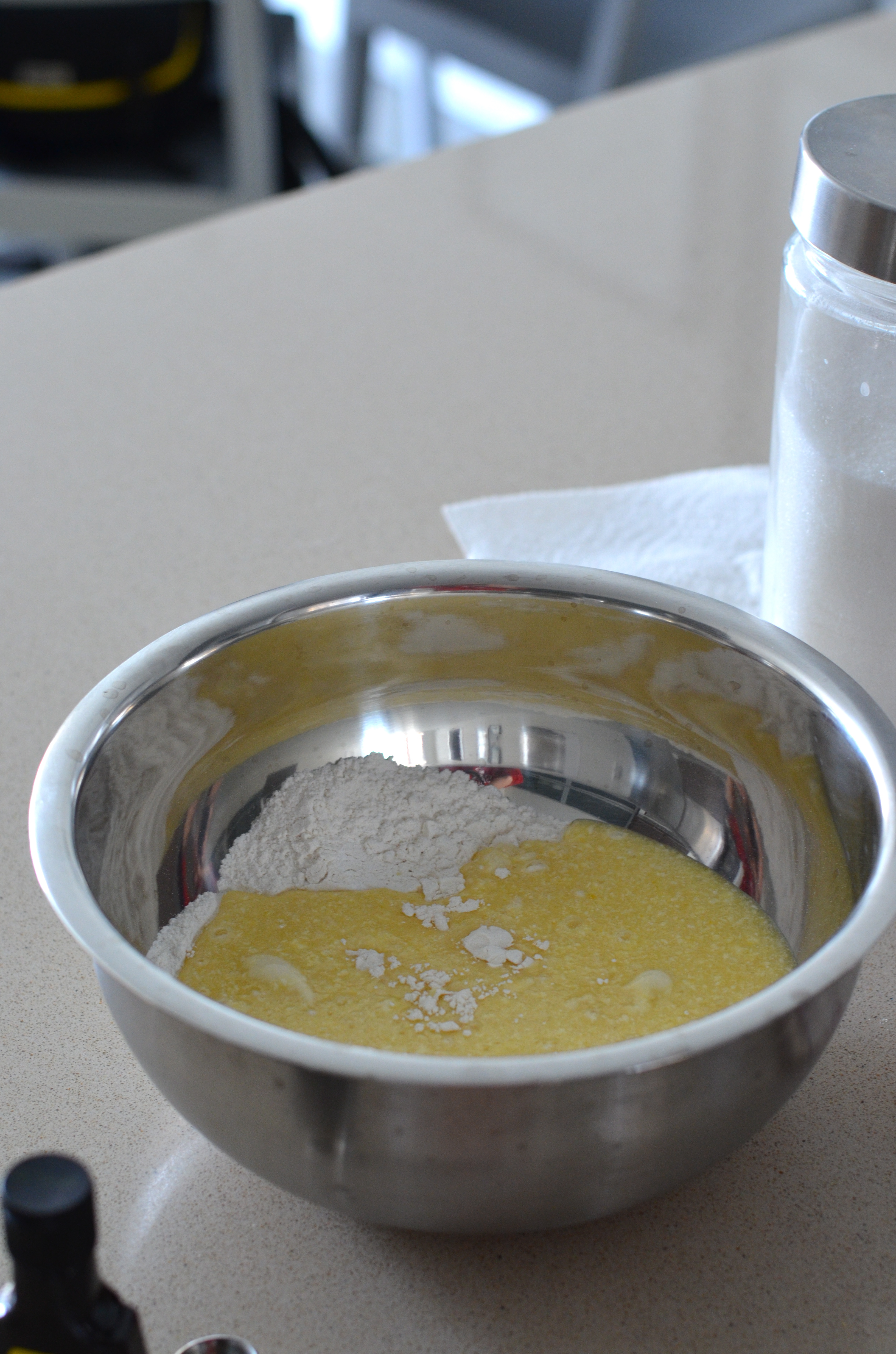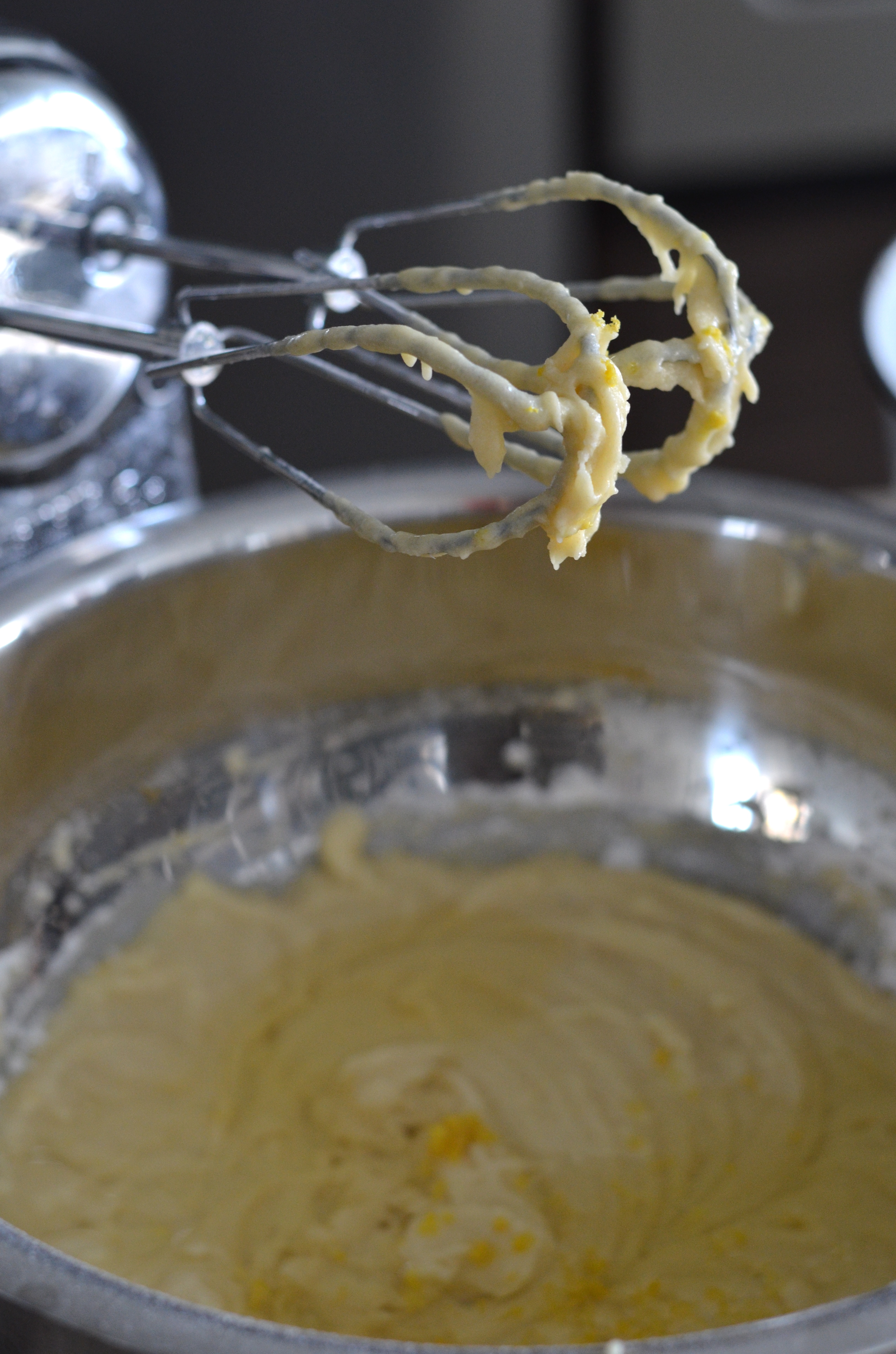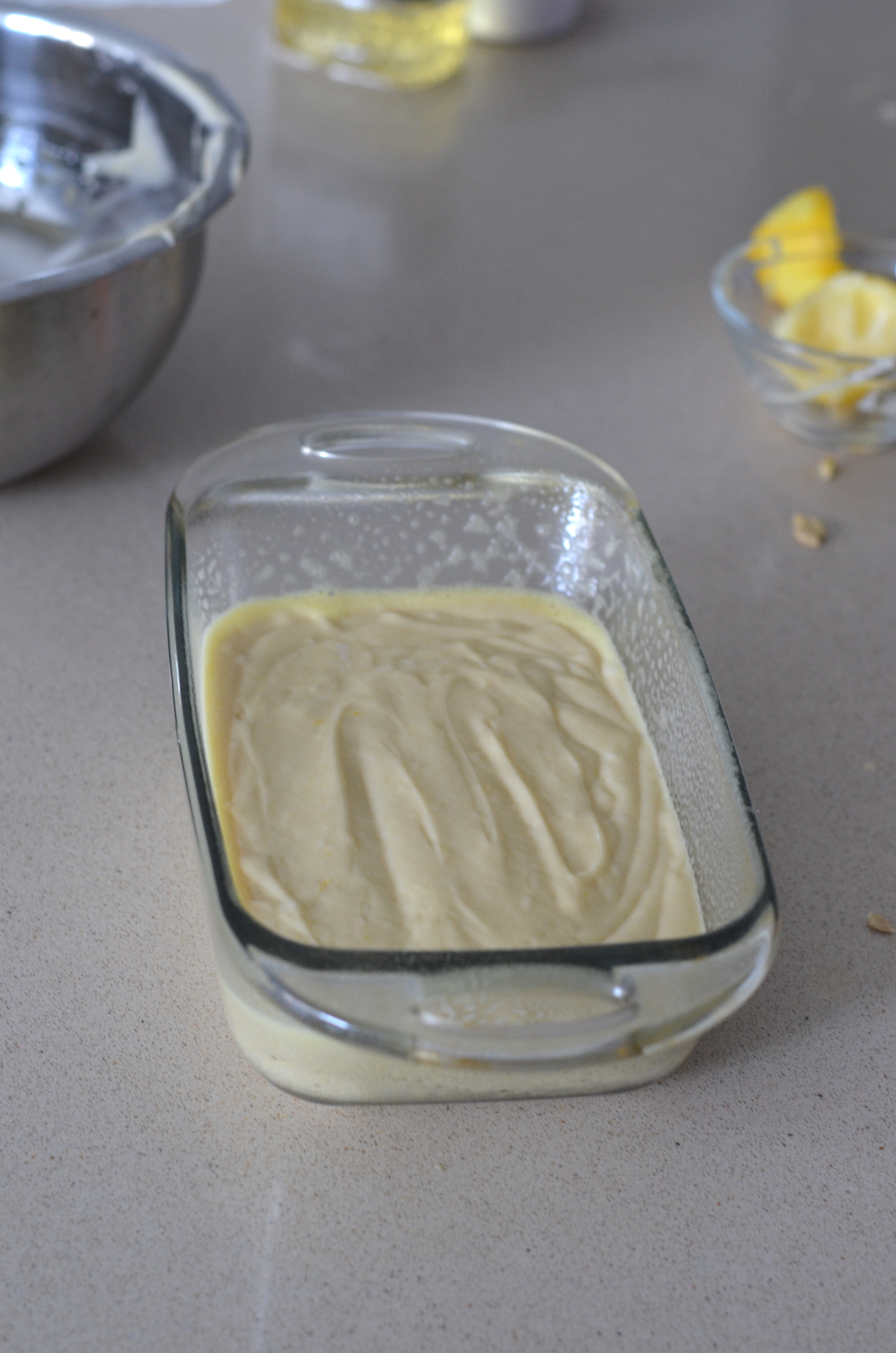 Mix wet ingredients well and once incorporated add to flour mixture. Mix to combine and then add oil and lemon zest. Mix to combine and then pour into prepared pan.
