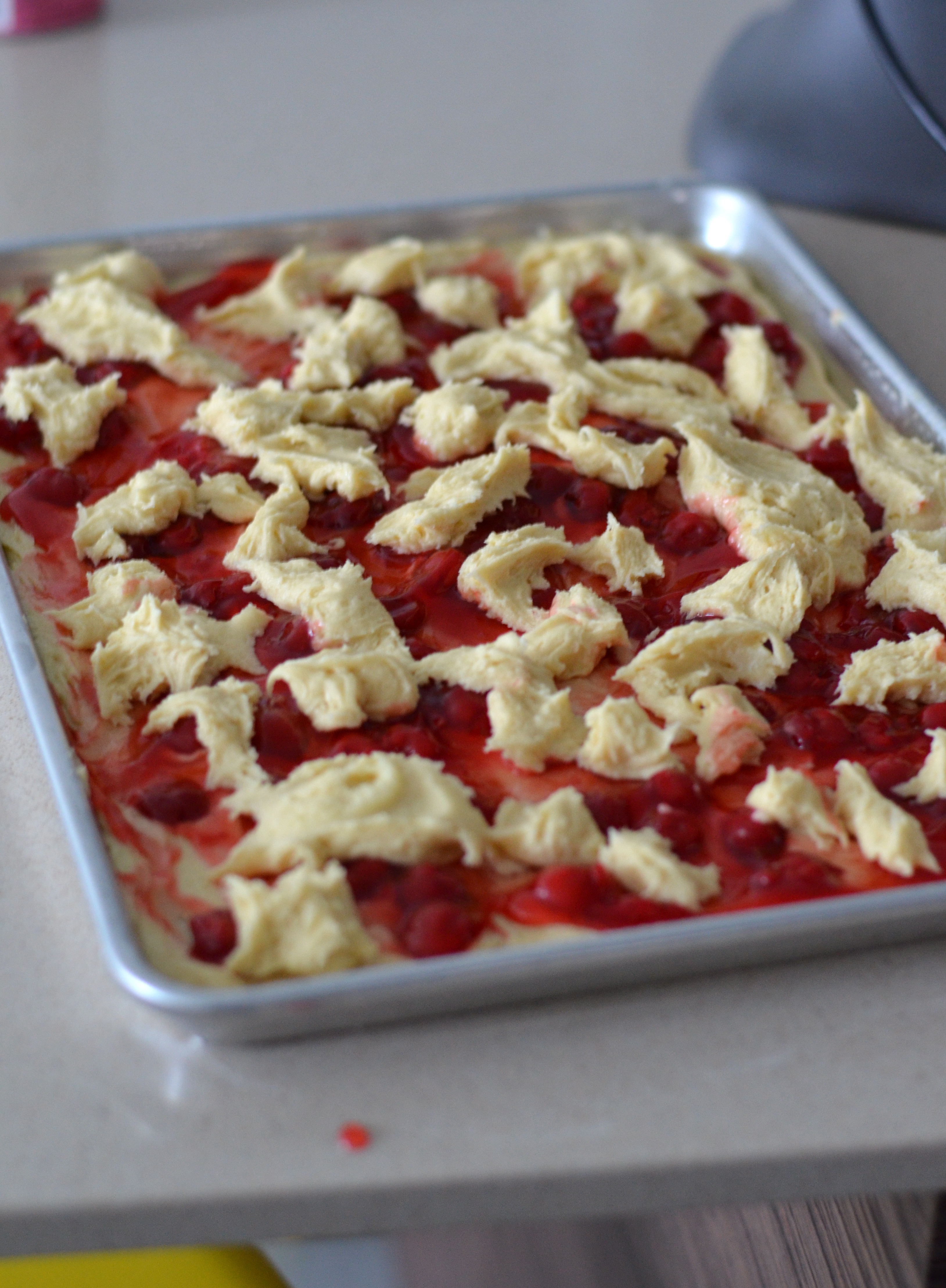 Spread cherry pie filling over the batter and top with the remaining dough. There is no easy way to do this, I just used a spoon and my fingers to add globs of batter over the top.