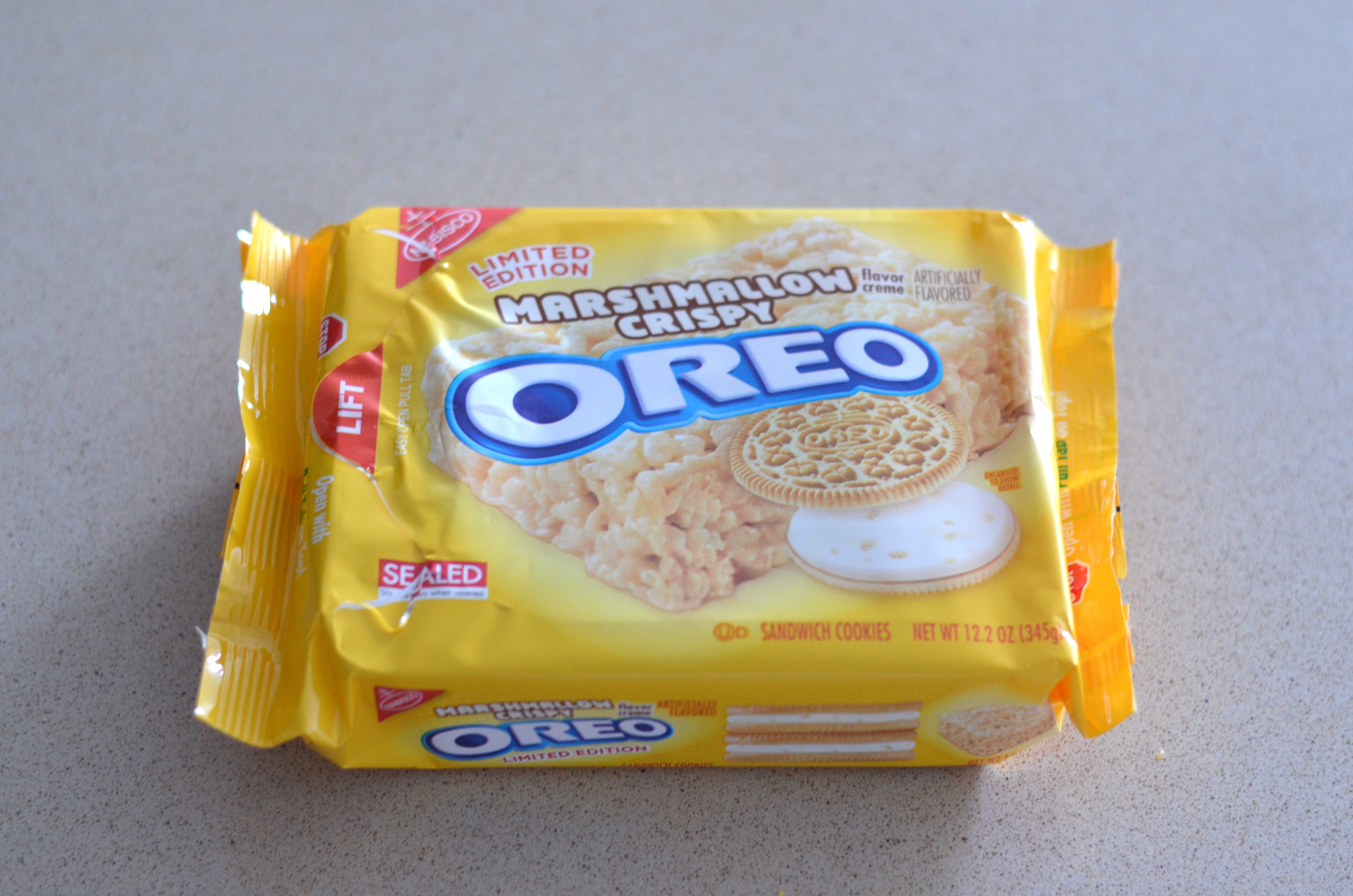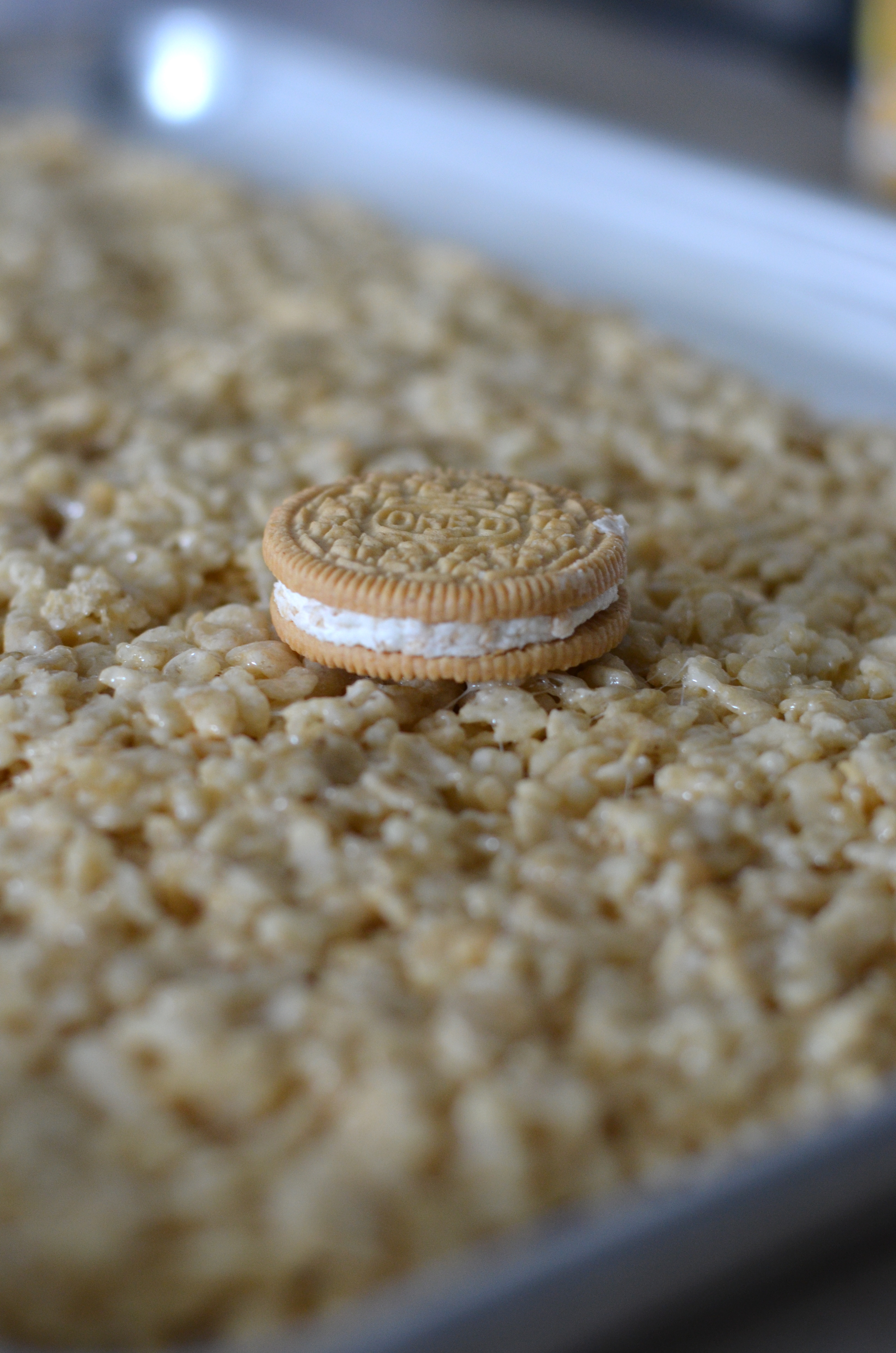 I have had a bag of the new Marshmallow Crispy Oreo’s in my pantry for about a week and I finally figured out what I wanted to do with them. I decided to stuff them inside an actual Rice Krispie Treat and then put them on a stick.