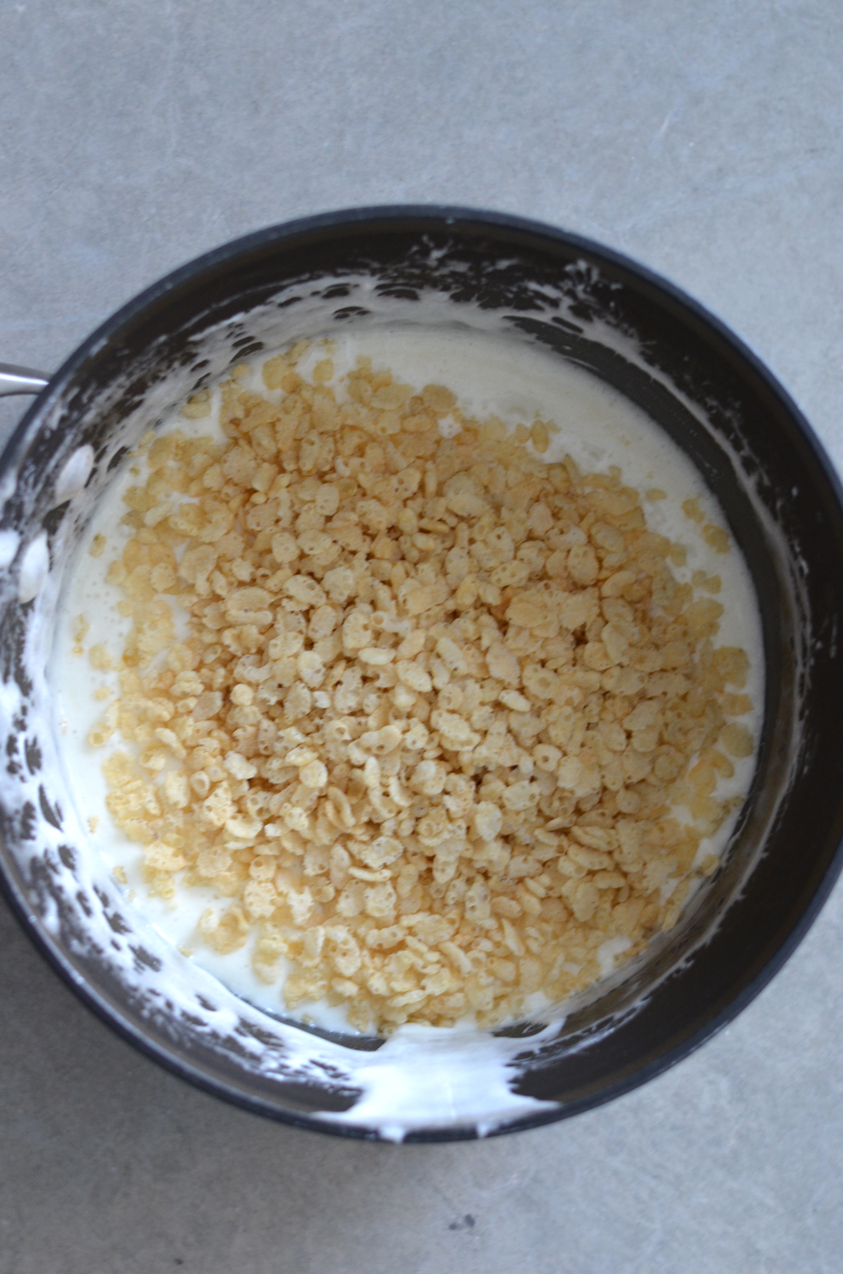 Over low/medium heat, melt 1 bag (4 cups) marshmallows and 3 tablespoons butter in a saucepan. Once melted, stir in rice krispie cereal