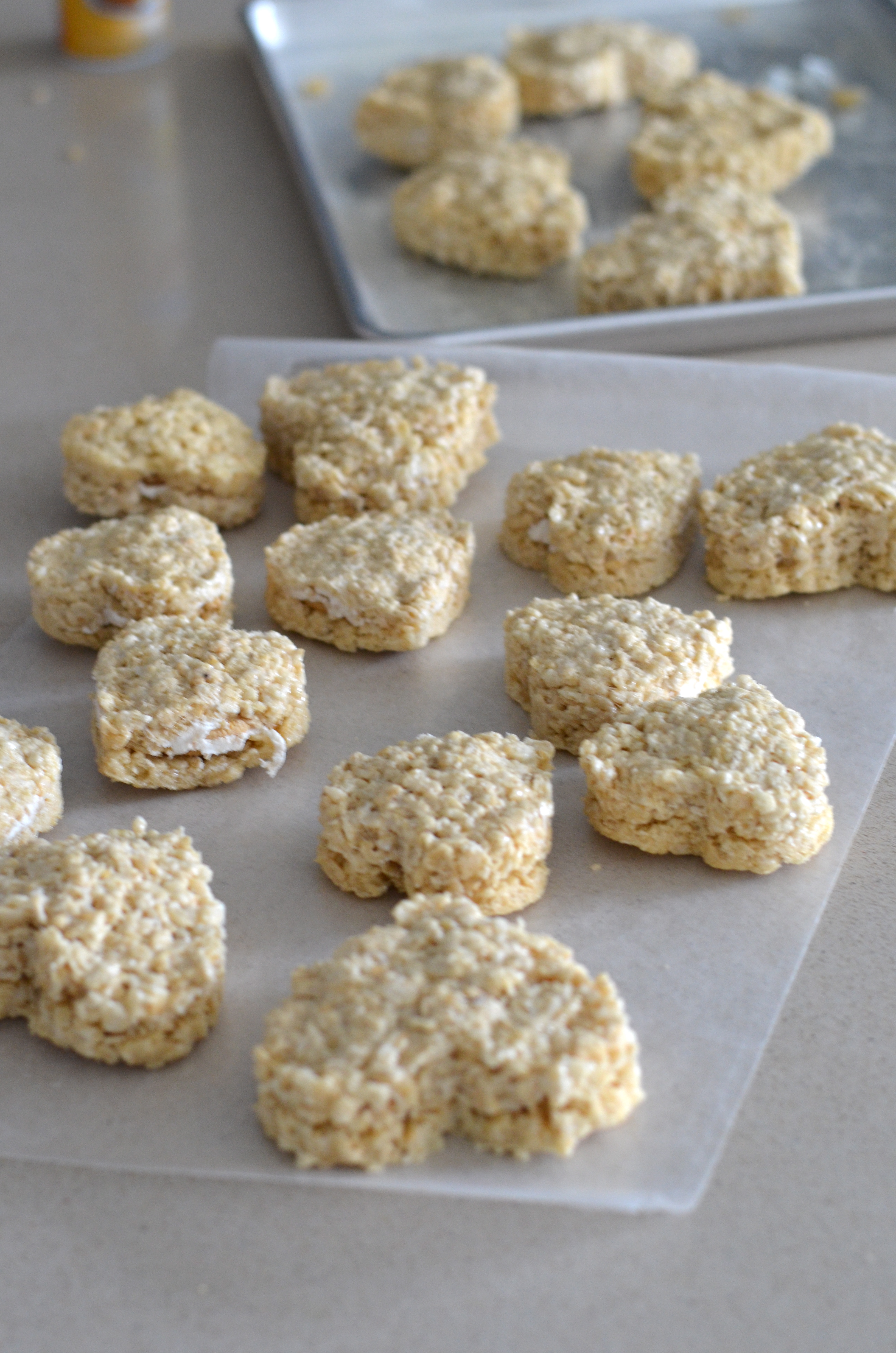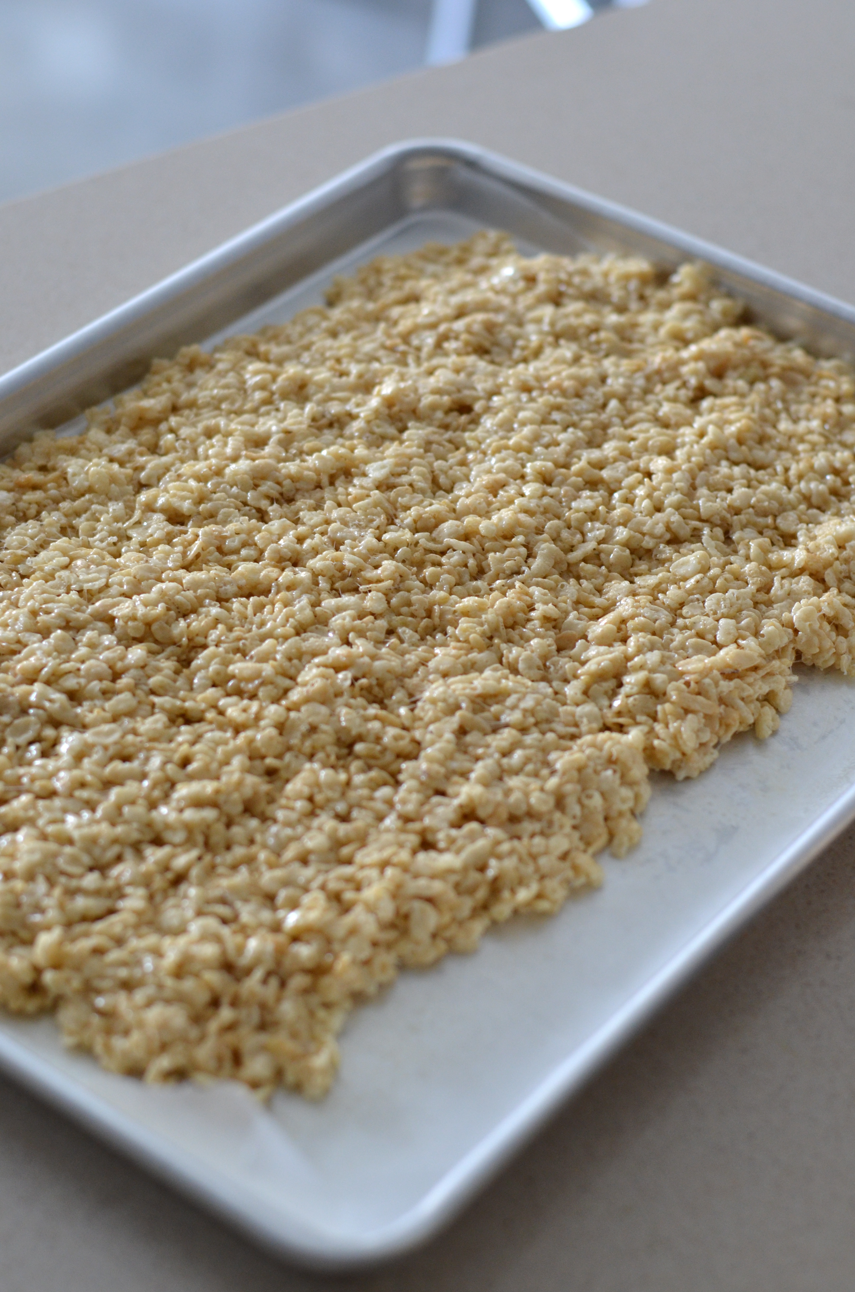 Press into a flat layer and begin to make next batch of rice krispie treats. Melt butter and marshmallows, mix in cereal and then you can begin.