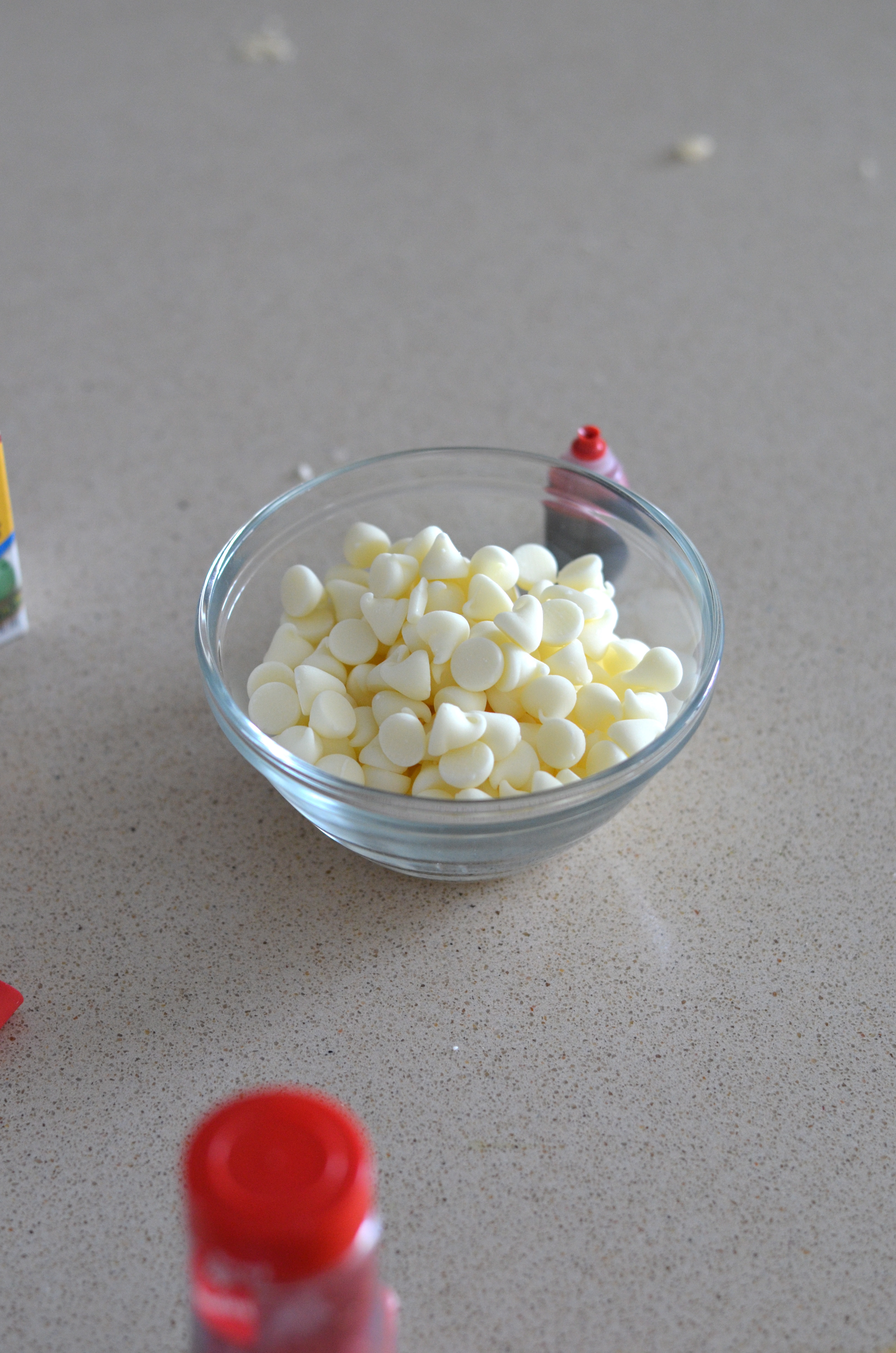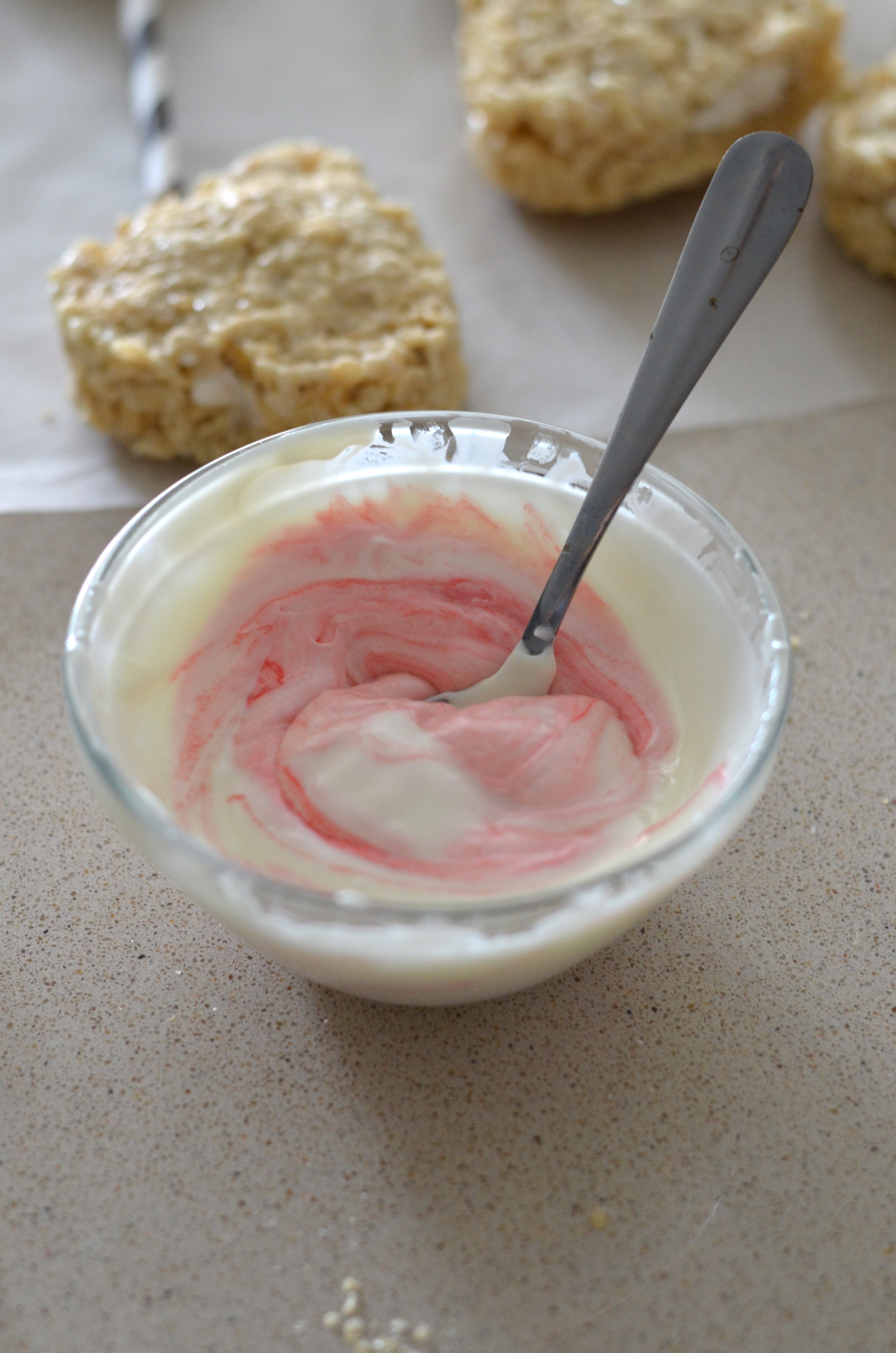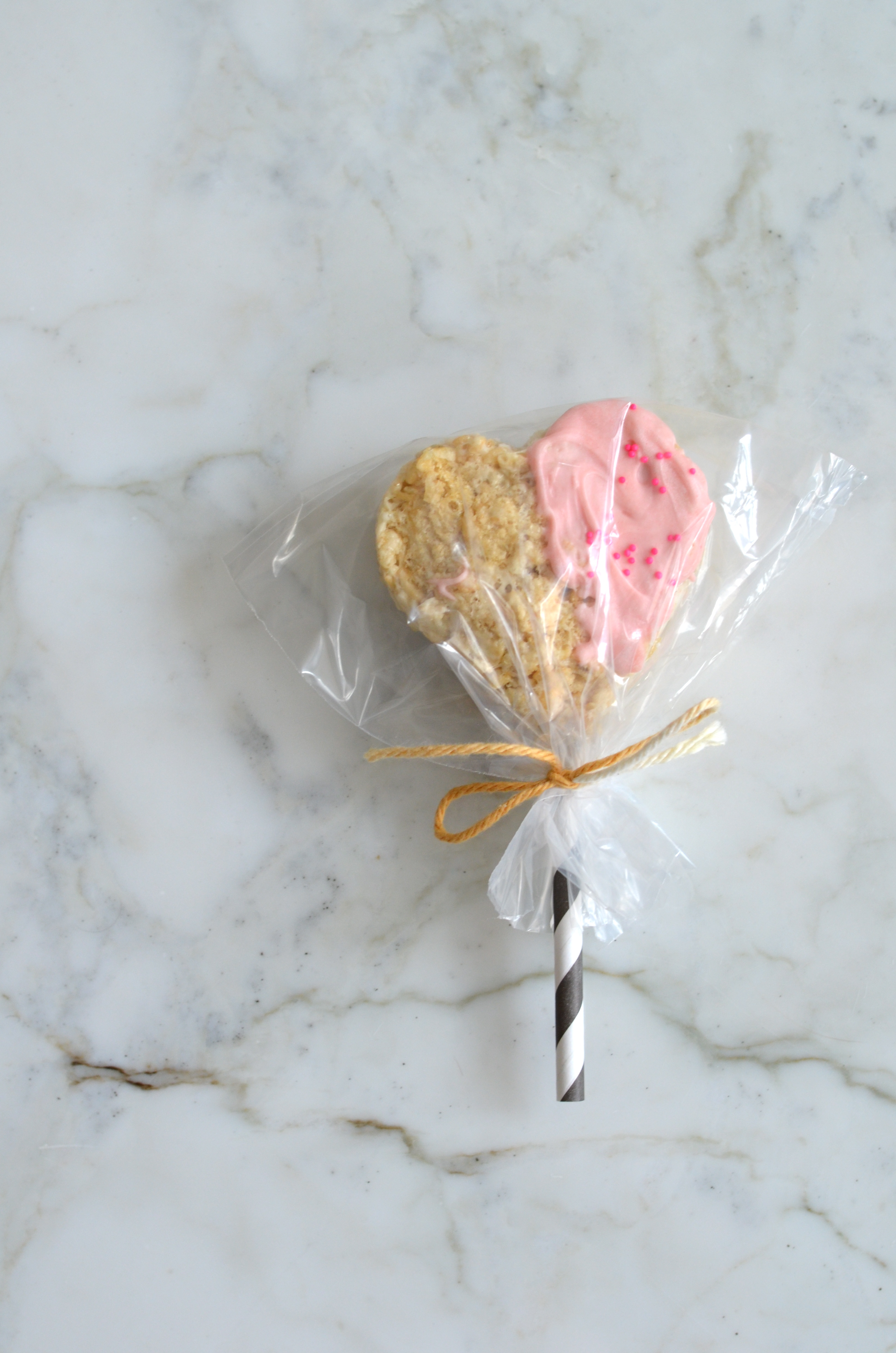 Once cooled, melt chocolate and add food coloring. Decorate rice krispies with chocolate and sprinkles. Wrap in a baggie and tie with a string and hand them out to your favorite Valentines 🙂