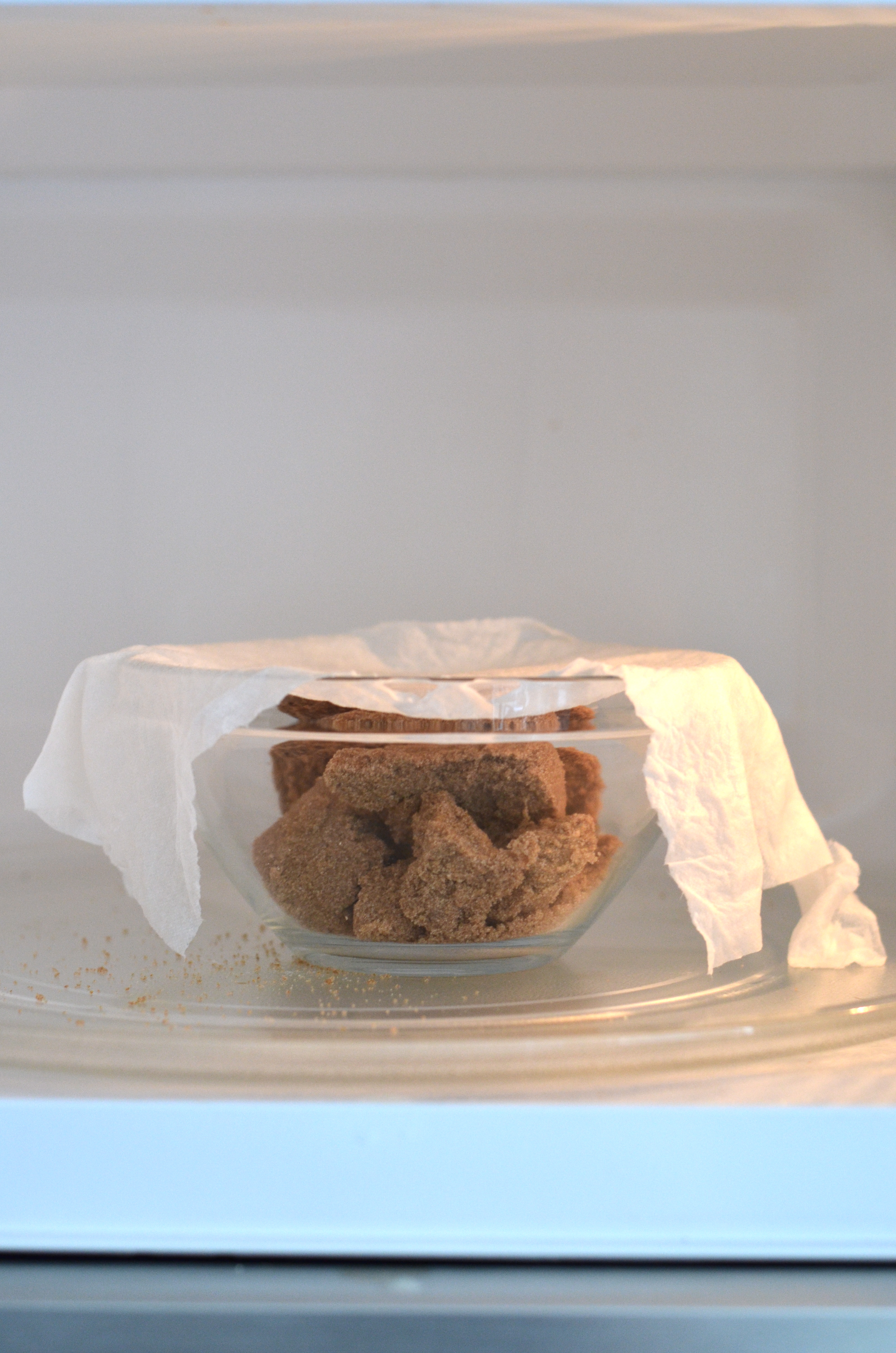 My brown sugar was as hard as a rock! So, in order to soften it I placed it in a microwave safe bowl and placed a moistened paper towel over the top. I microwaved it for about 20 seconds until it was soft enough to mold. I ended up having to re-wet the paper towel a couple times before my brown sugar was soft enough. If you ever find you don’t have any brown sugar, you can make your own by adding molasses or syrup.