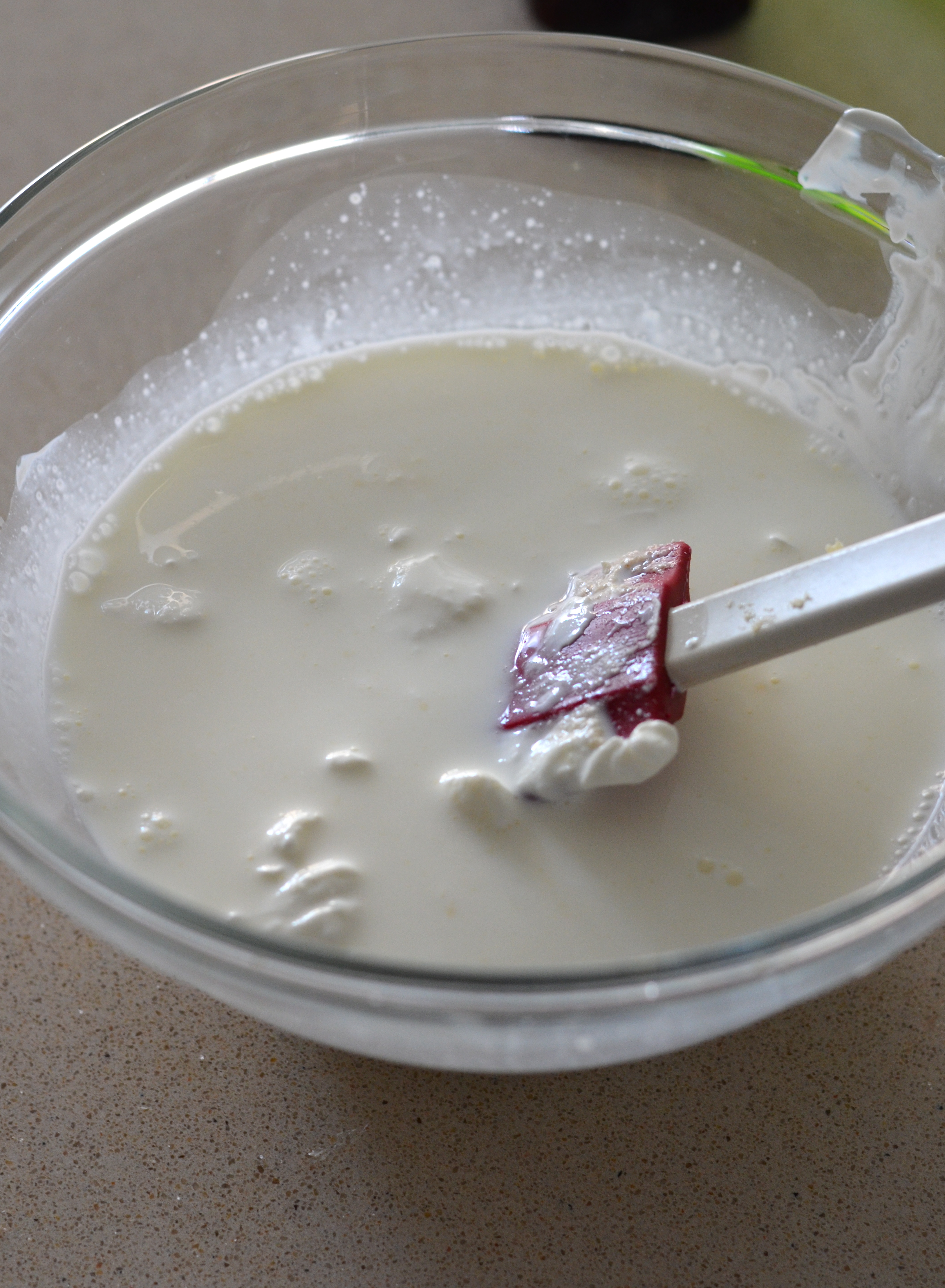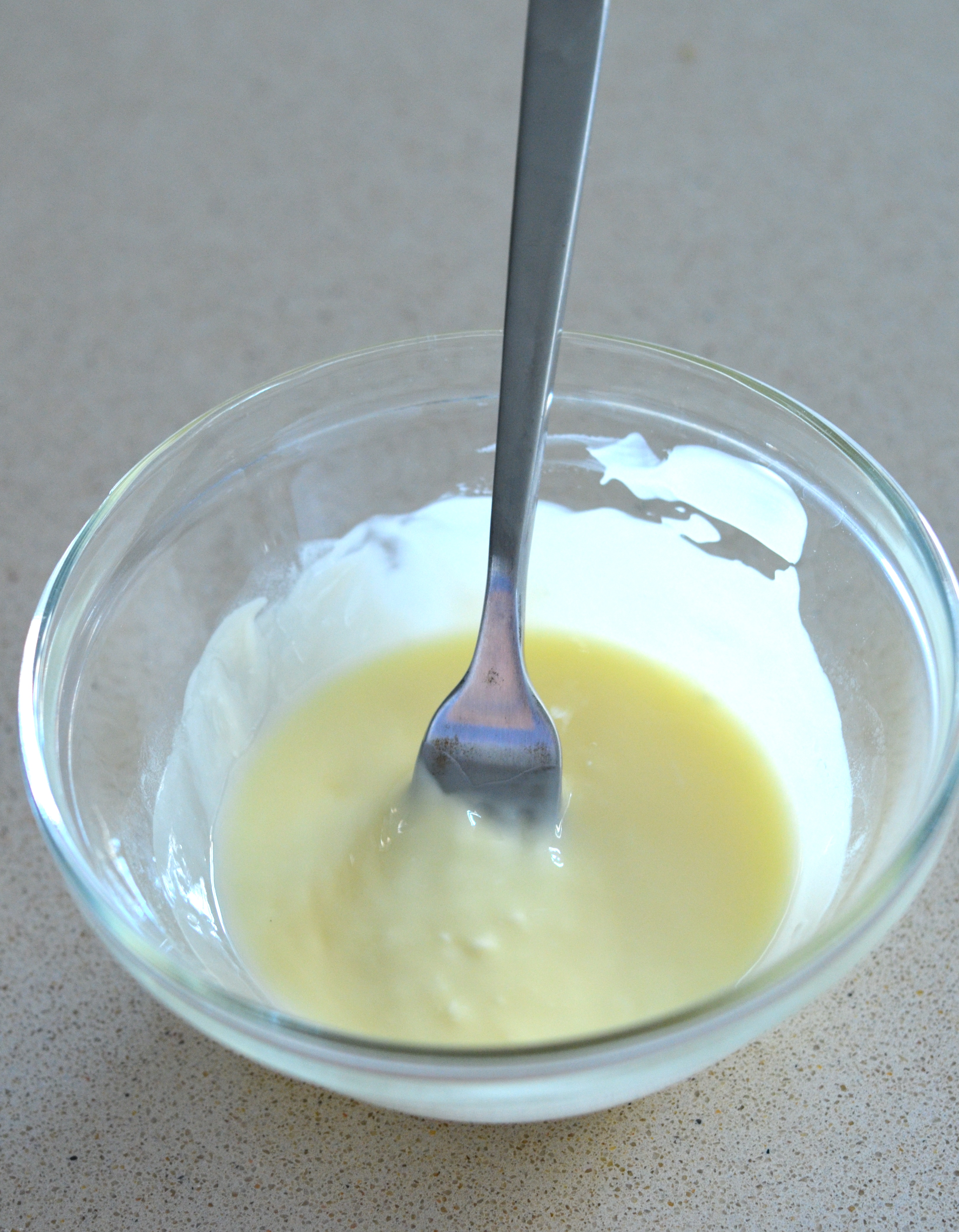 In a separate bowl, whisk together the yogurt (I used greek, you could use sour cream too) and milk until well combine, but not completely lump free, it will work fine with some lumps.