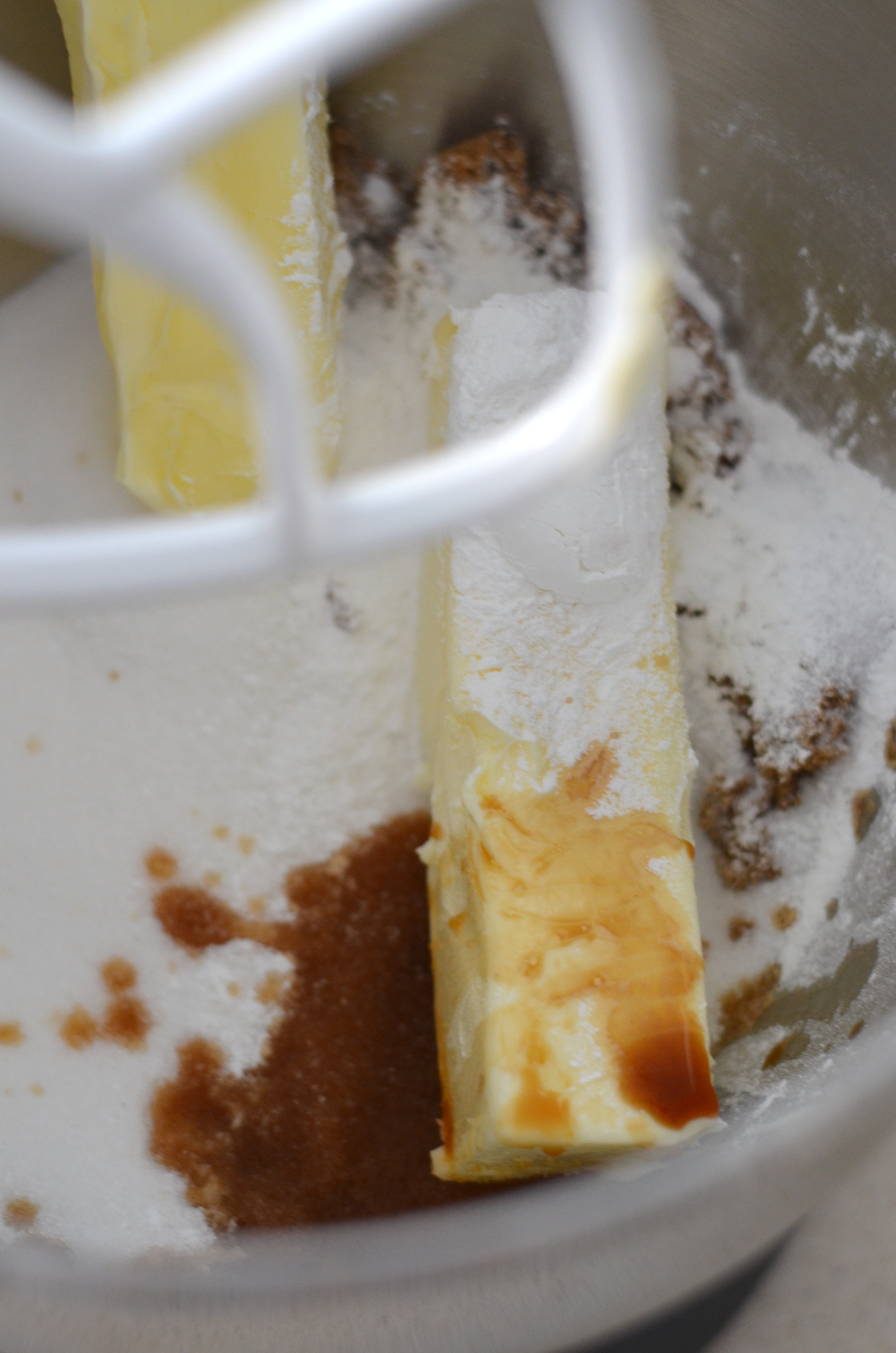 For the cake batter, beat together the butter, sugars, baking powder, salt and vanilla until well incorporated in a large bowl of an electric mixer.