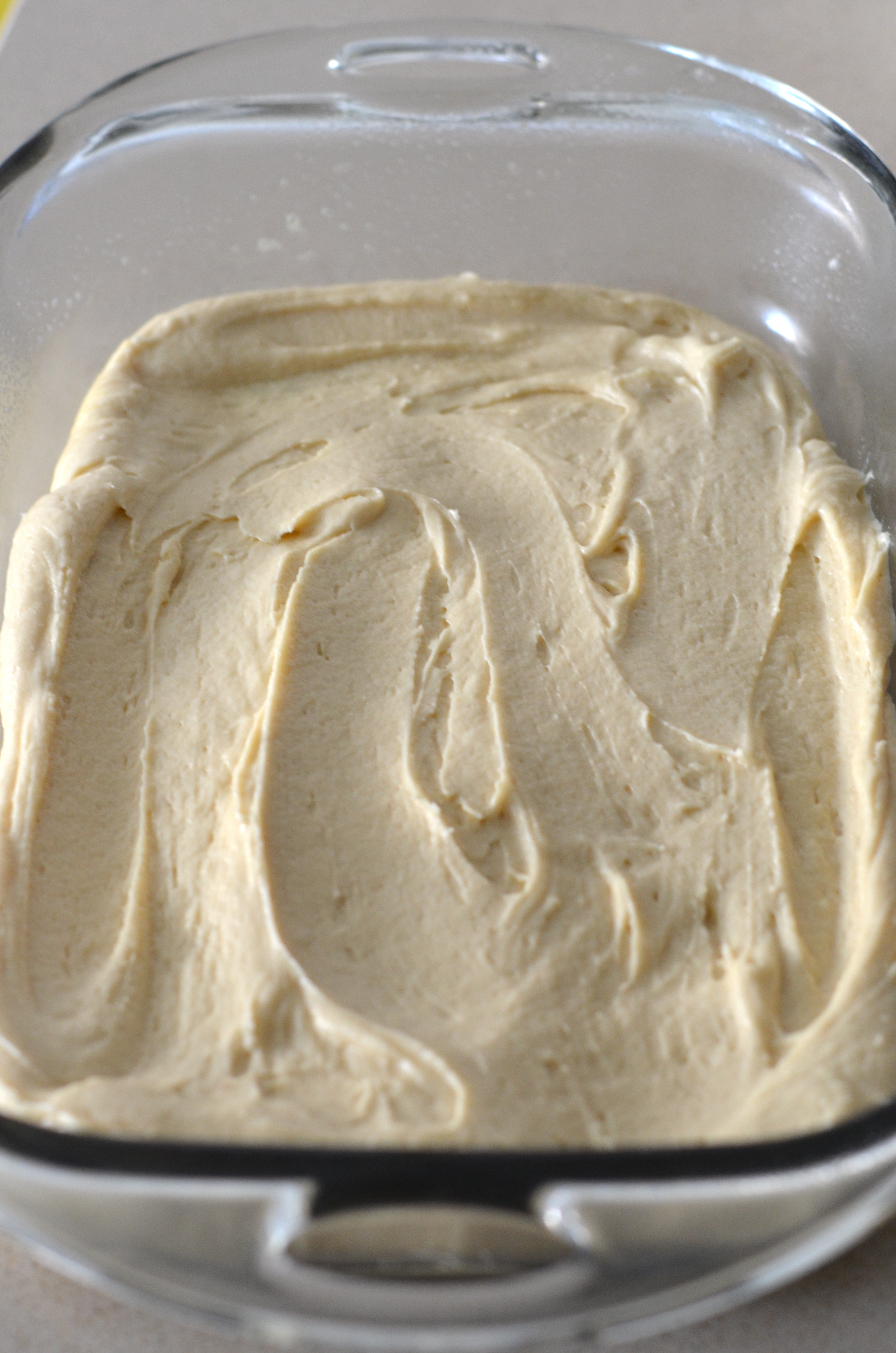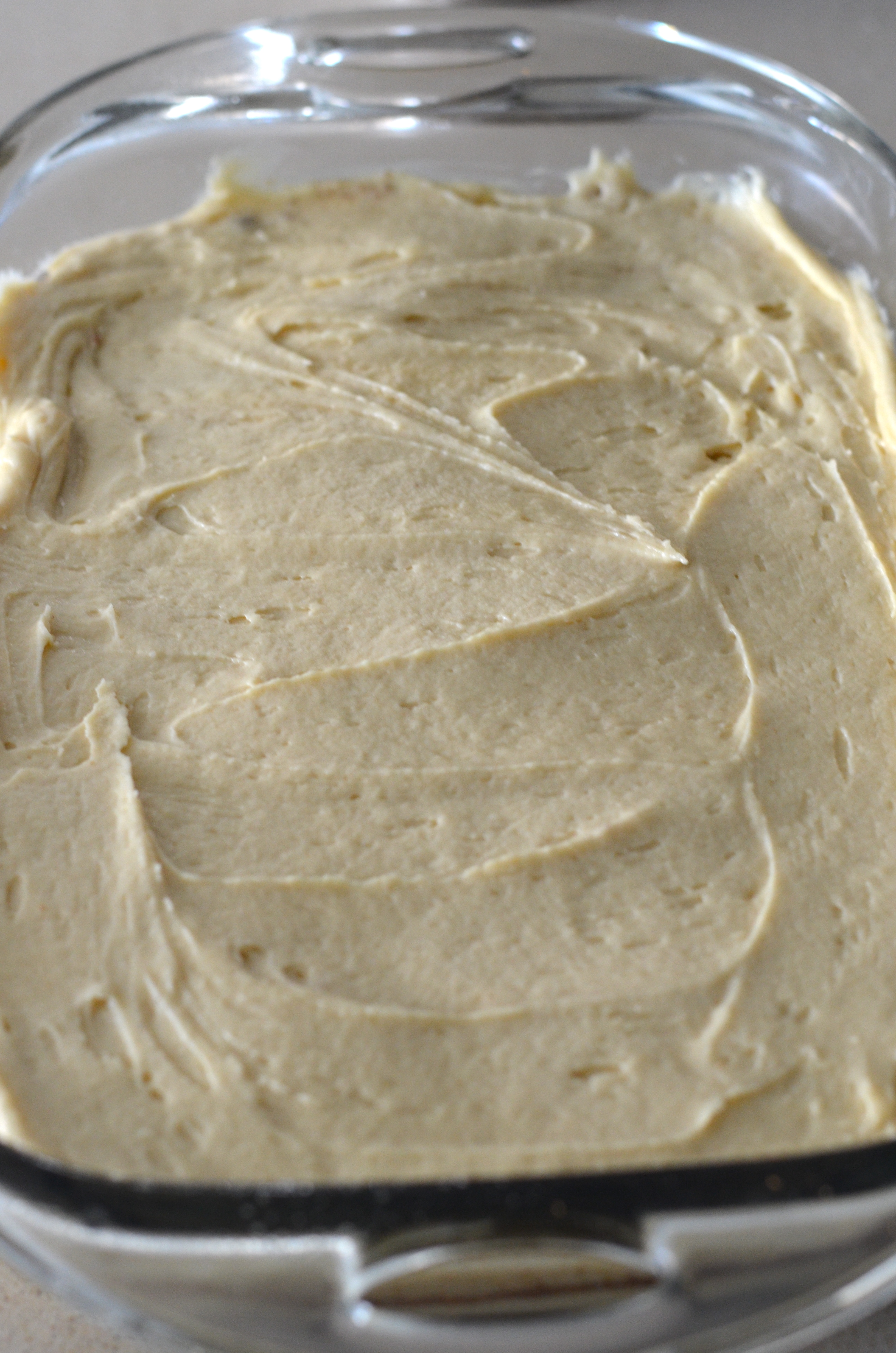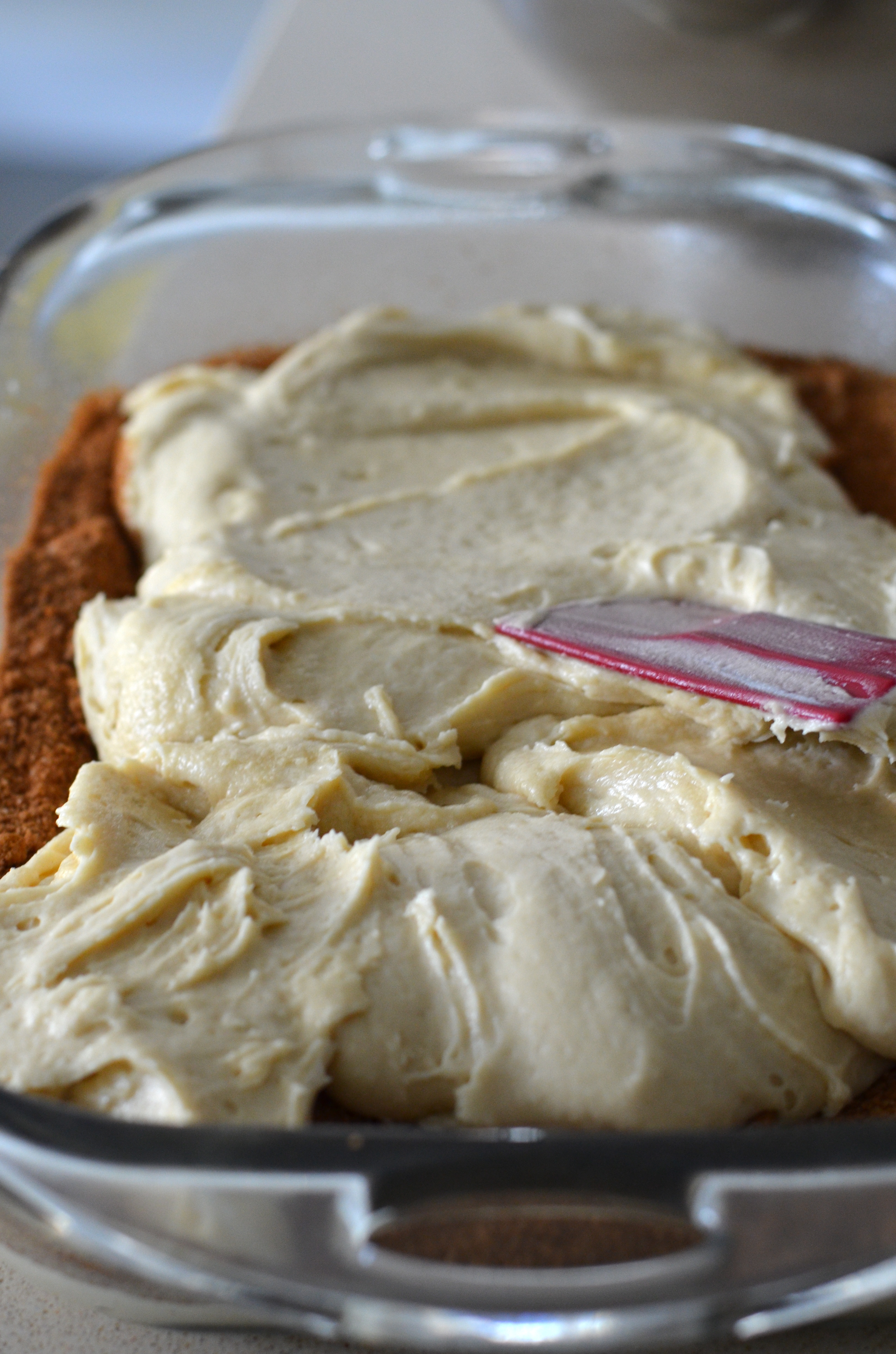 Spread half the batter into the prepared 9×13 pan sprinkle completely with the cocoa mixture.