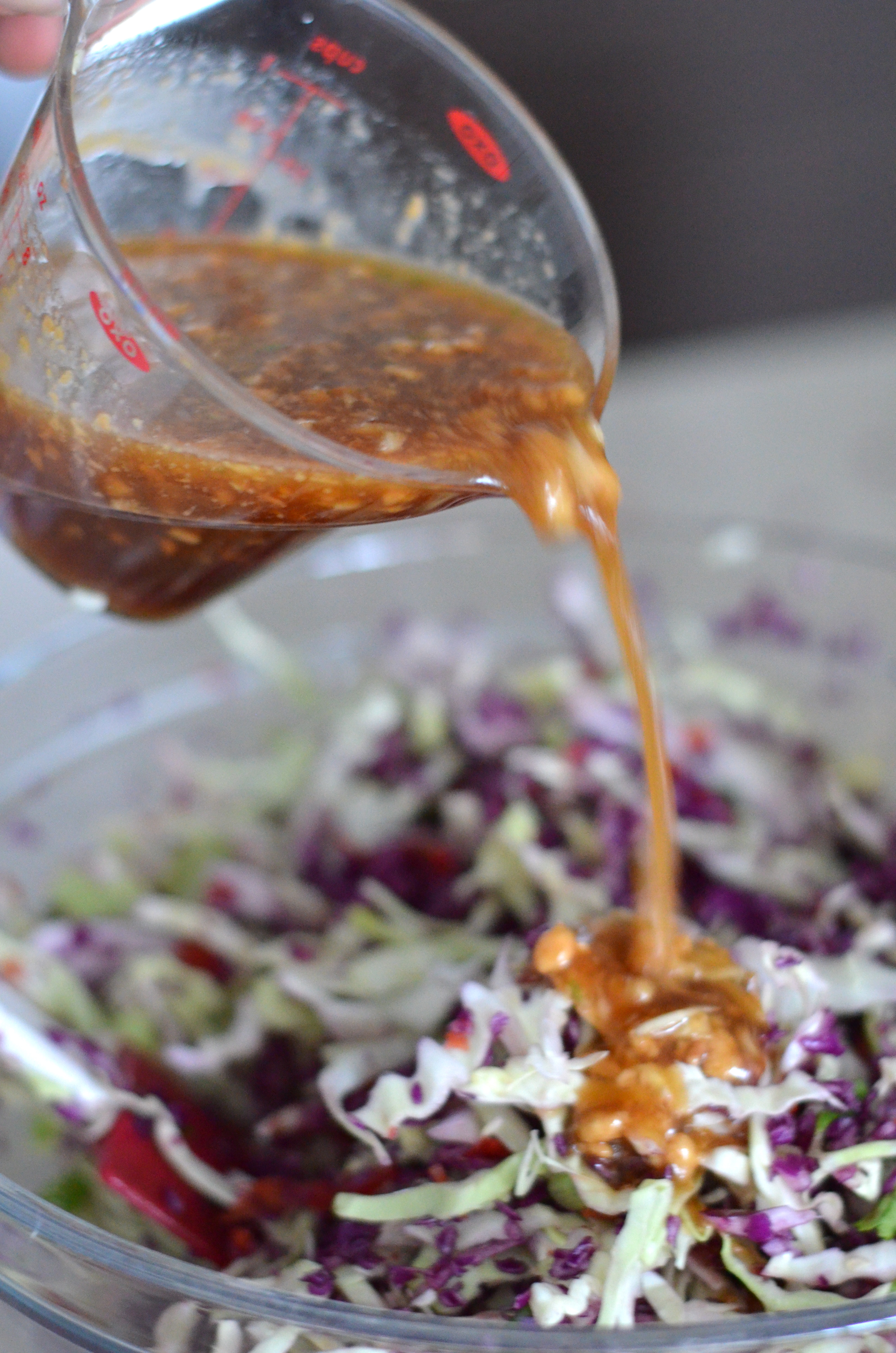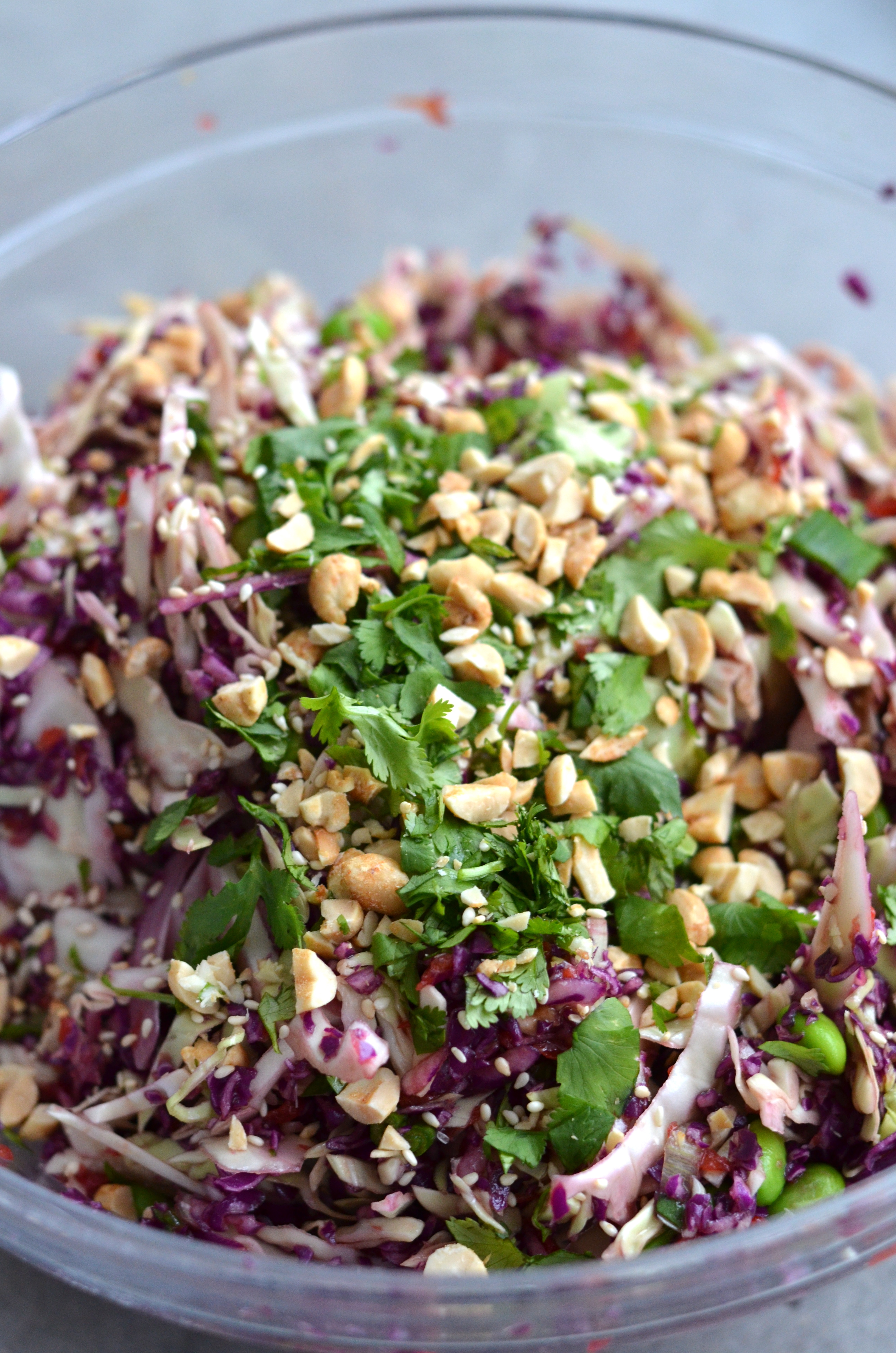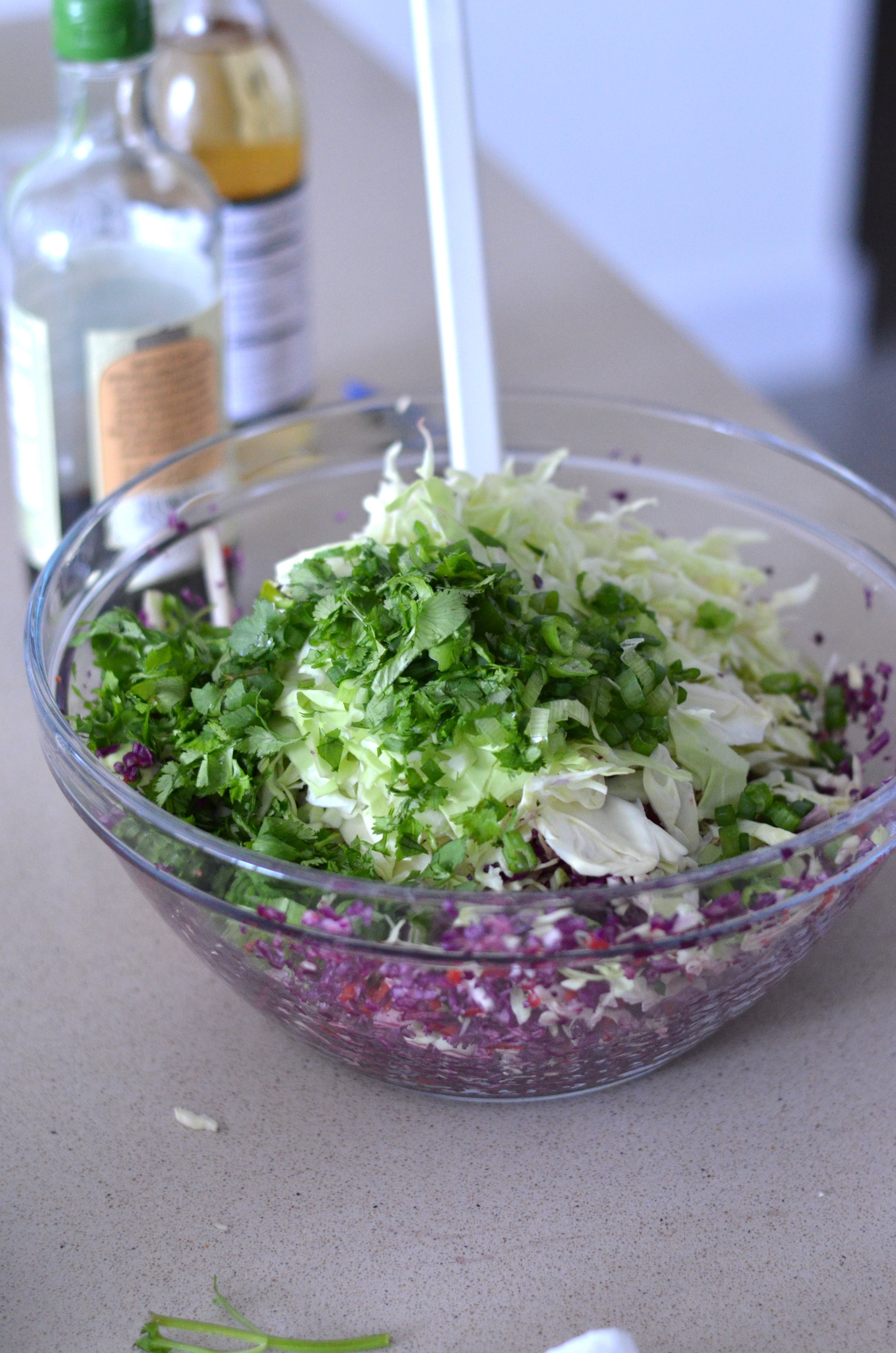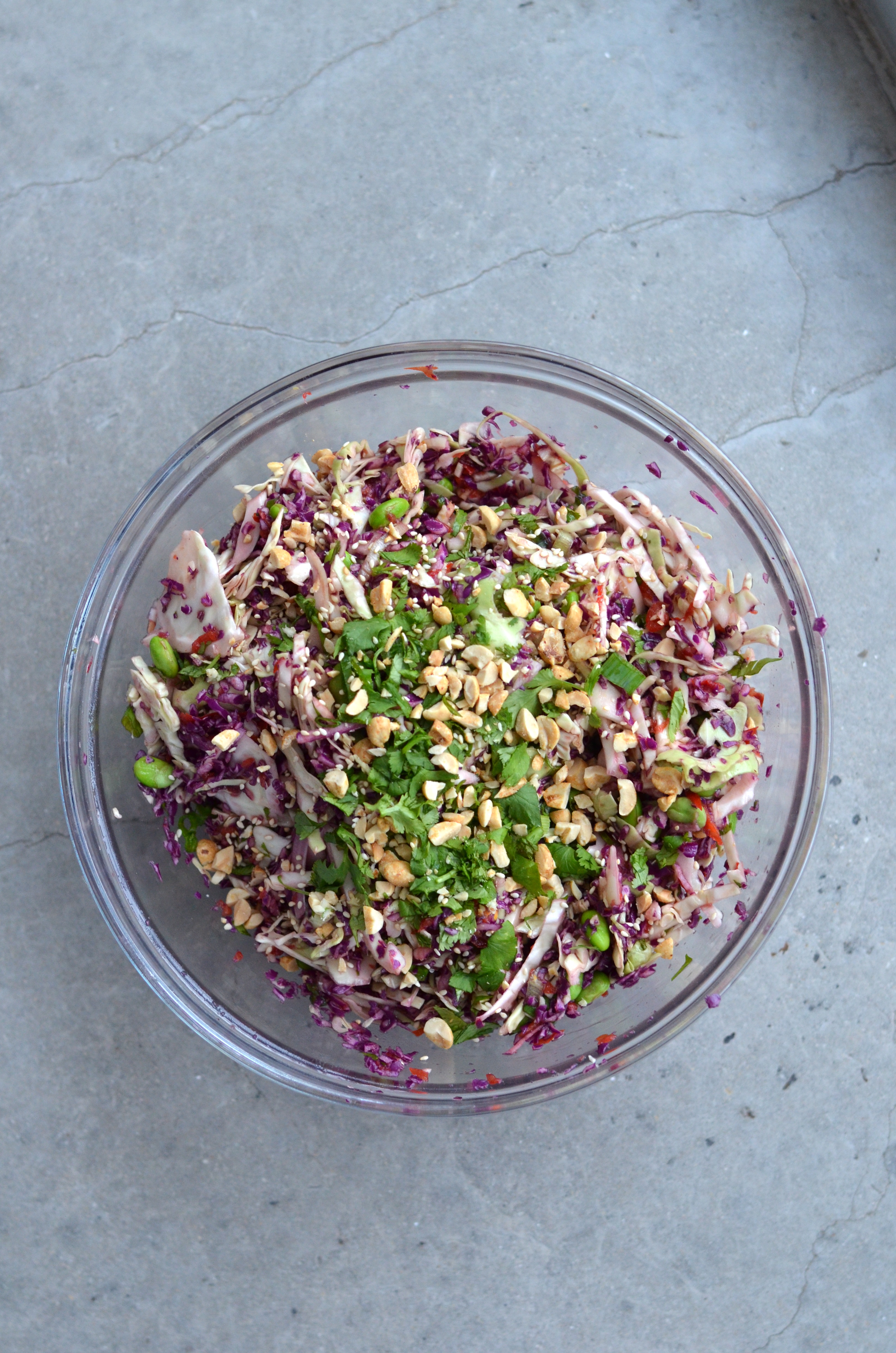 Combine all the veggies for the slaw. Mix well and add dressing. Try a couple bites to see if you need to add more salt/soy sauce. Stir until completely coated and serve with a sprinkle of cilantro, scallions, peanuts or sesame seeds.