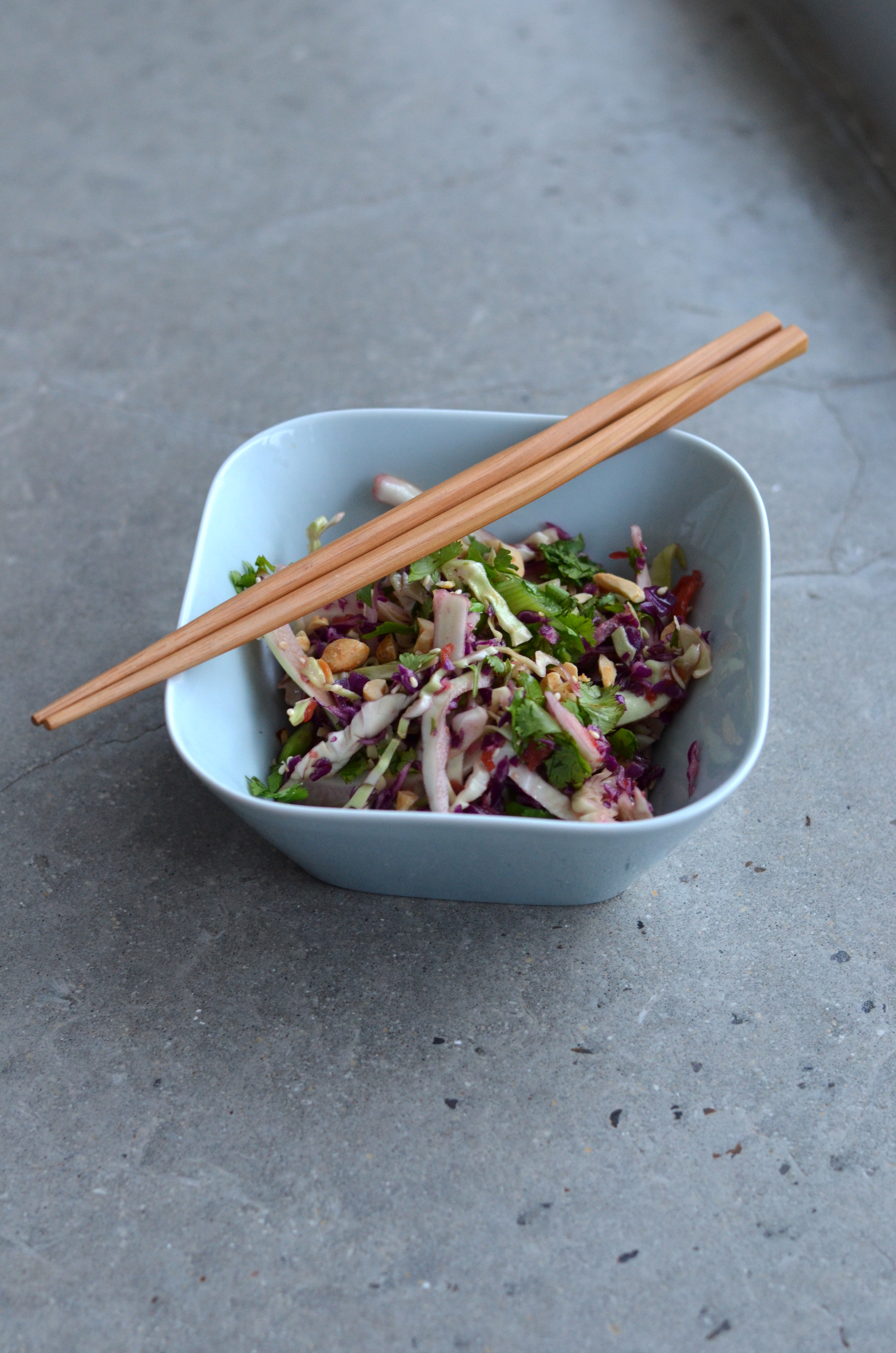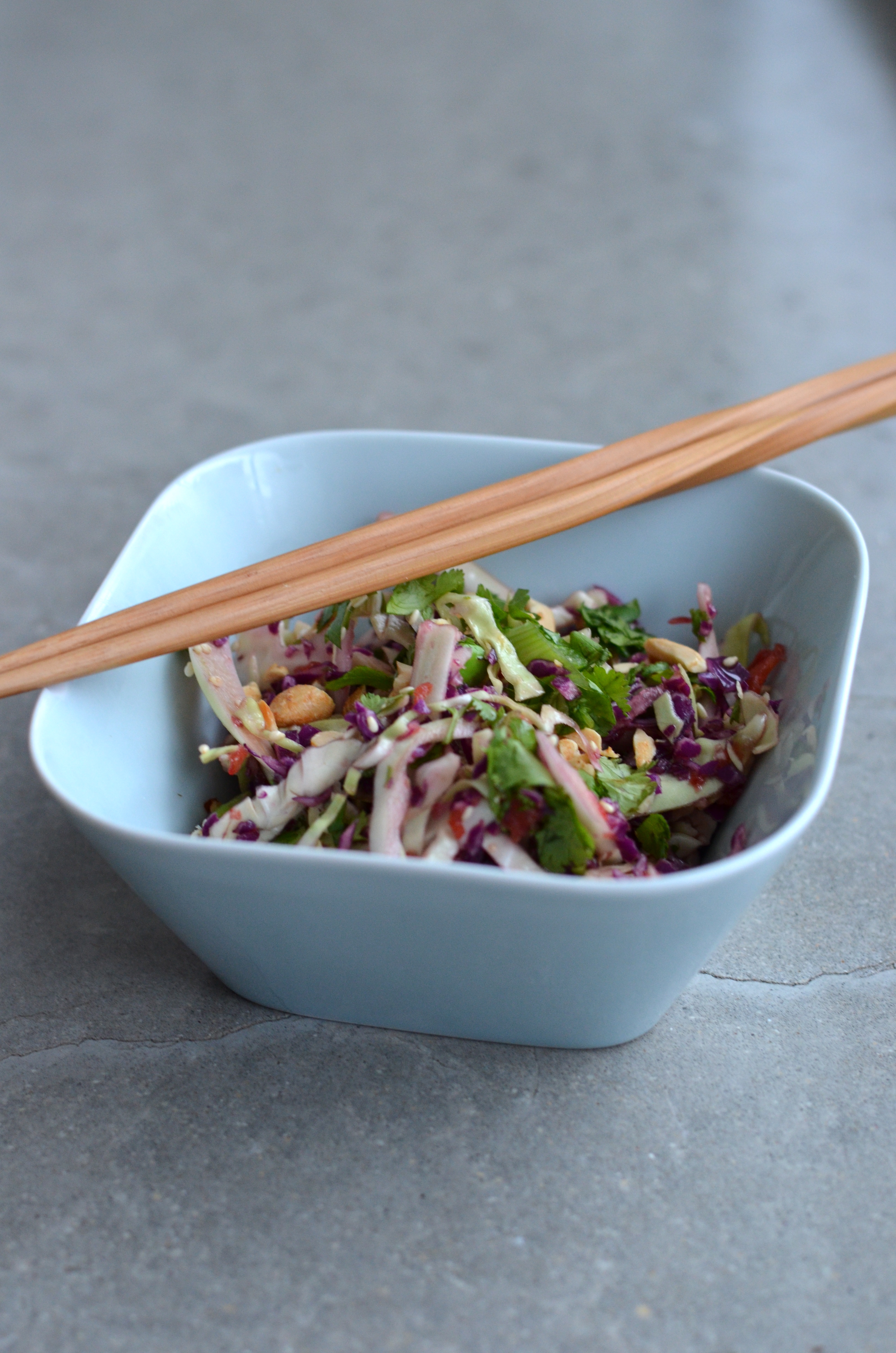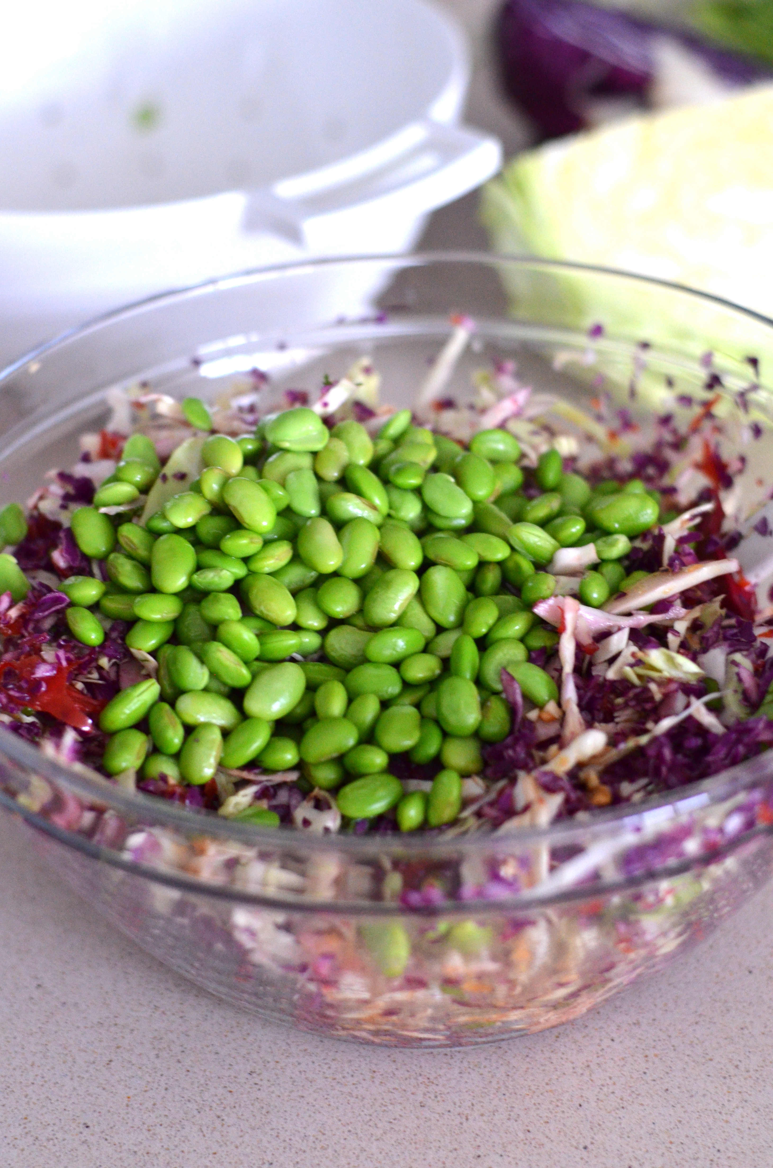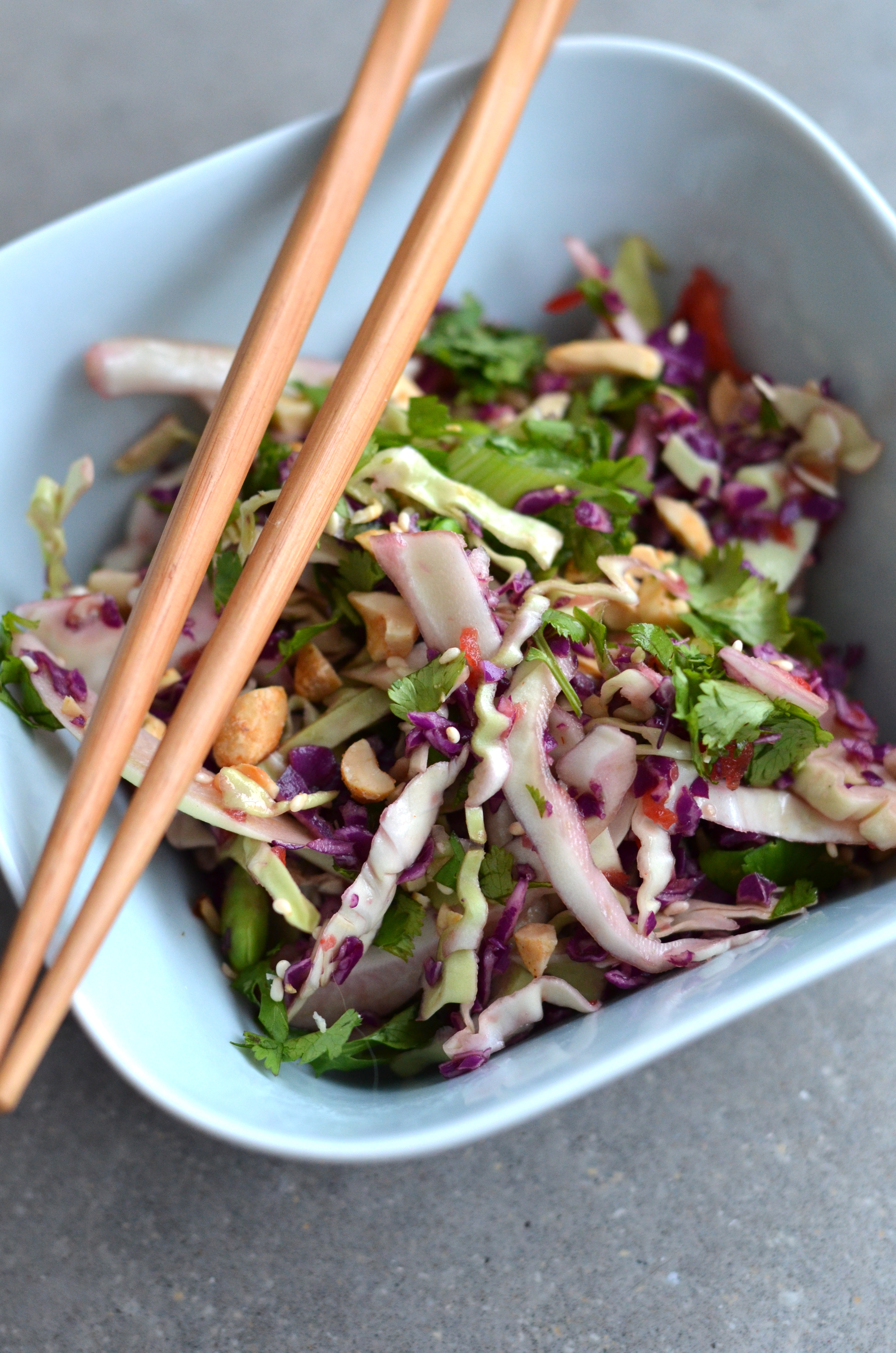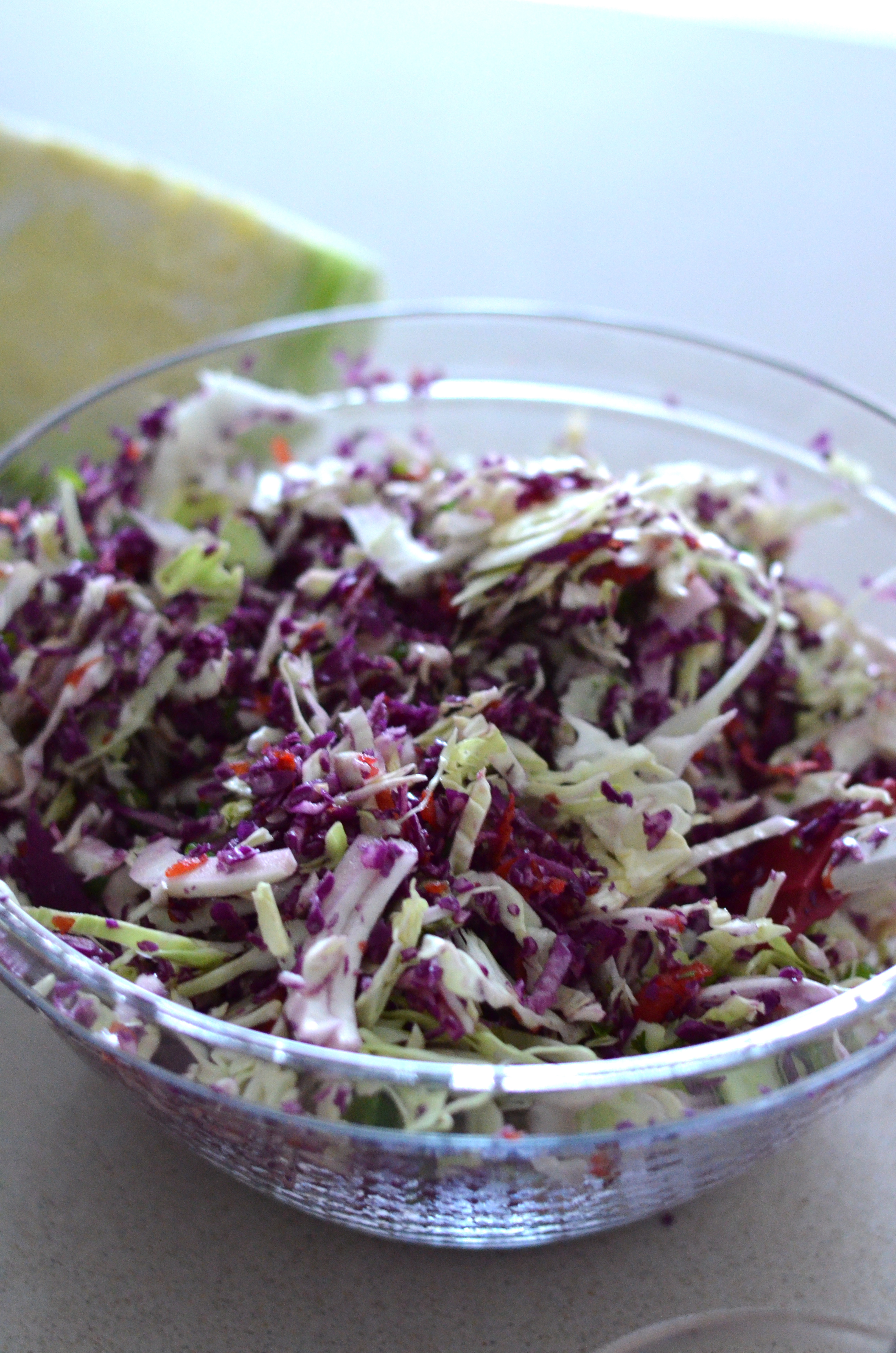 Combine all the veggies for the slaw. Mix well and add dressing. Try a couple bites to see if you need to add more salt/soy sauce. Stir until completely coated and serve with a sprinkle of cilantro, scallions, peanuts or sesame seeds.