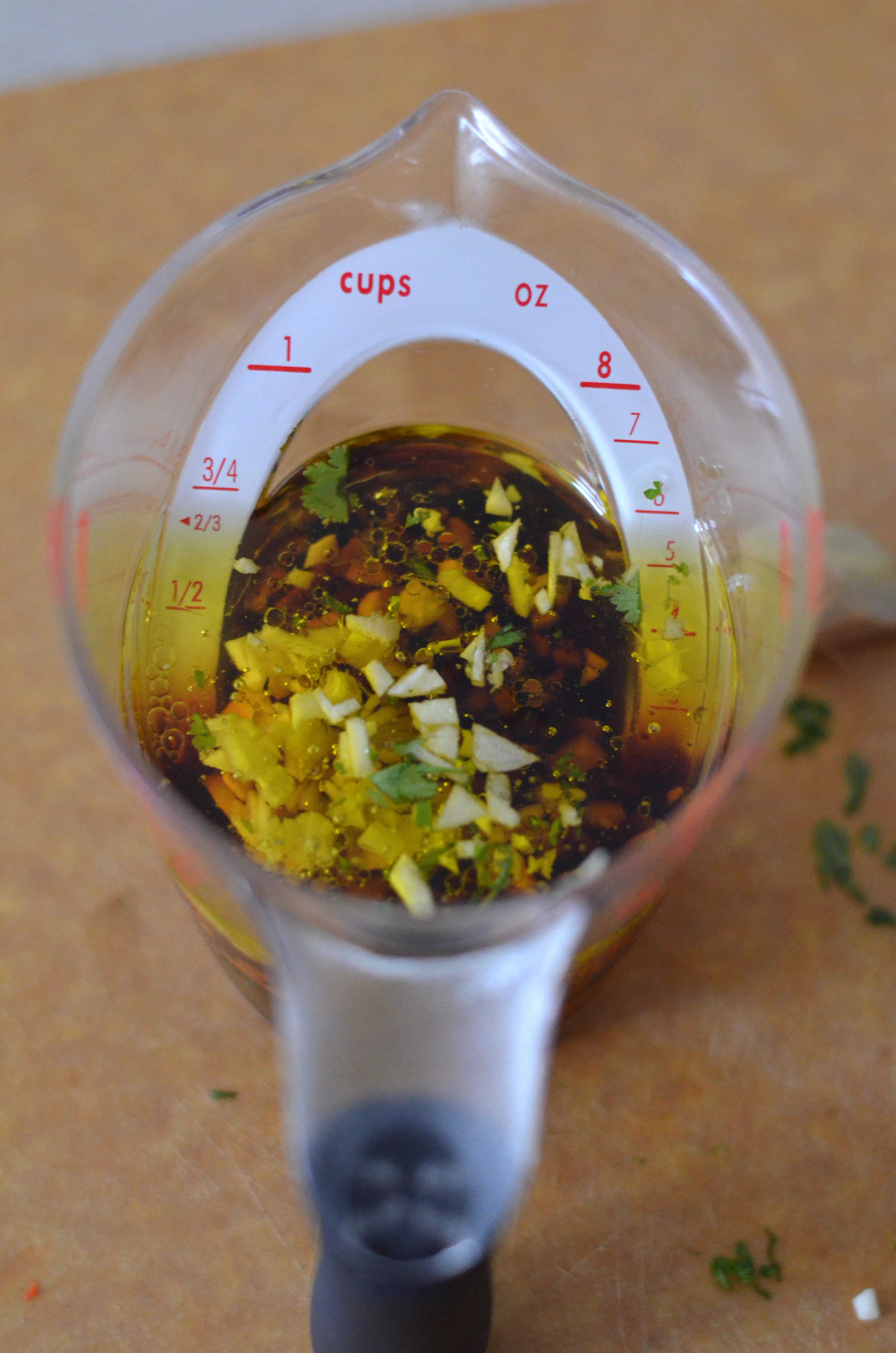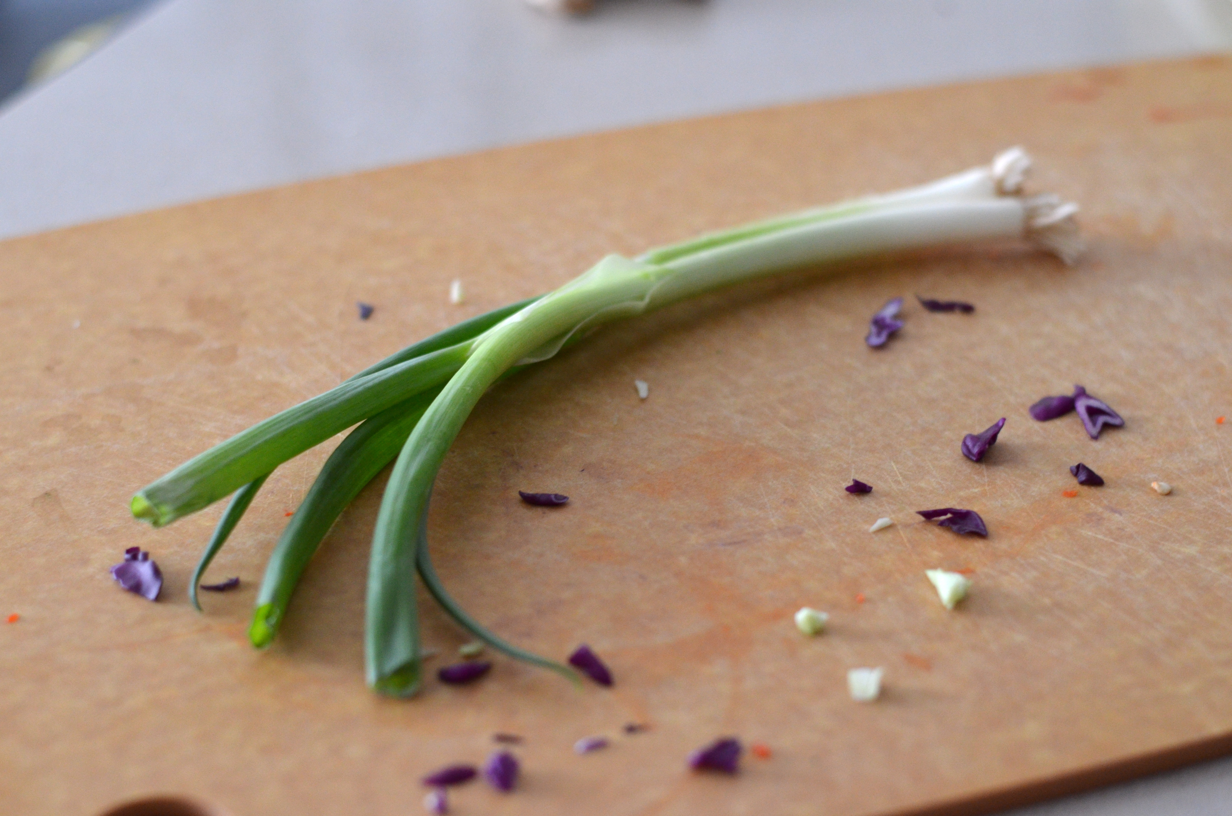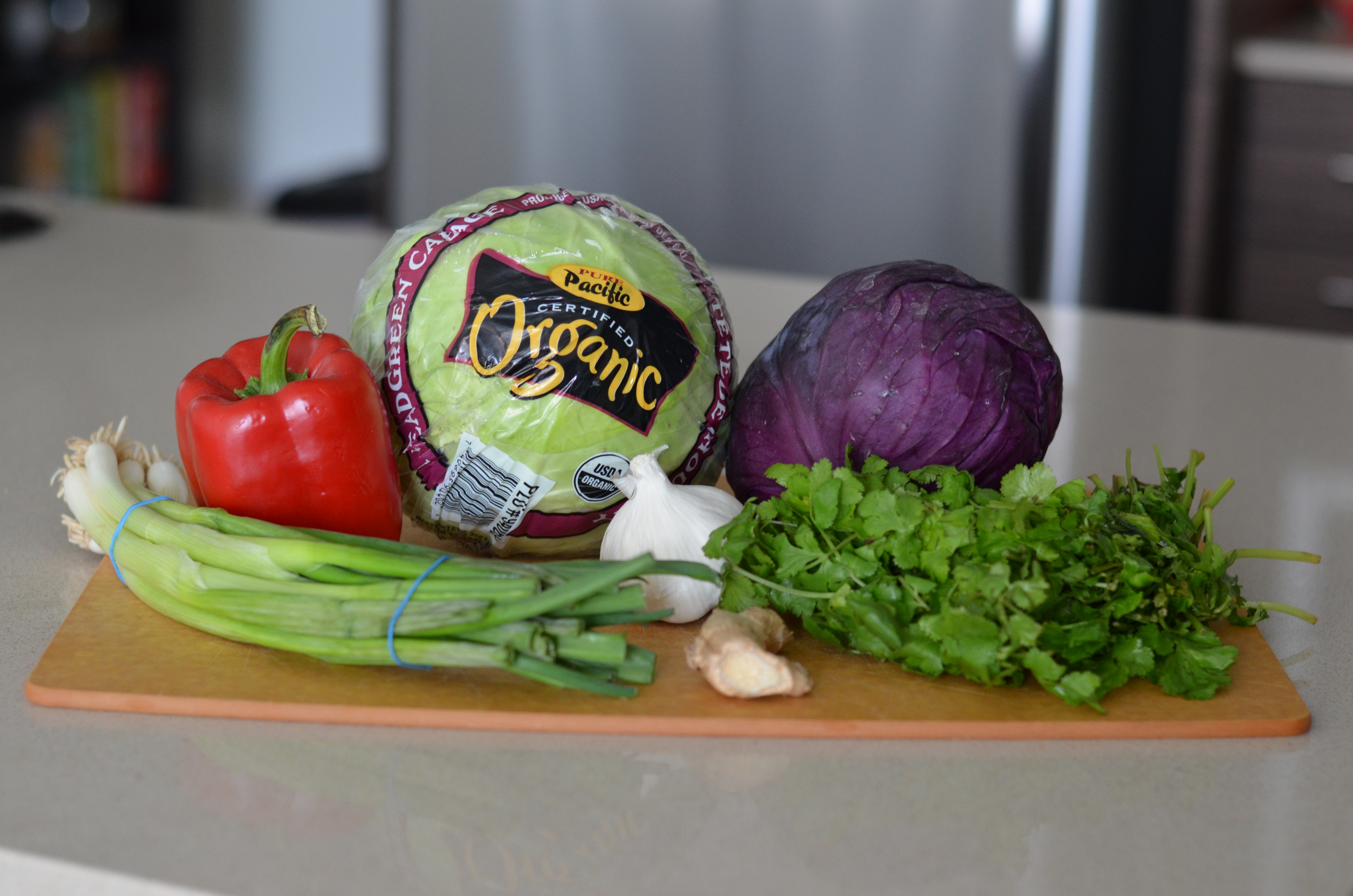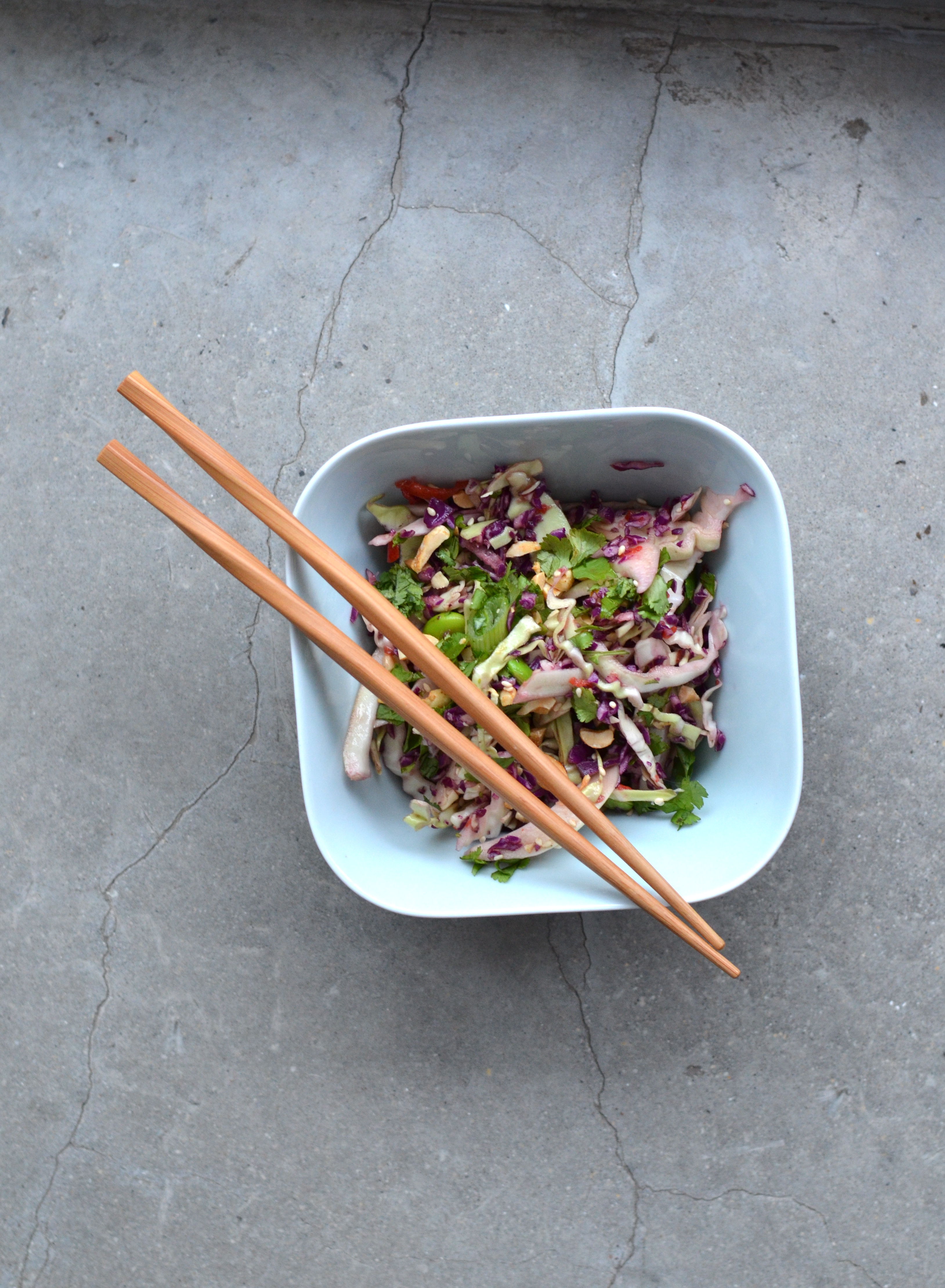 Combine all the veggies for the slaw. Mix well and add dressing. Try a couple bites to see if you need to add more salt/soy sauce. Stir until completely coated and serve with a sprinkle of cilantro, scallions, peanuts or sesame seeds.