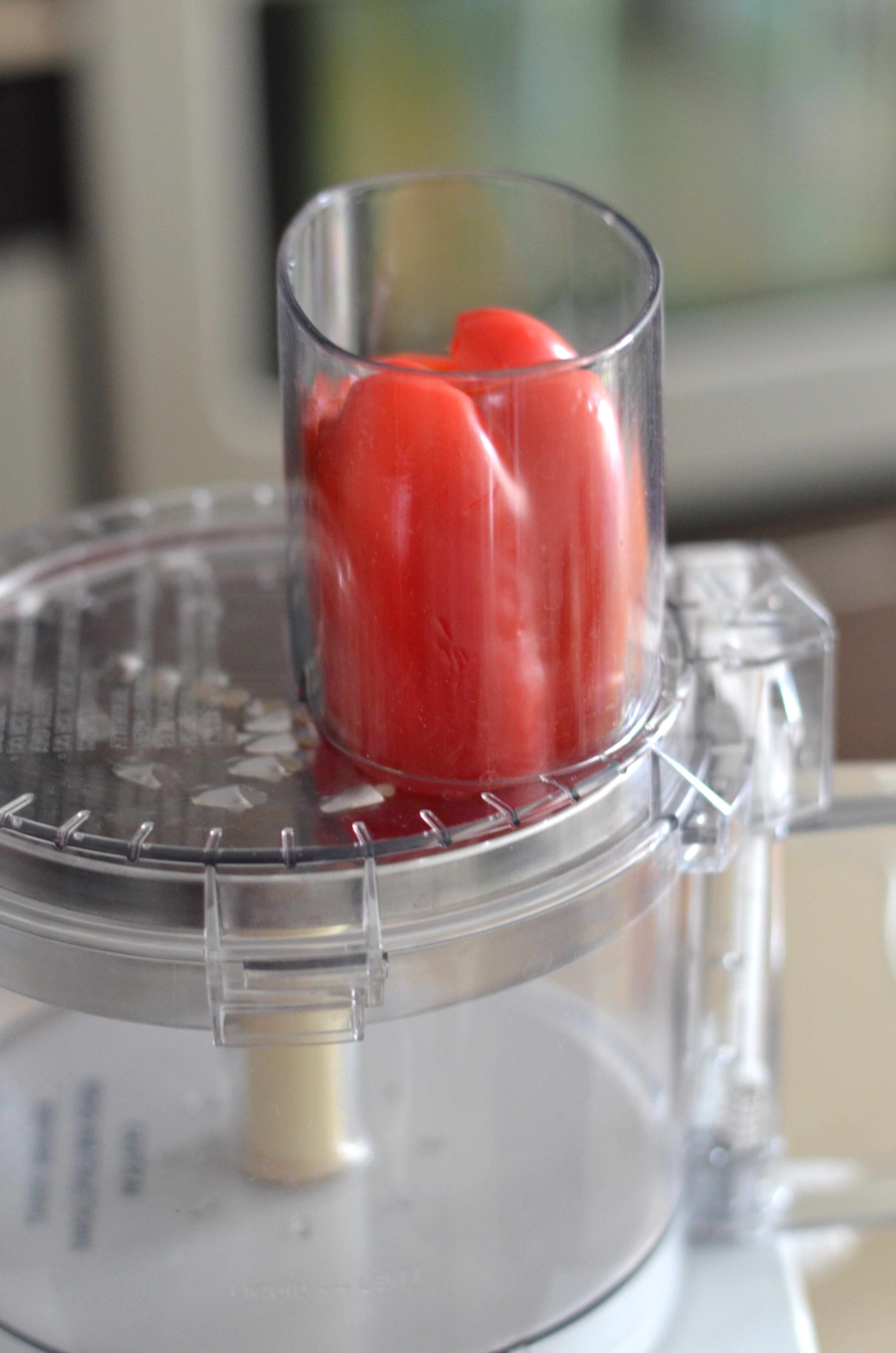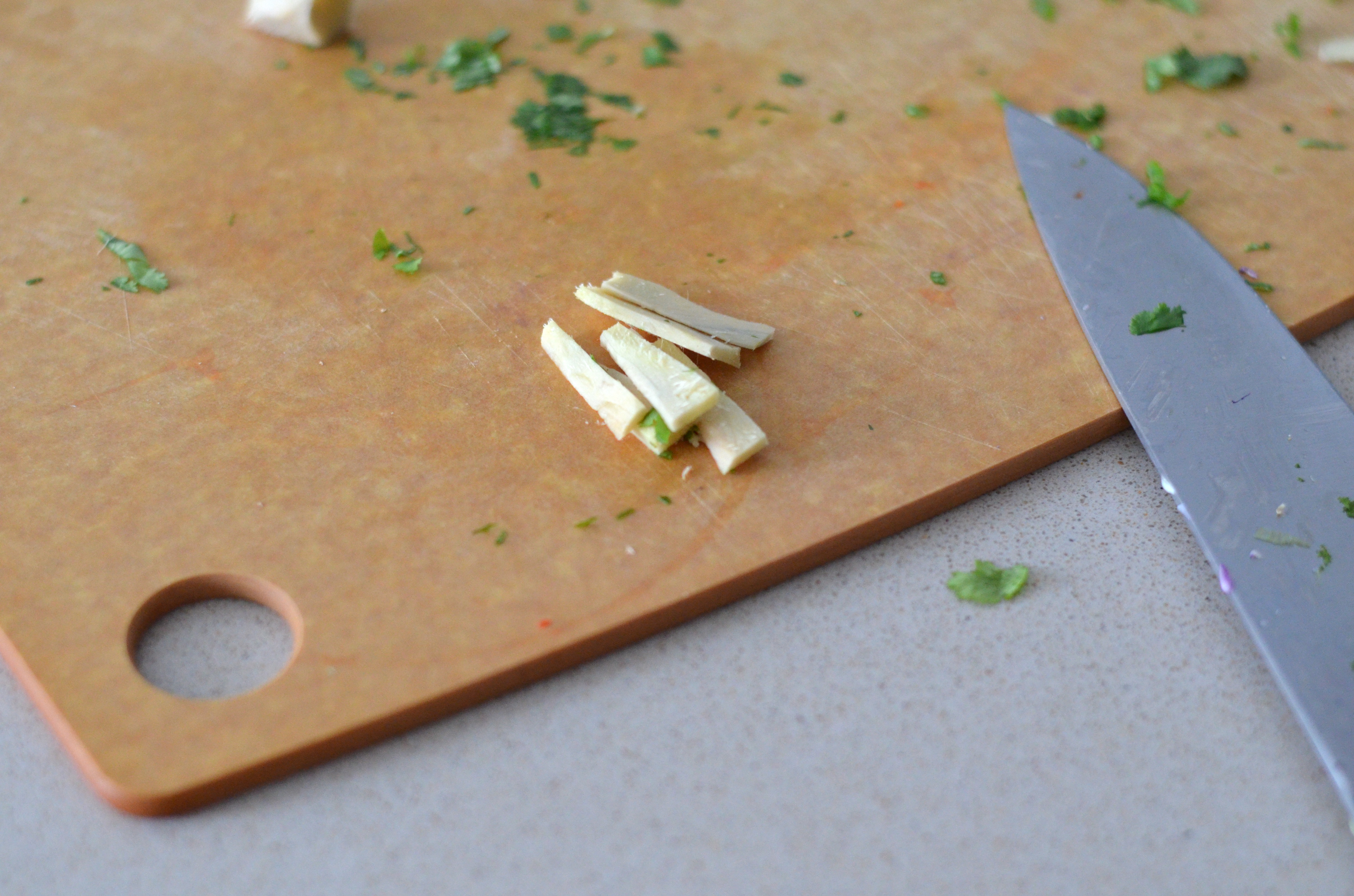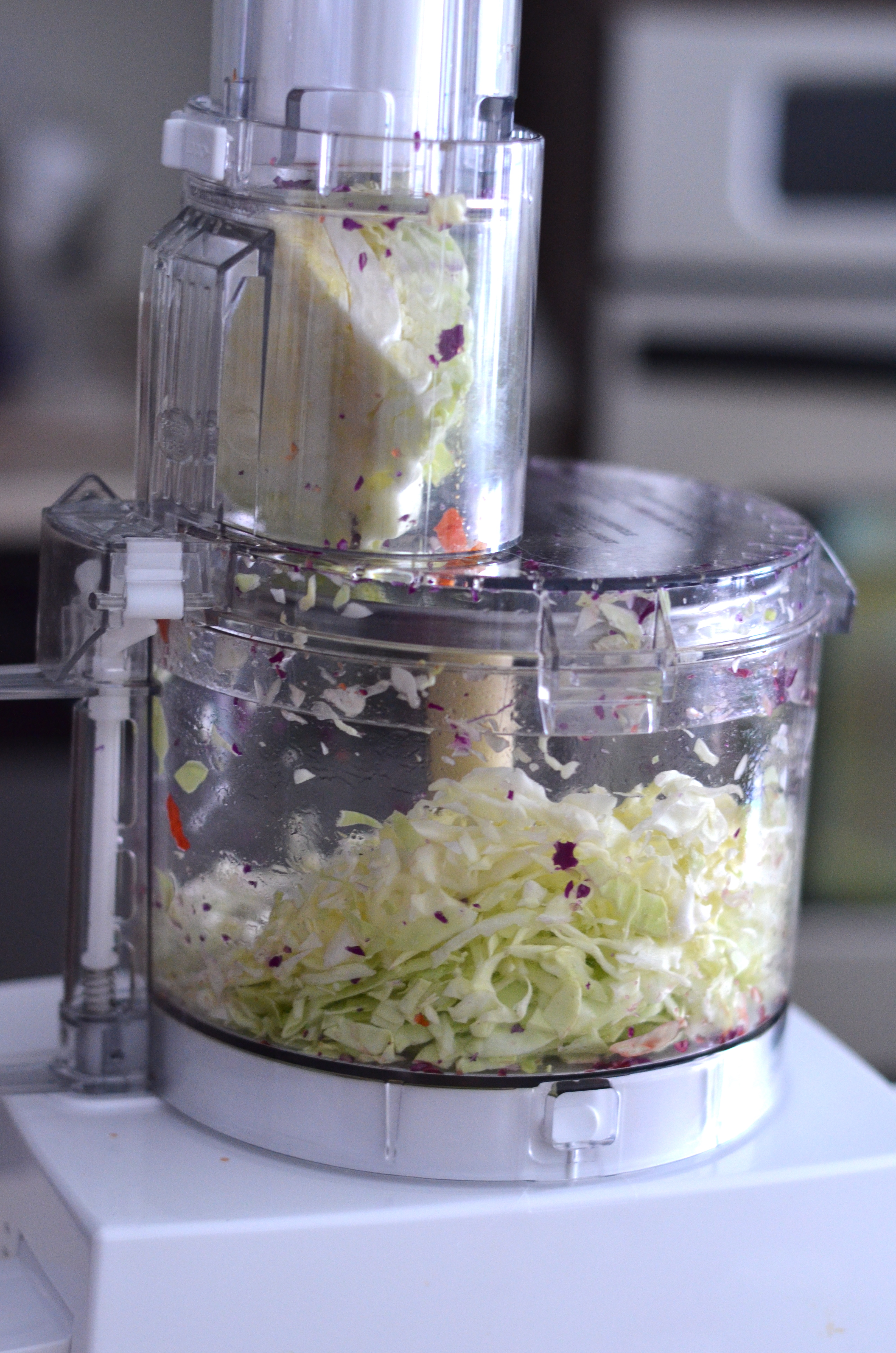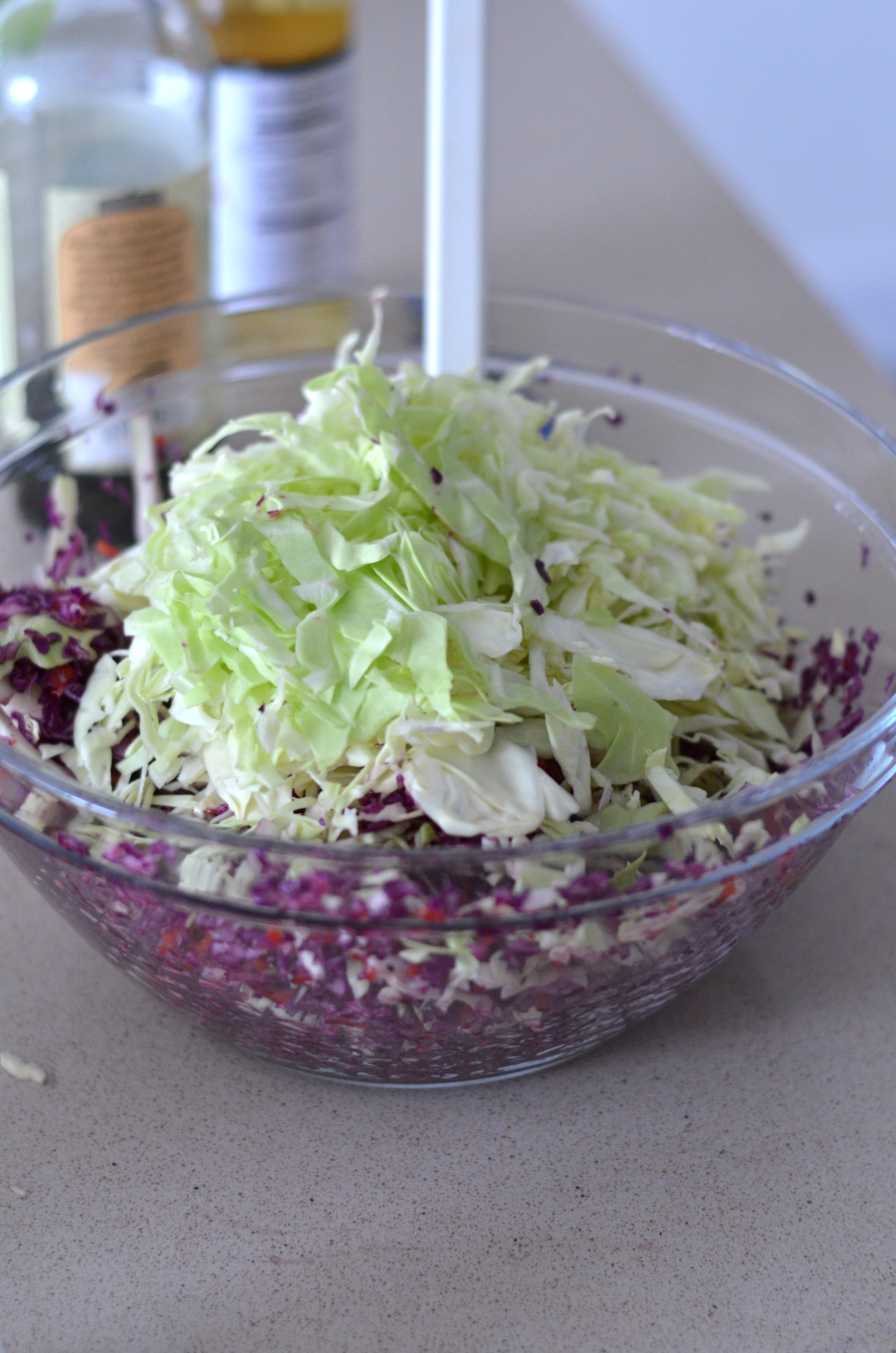 For the slaw, Begin by slicing the cabbage, carrots and red pepper by hand or with a food processor.